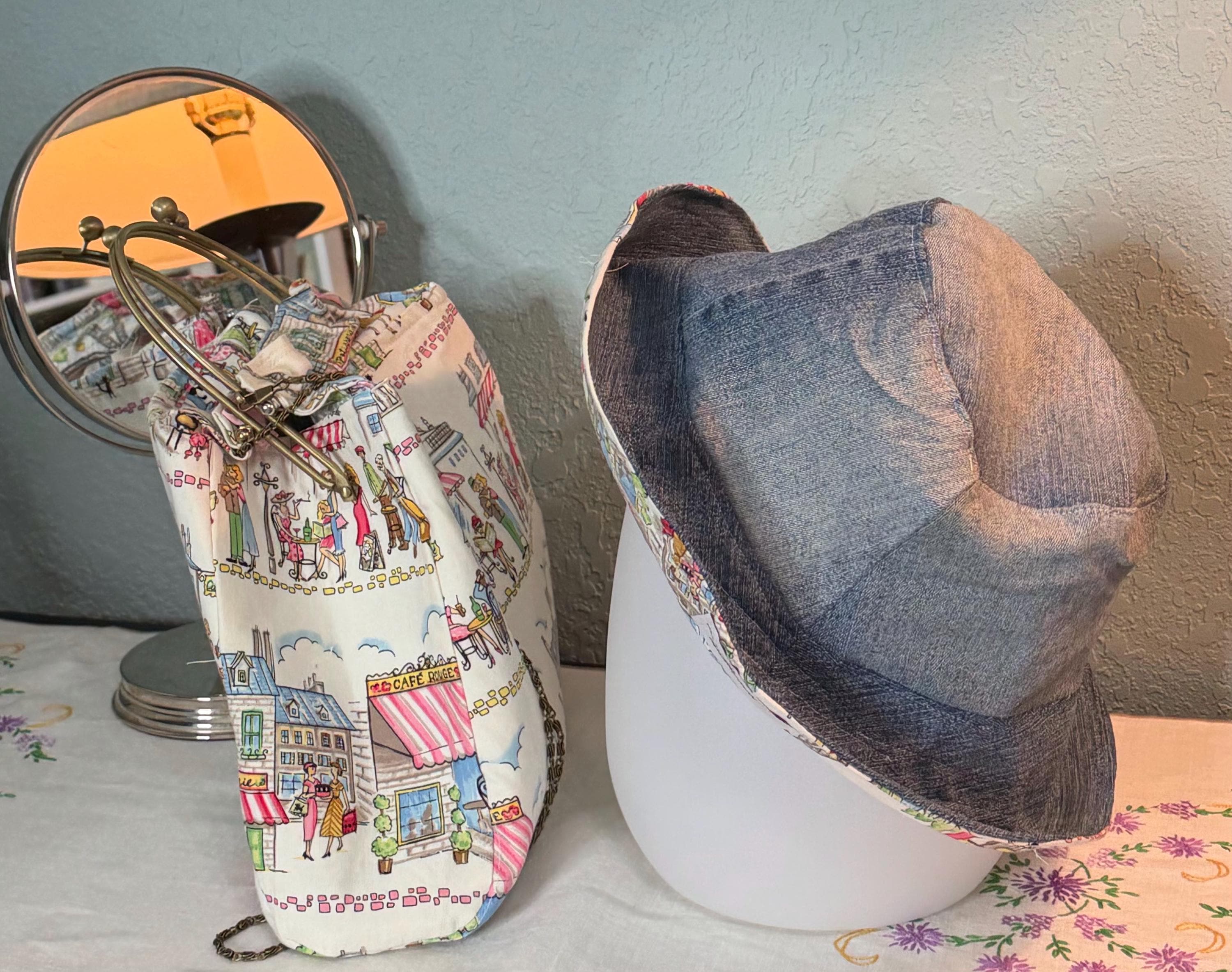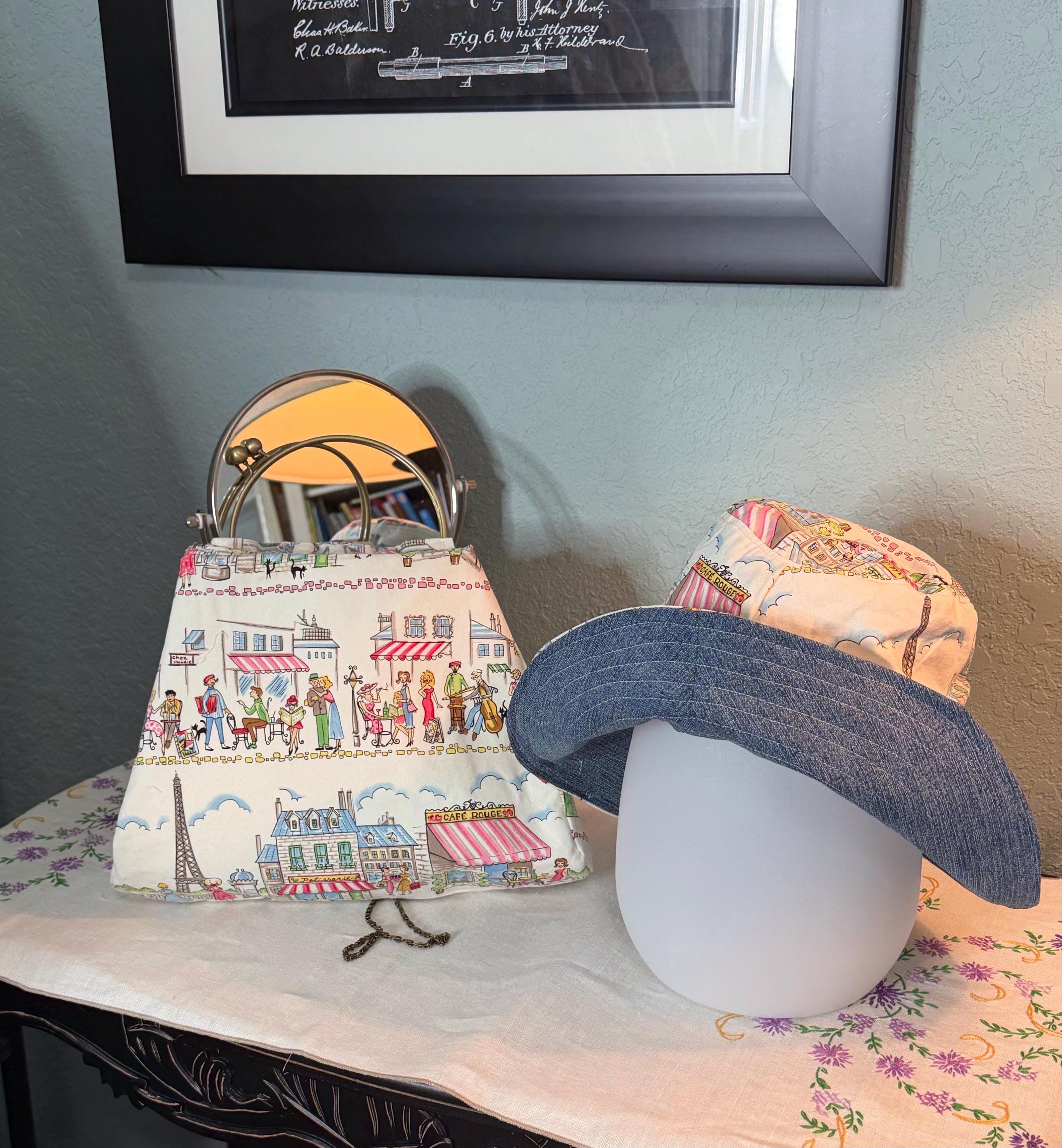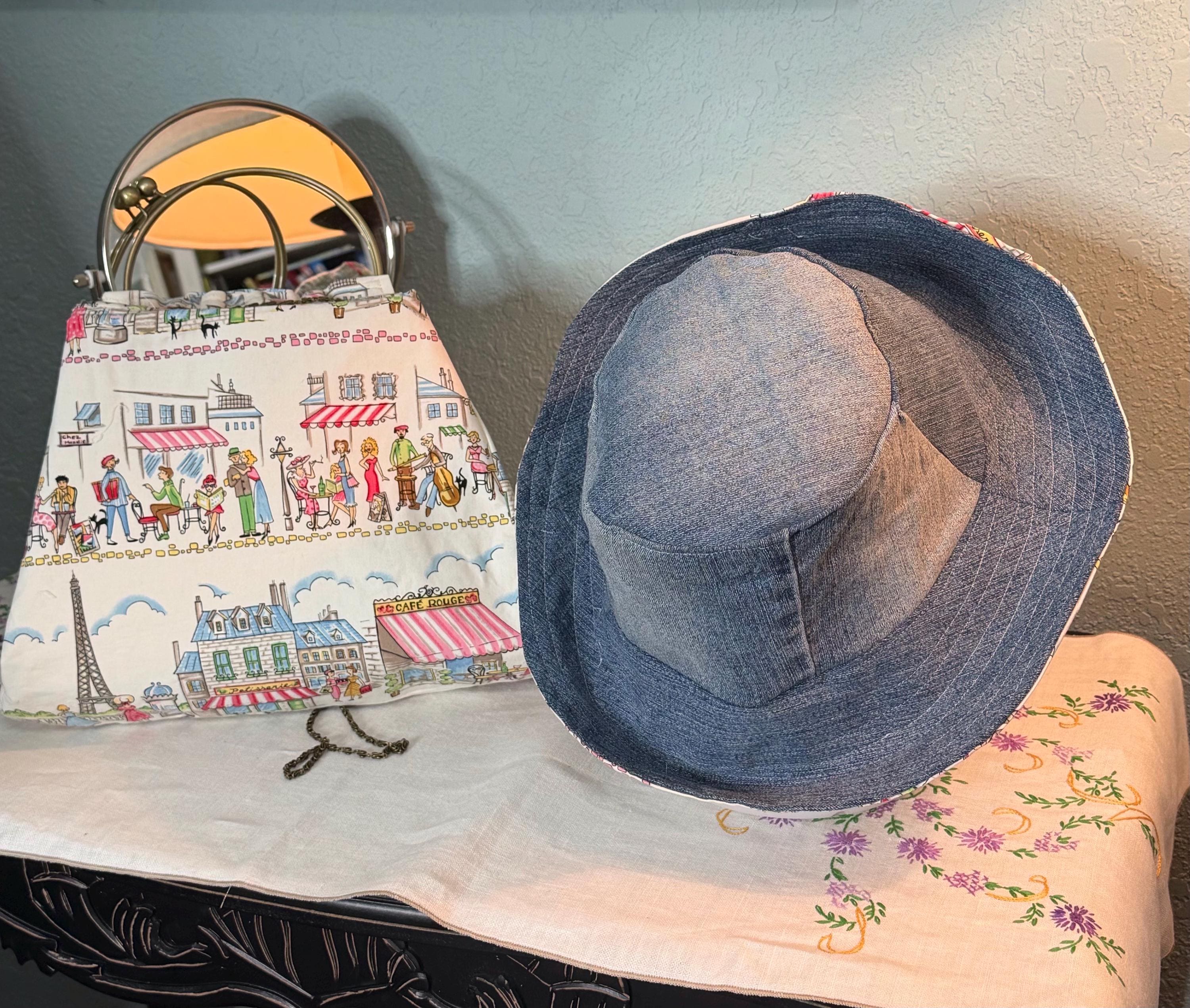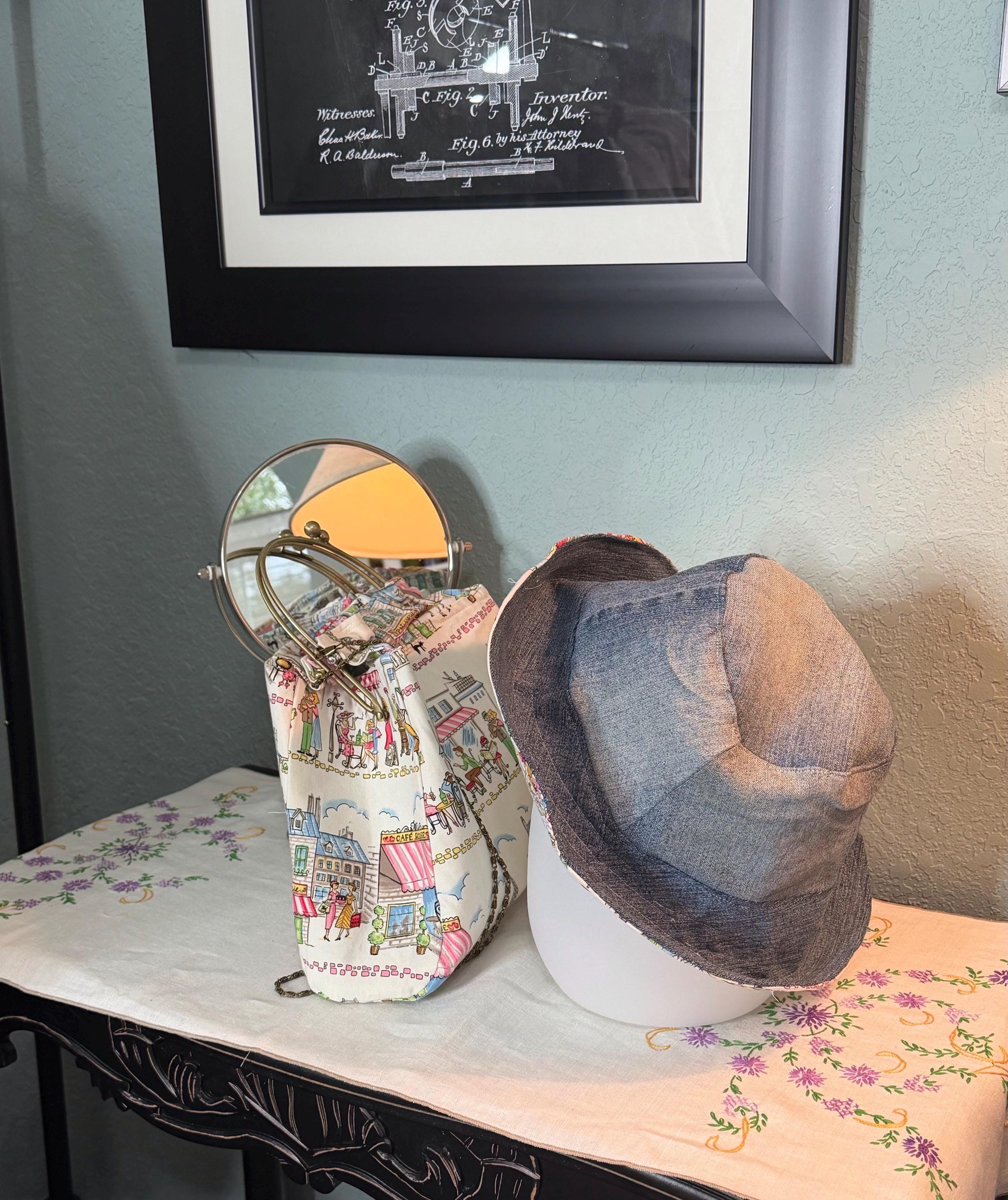 This beautiful bucket hat and framed purse set is one of a kind perfect. The fabric purse has a bronze colored kiss lock round metal frame. The bucket hat is reversible with Paris and Eiffel Tower aqua print on one side and blue denim on the other, This hat will fit small to large comfortably. The purse was handmade by me using repurposed quilt cotton fabric. The metal frame has two rods with acorn nut screws on the ends so that you can use the same frame for multiple purses.