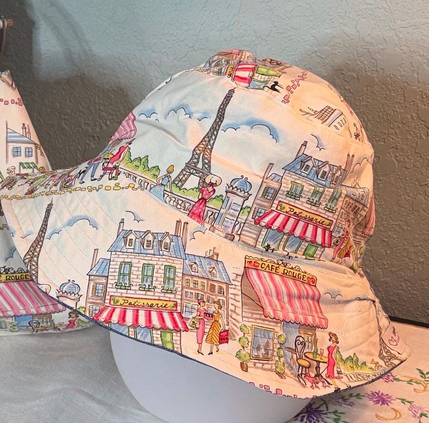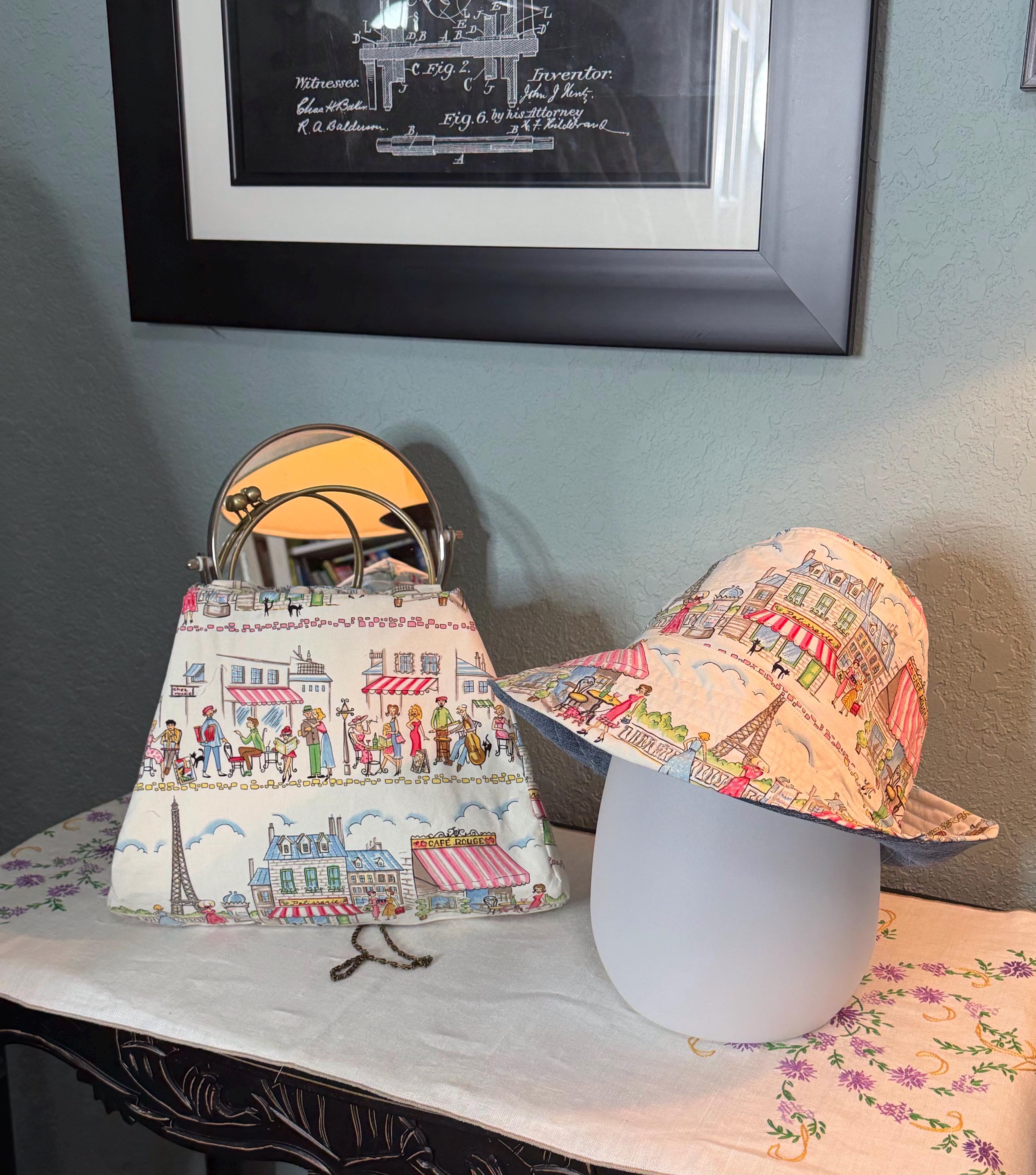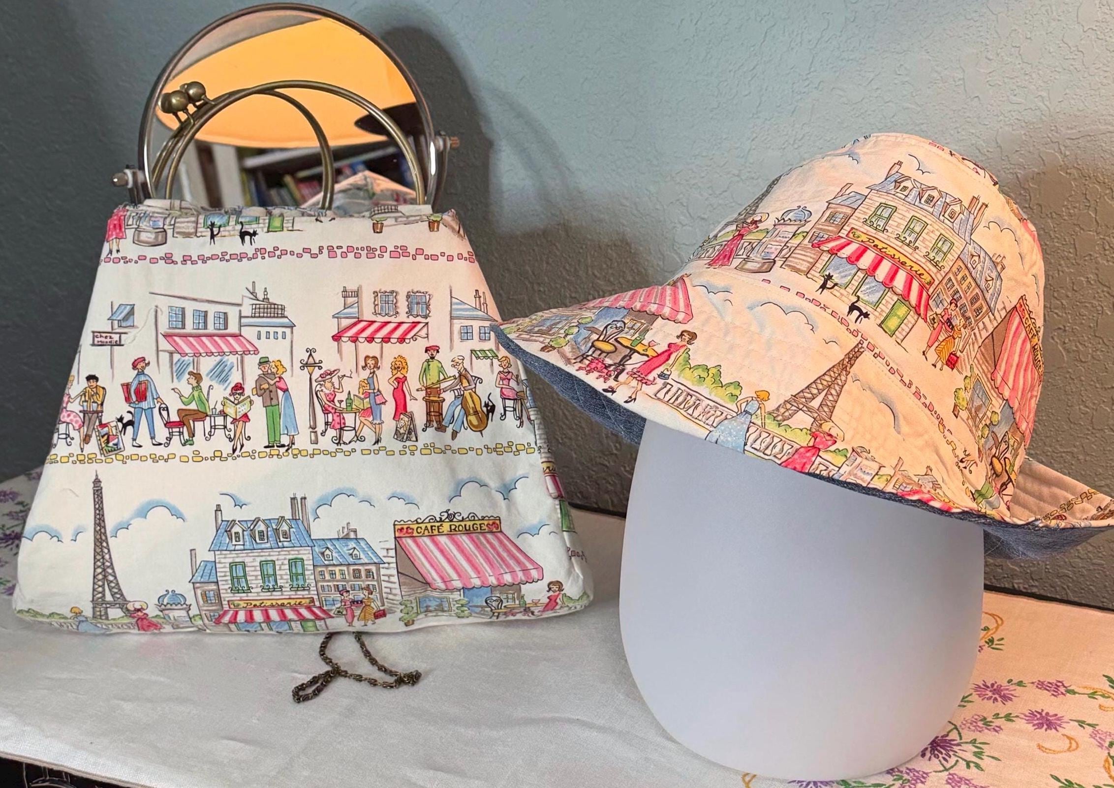 This beautiful bucket hat and framed purse set is one of a kind perfect. The fabric purse has a bronze colored kiss lock round metal frame. The bucket hat is reversible with Paris and Eiffel Tower aqua print on one side and blue denim on the other, This hat will fit small to large comfortably. The purse was handmade by me using repurposed quilt cotton fabric. The metal frame has two rods with acorn nut screws on the ends so that you can use the same frame for multiple purses.