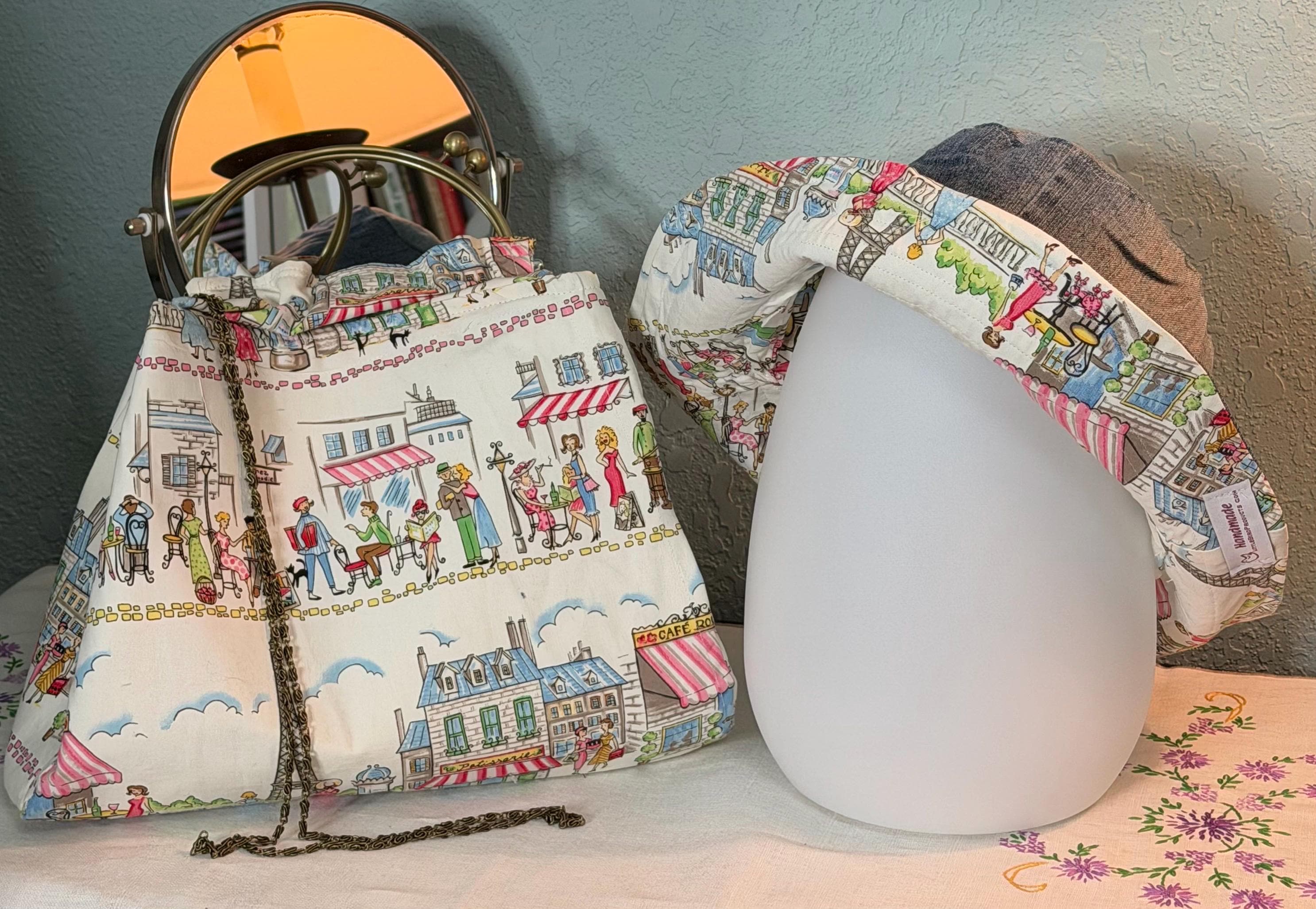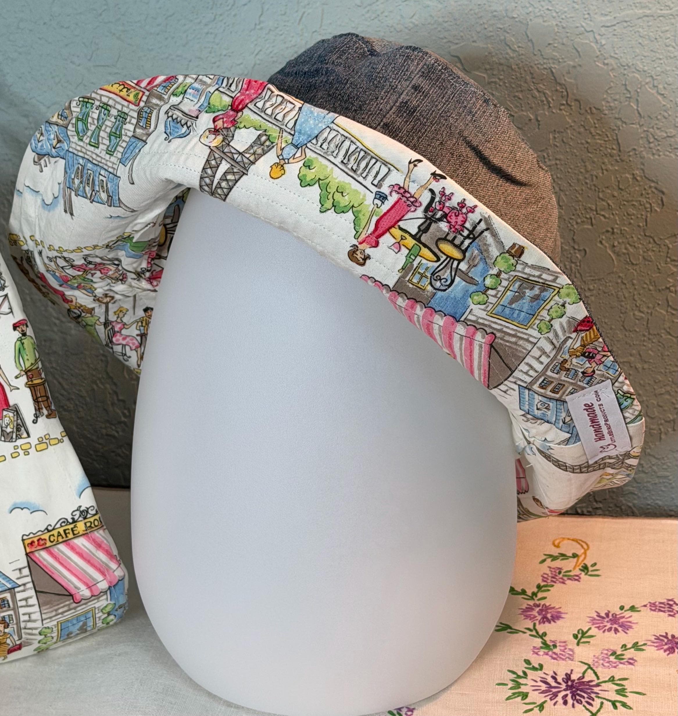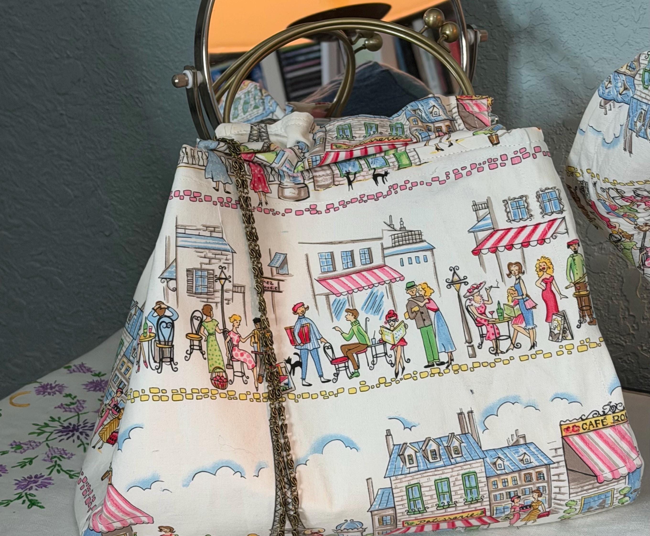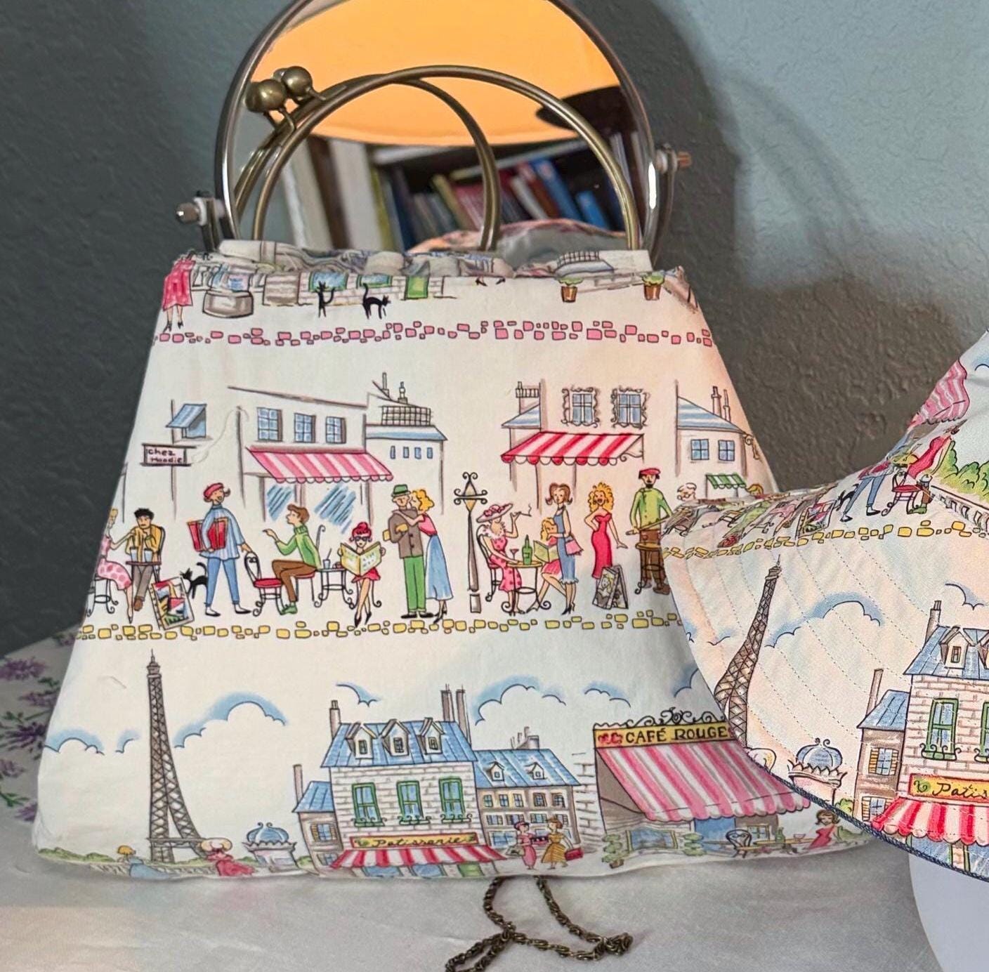 This beautiful bucket hat and framed purse set is one of a kind perfect. The fabric purse has a bronze colored kiss lock round metal frame. The bucket hat is reversible with Paris and Eiffel Tower aqua print on one side and blue denim on the other, This hat will fit small to large comfortably. The purse was handmade by me using repurposed quilt cotton fabric. The metal frame has two rods with acorn nut screws on the ends so that you can use the same frame for multiple purses.
