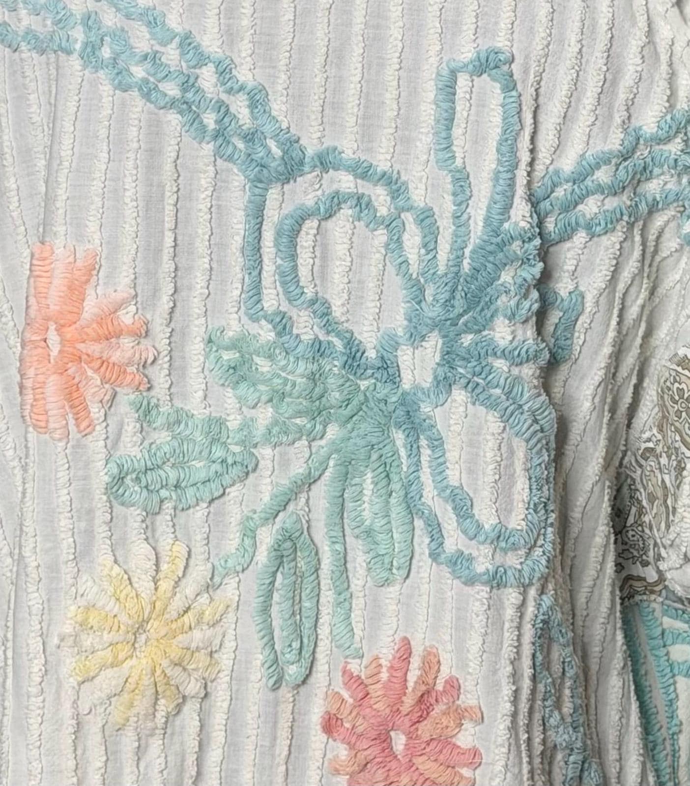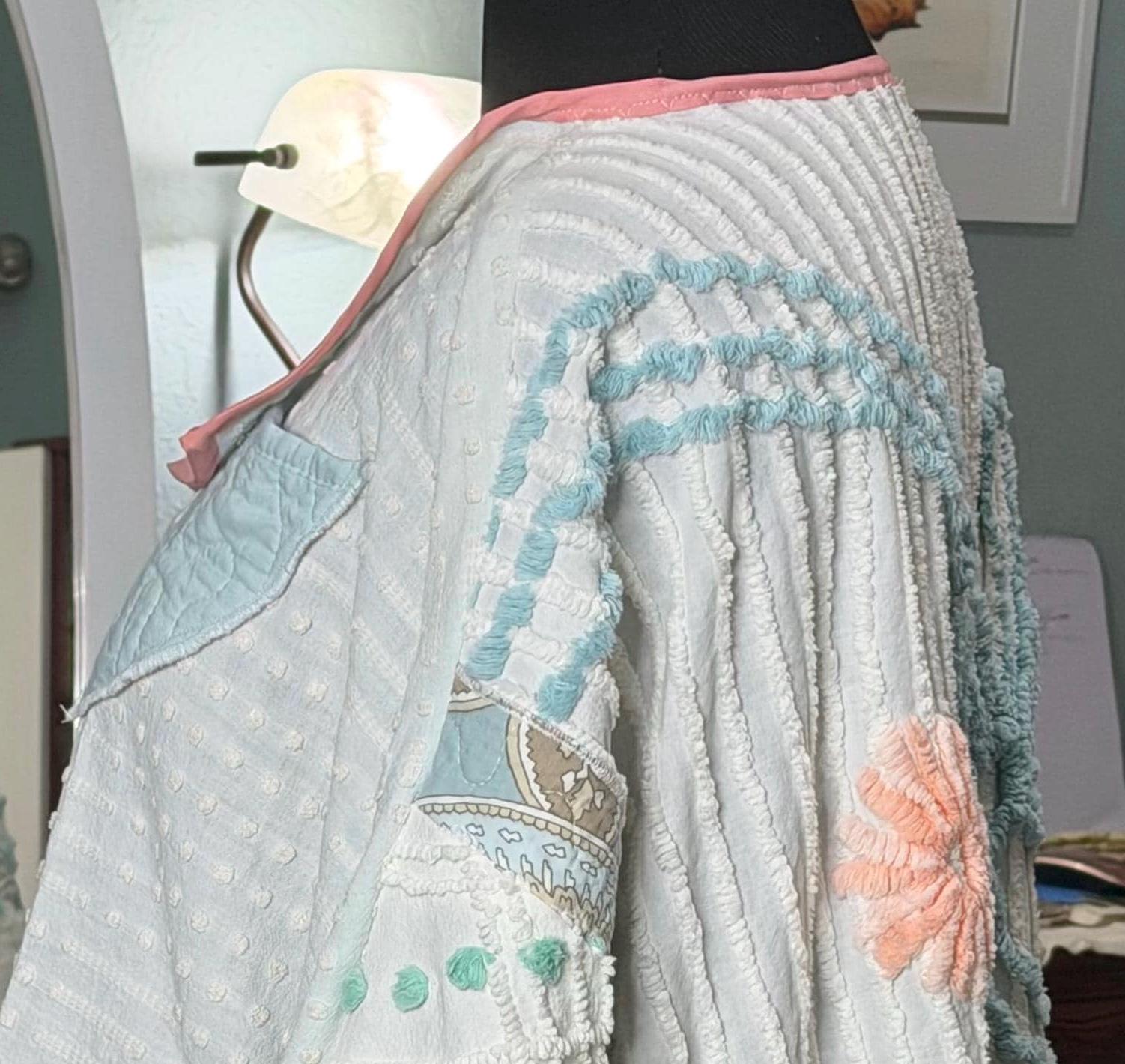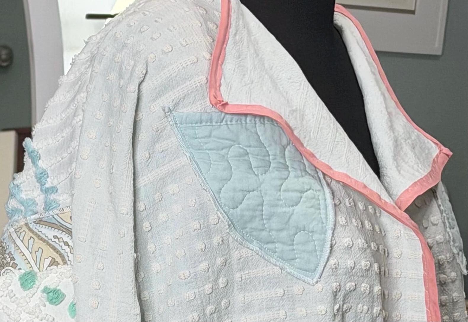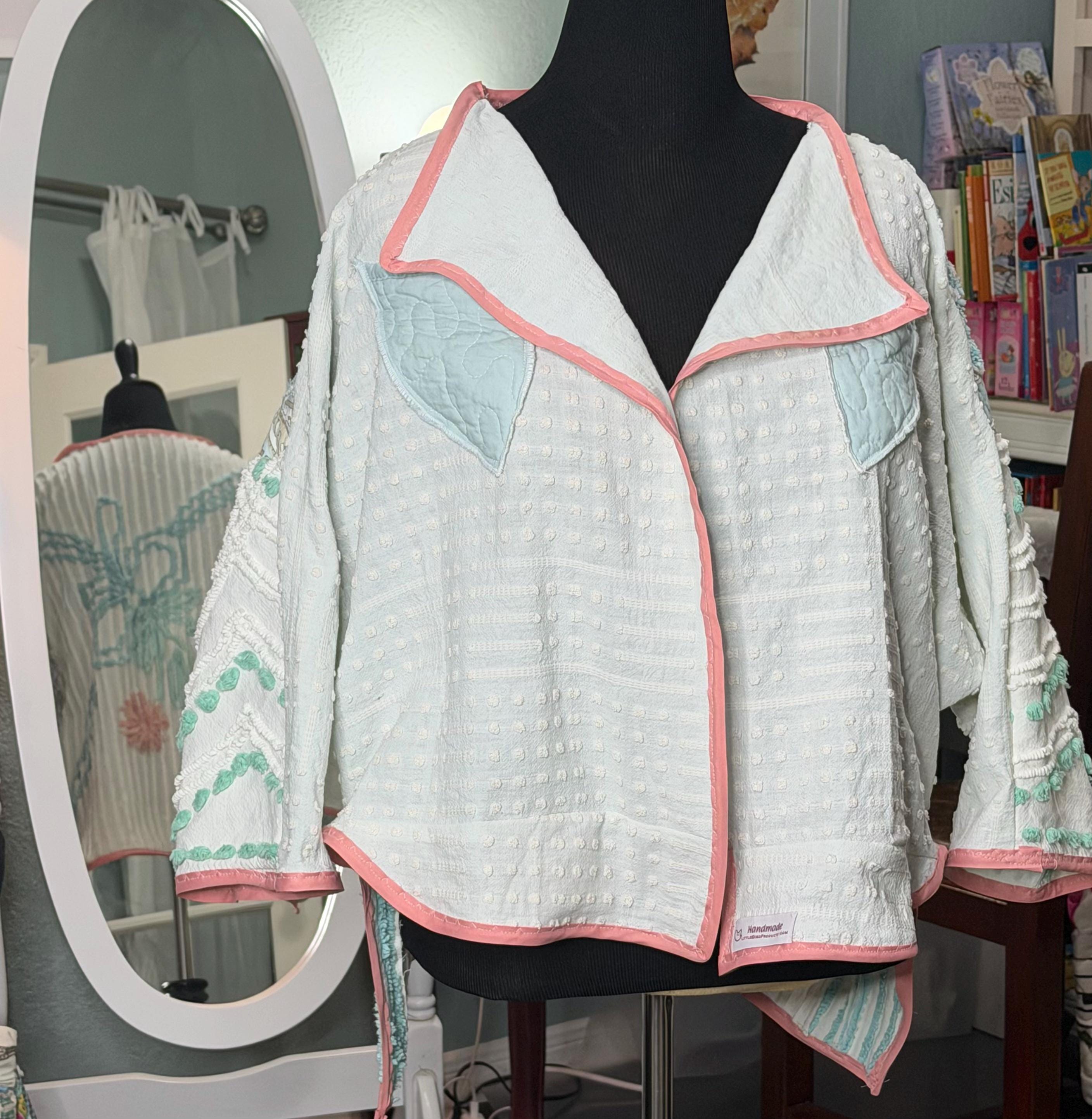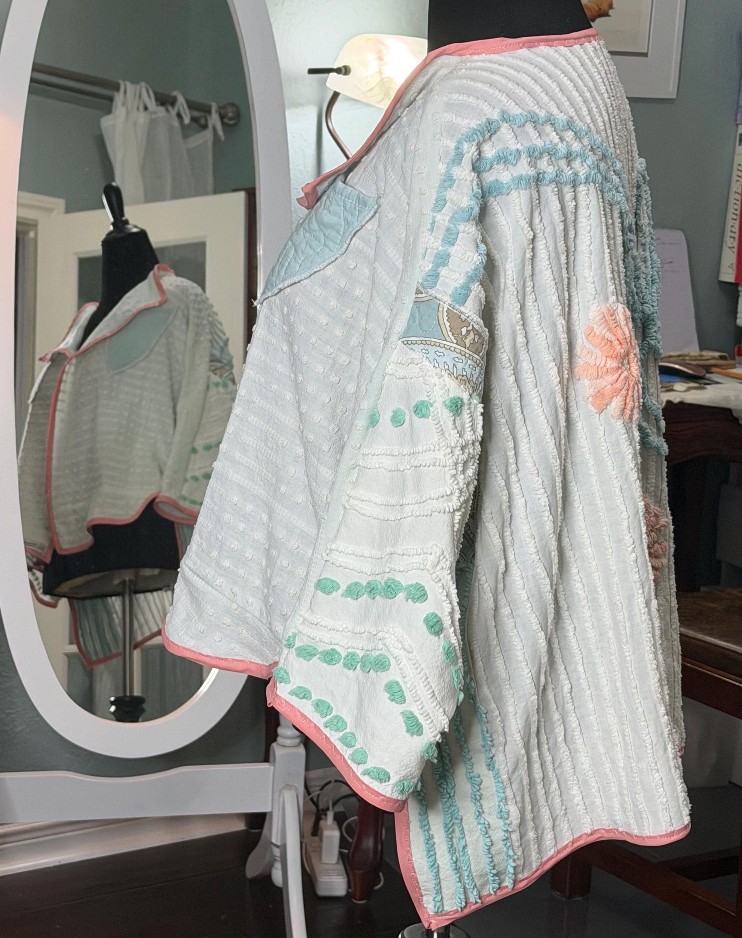 This easy fitting short kimono jacket is a must have for your wardrobe. It was made using a collage of beautiful pieces of vintage chenille. The white vintage chenille has a flower motif in peach and yellow with aqua on the center back. This chenille had served its useful life as a bed spread and was fussy cut to make this one of a kind jacket. The jacket is soft and light and a has an easy fitting style. It has a small front ruffle hem and is trimmed with pink bias binding.