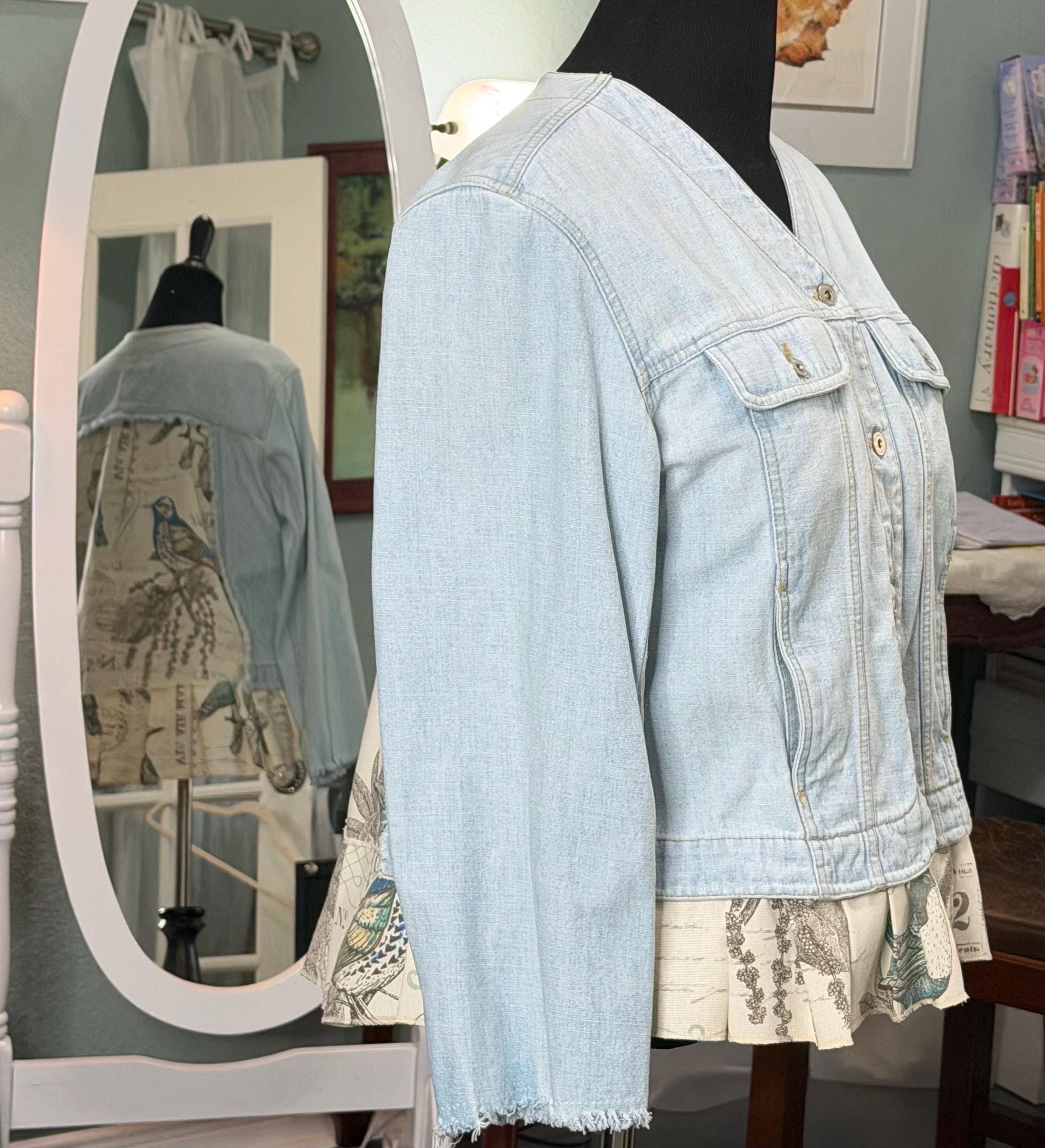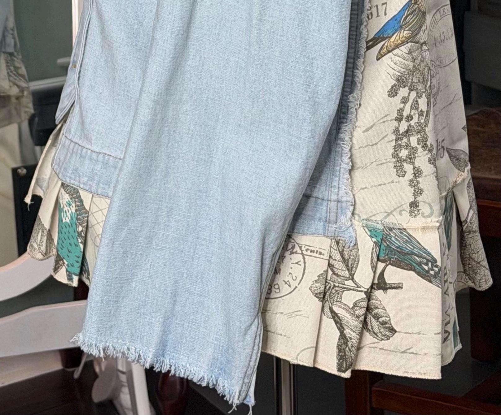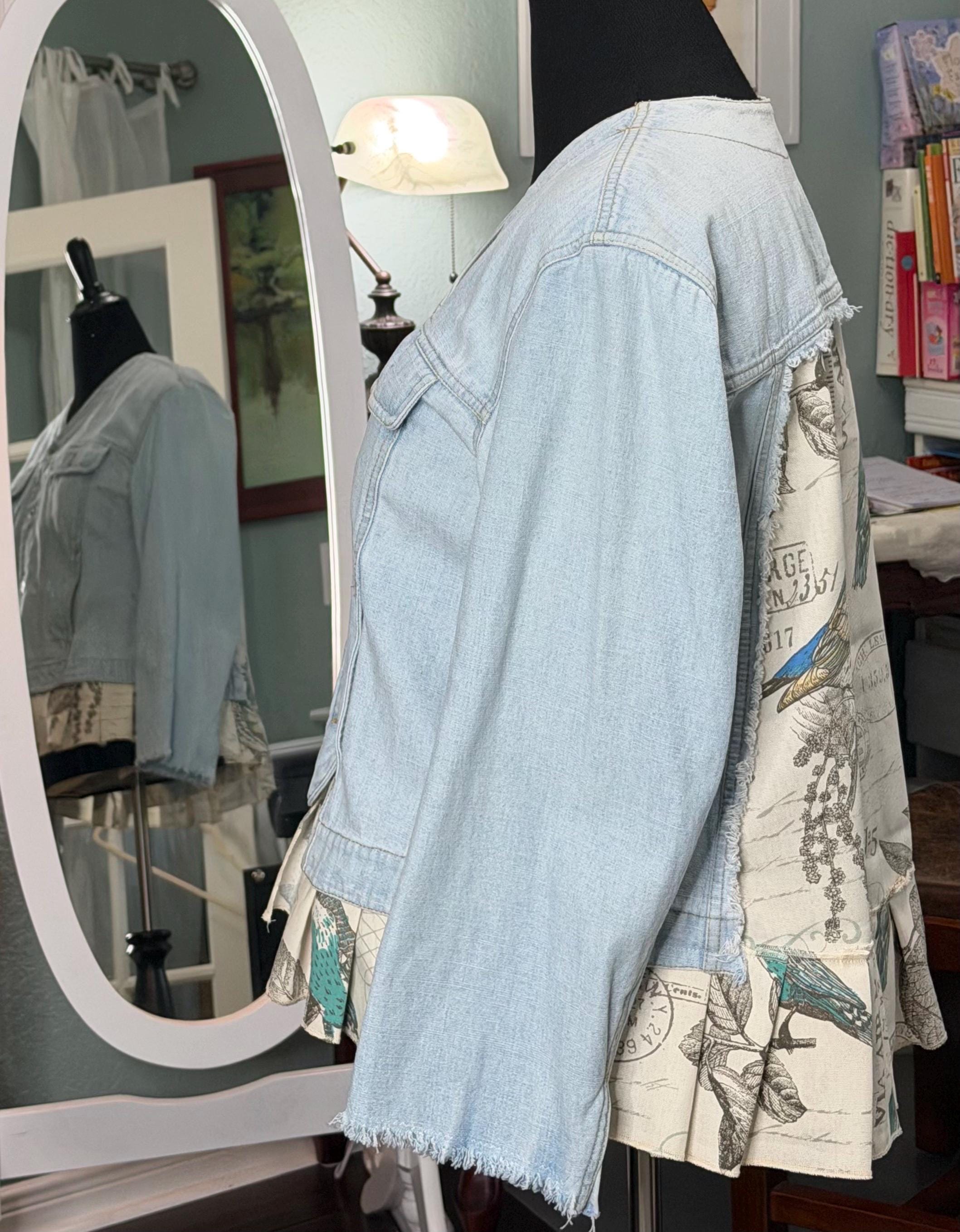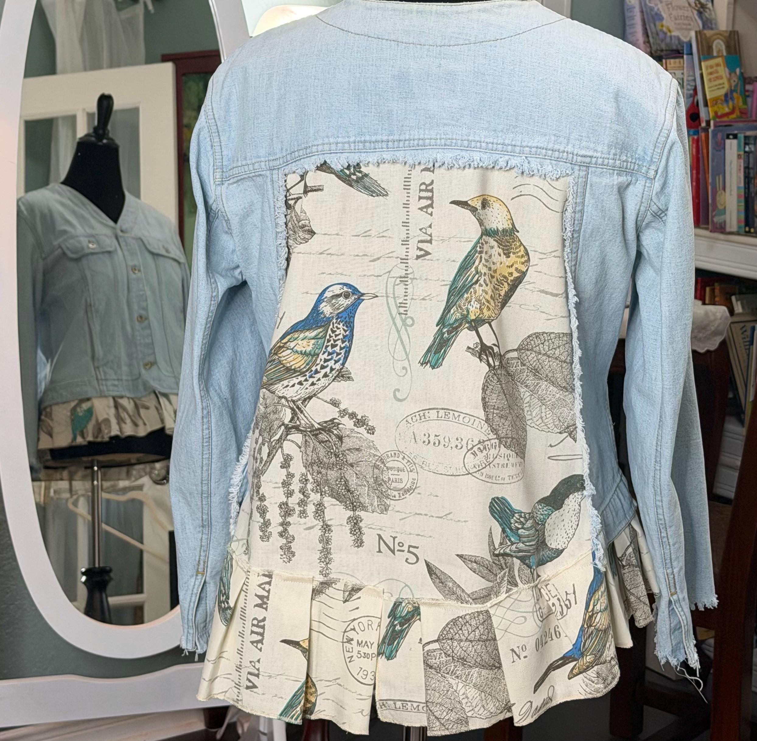 This beautiful upcycled short denim jacket is perfect for any occasion. It has a back inset with a blue bird print on cream cotton and a pleated hem with the same material. The sleeves and back are artfully frayed in shabby chic fashion.