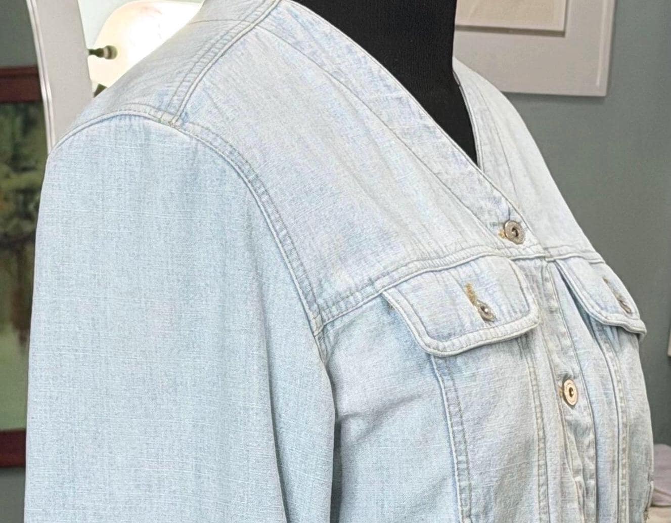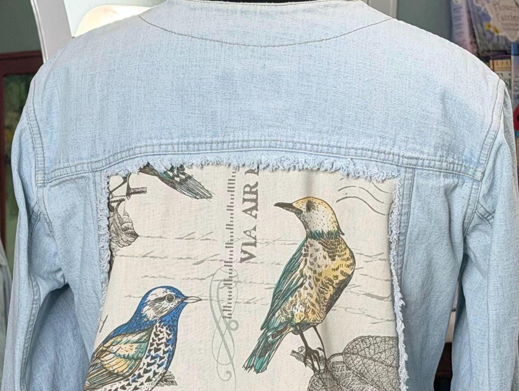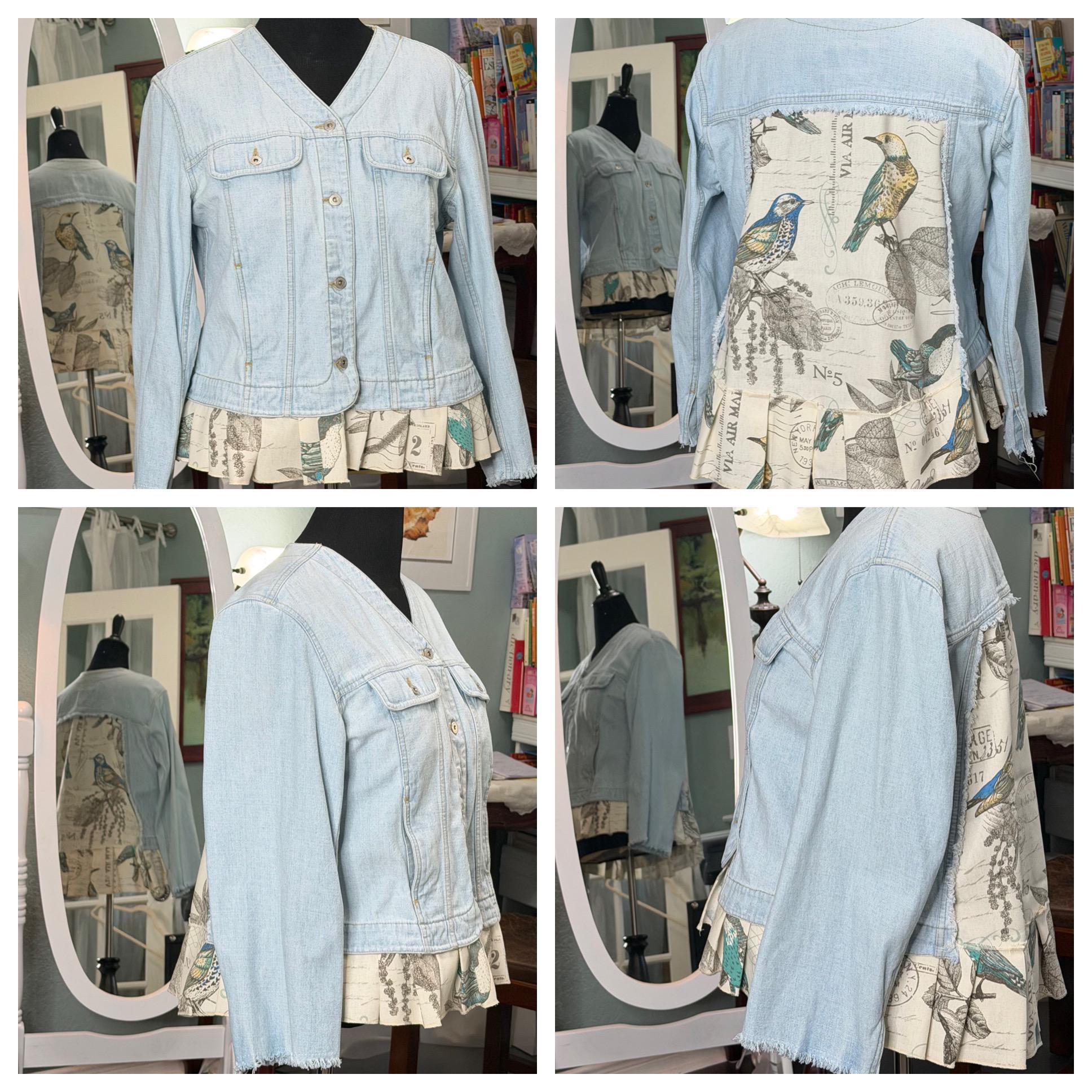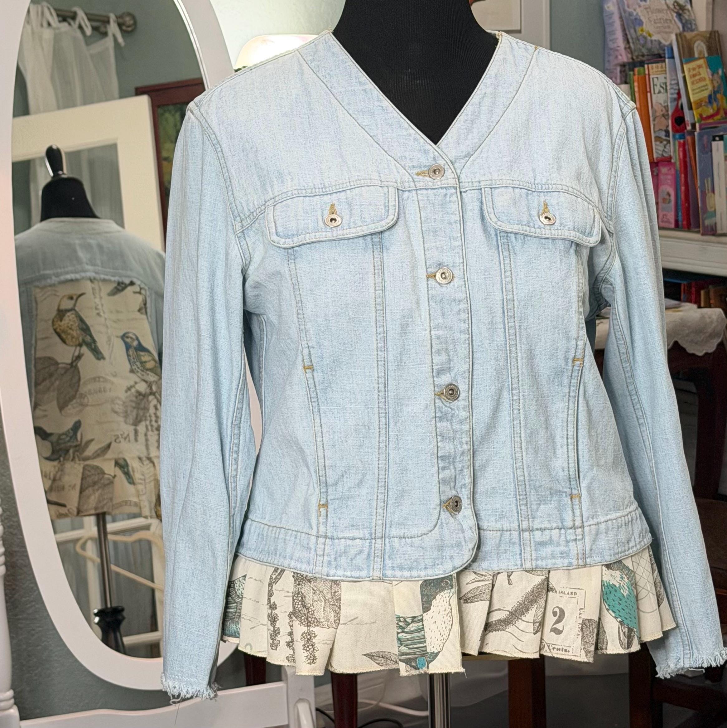 This beautiful upcycled short denim jacket is perfect for any occasion. It has a back inset with a blue bird print on cream cotton and a pleated hem with the same material. The sleeves and back are artfully frayed in shabby chic fashion.