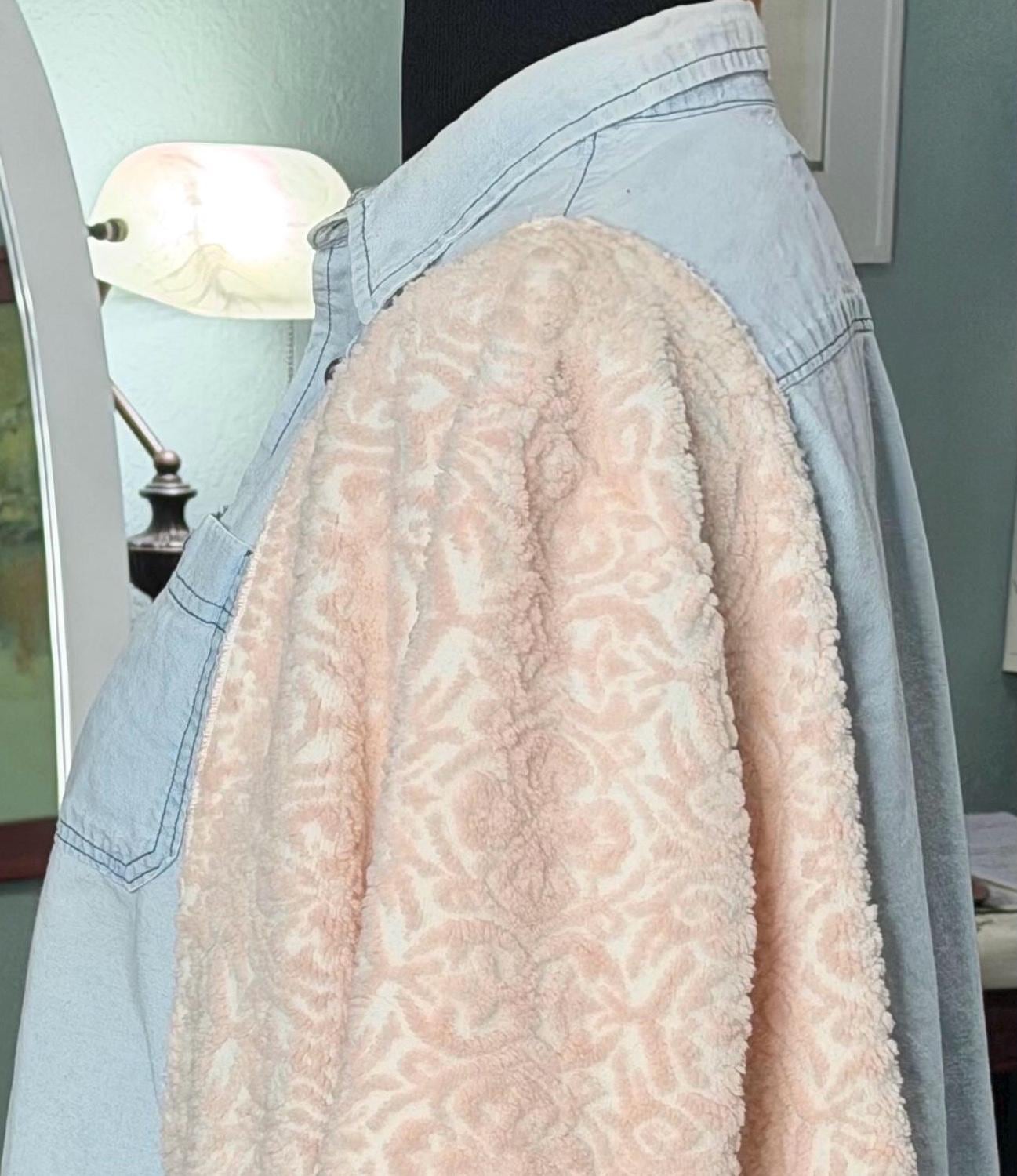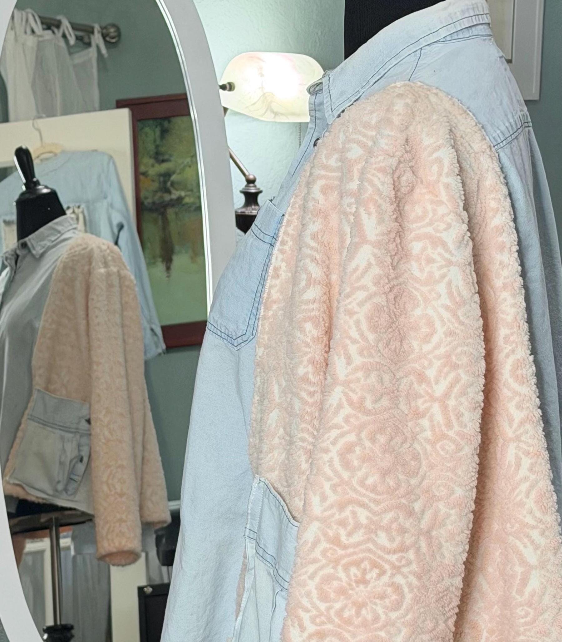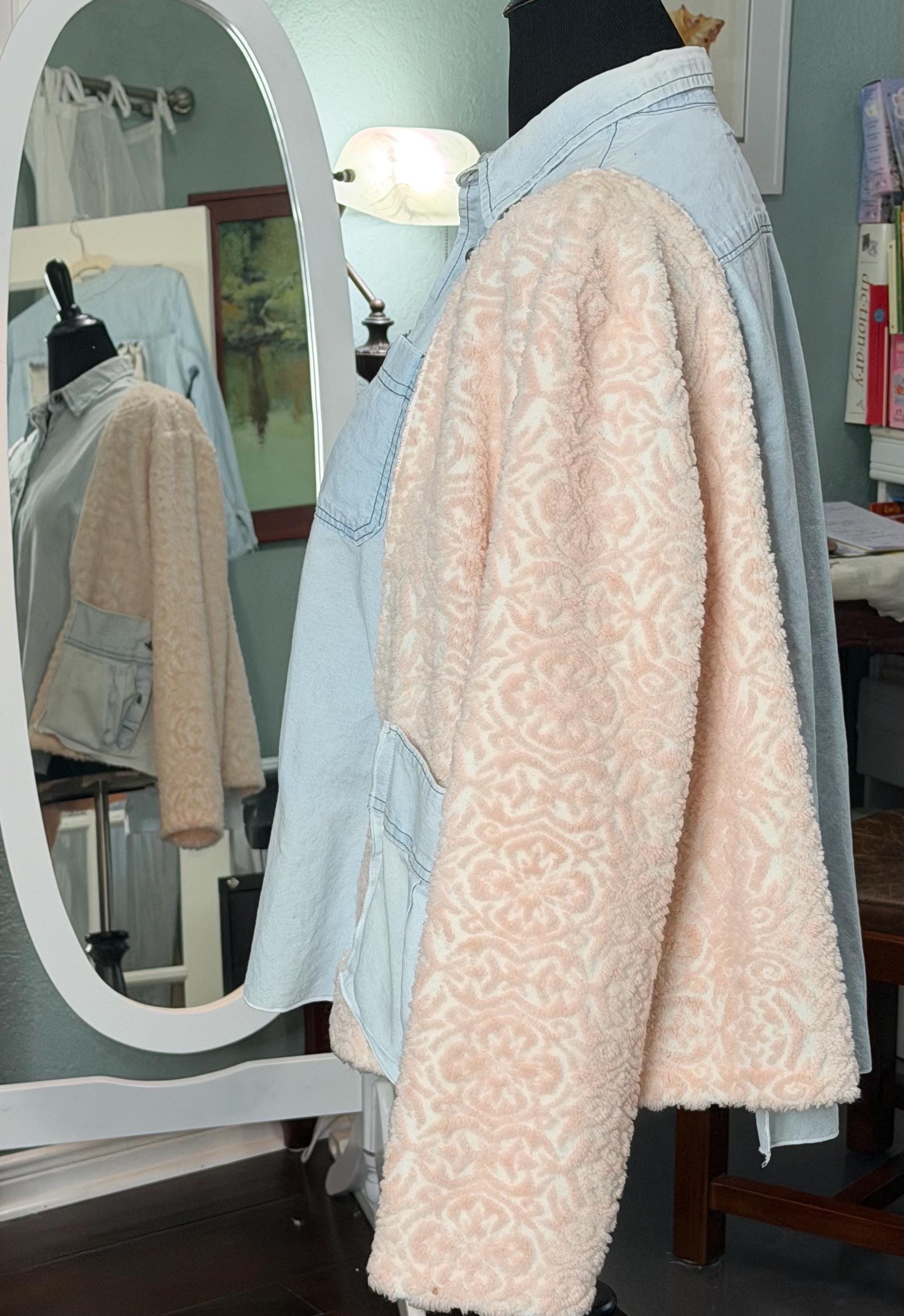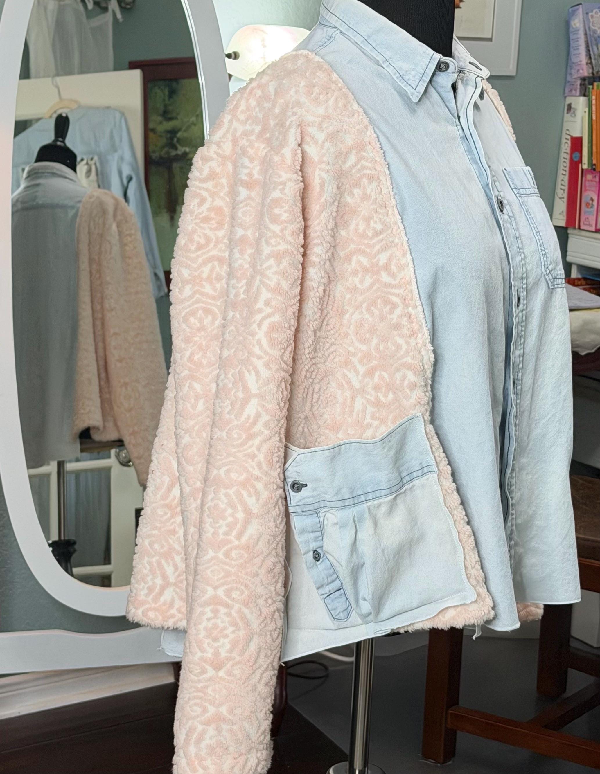 This beautiful upcycled light blue denim jacket is perfect for any occasion. It has sides and sleeves in pink fleece and two large side pockets.
