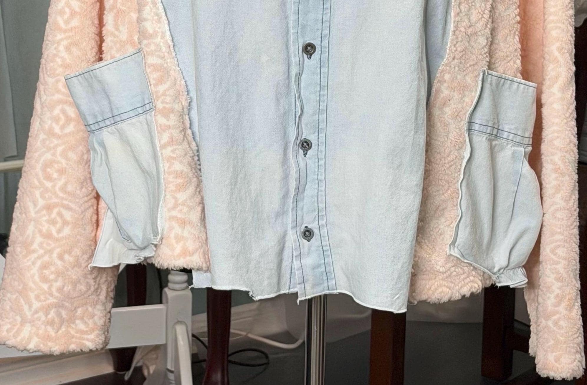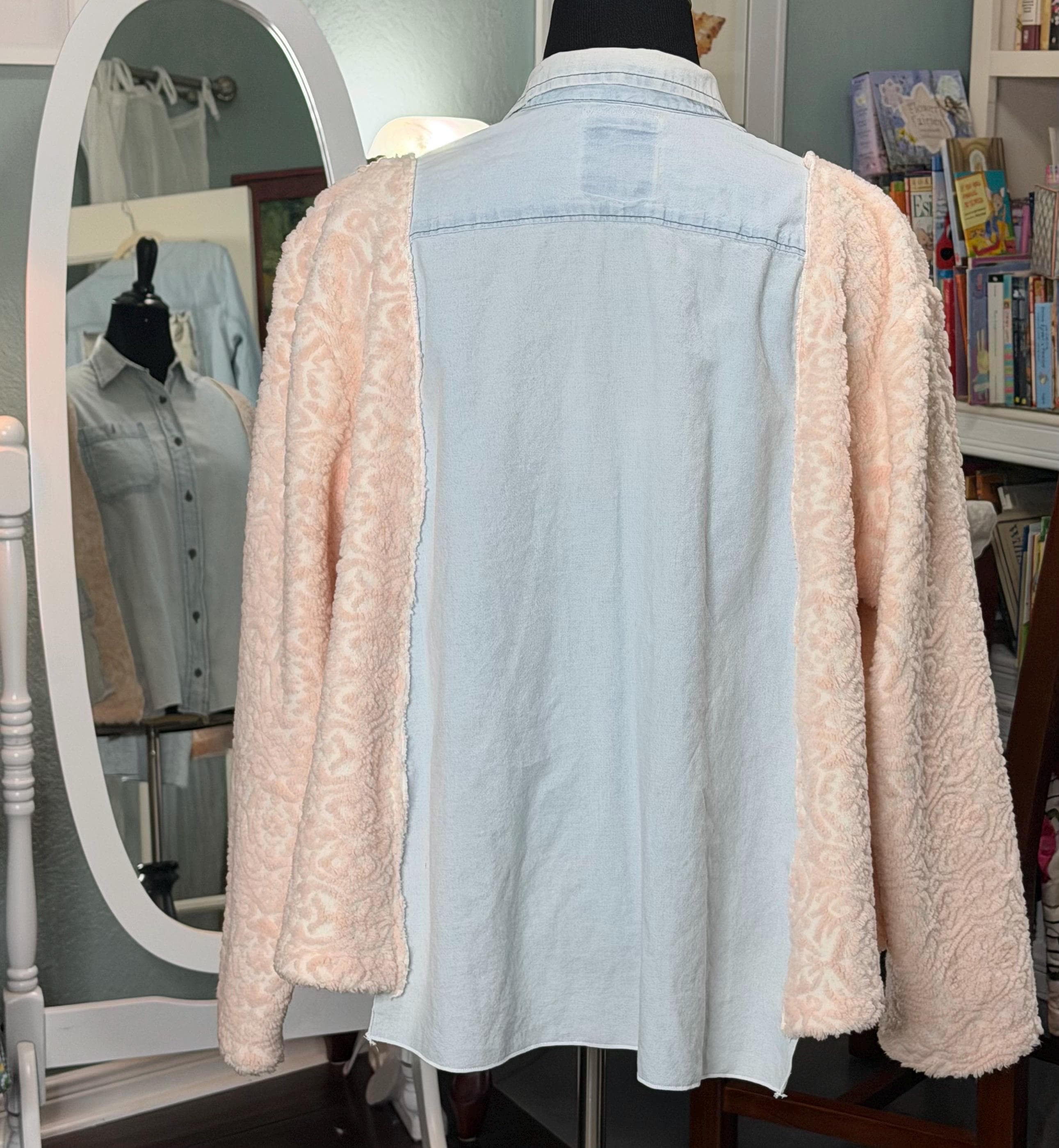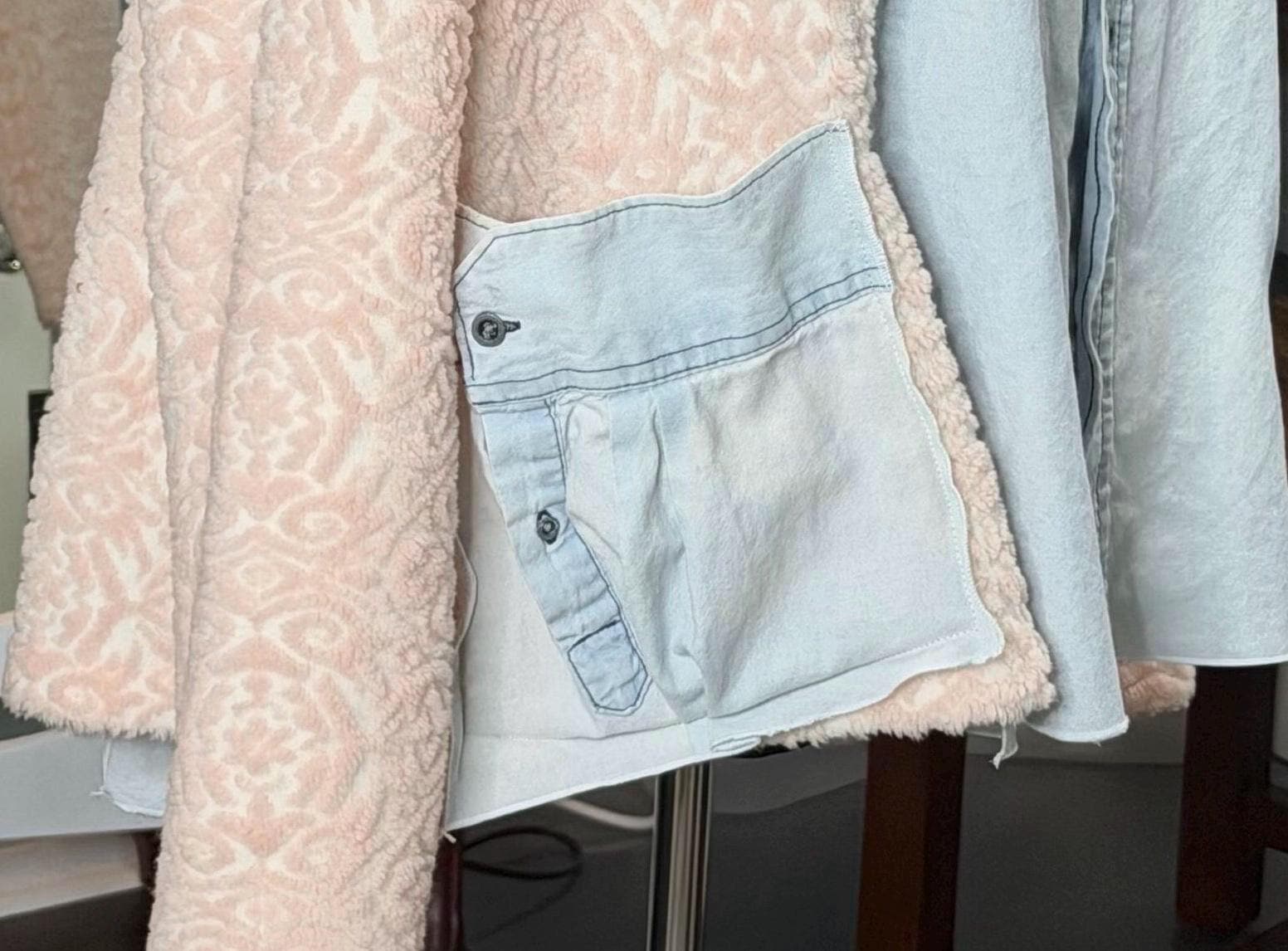 This beautiful upcycled light blue denim jacket is perfect for any occasion. It has sides and sleeves in pink fleece and two large side pockets.