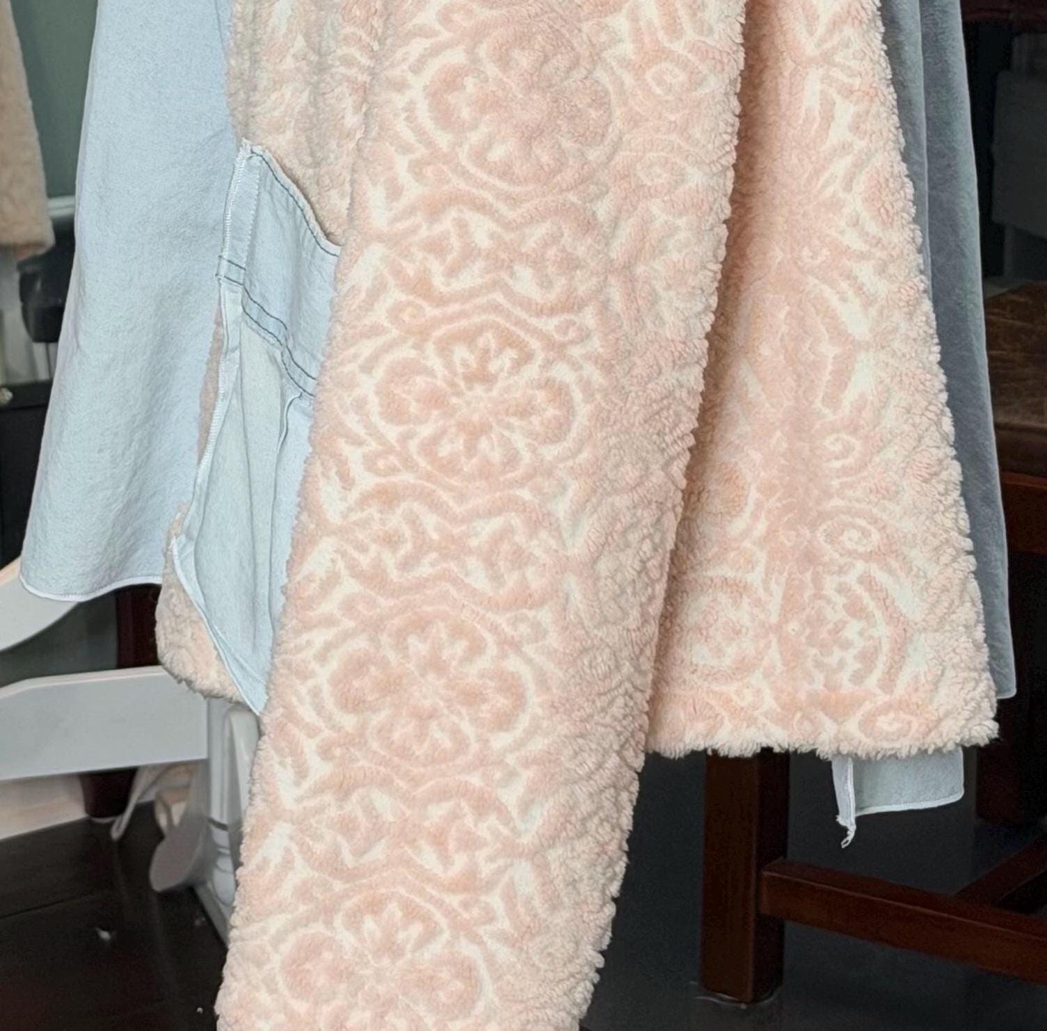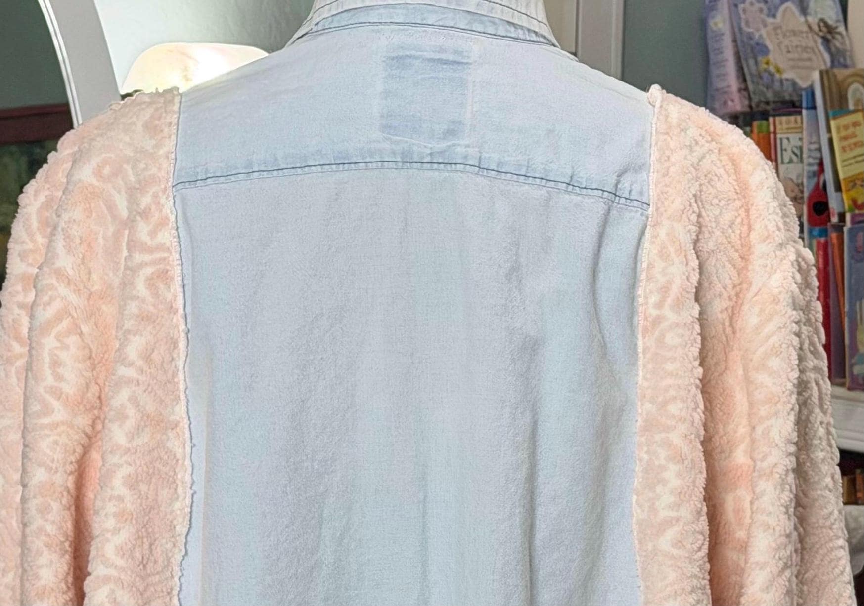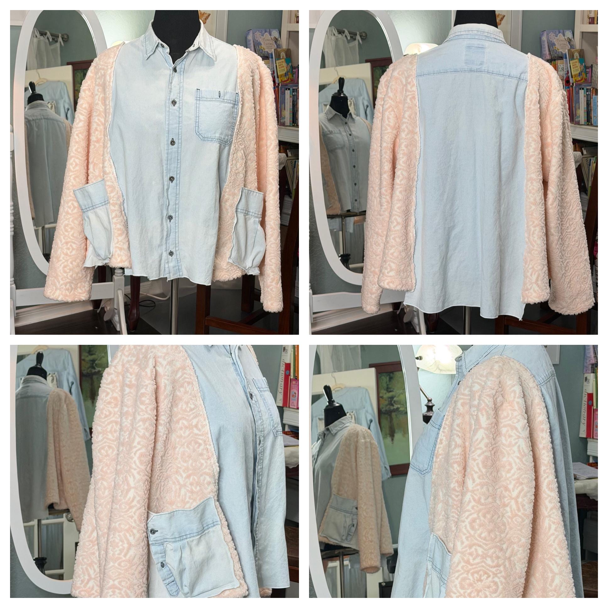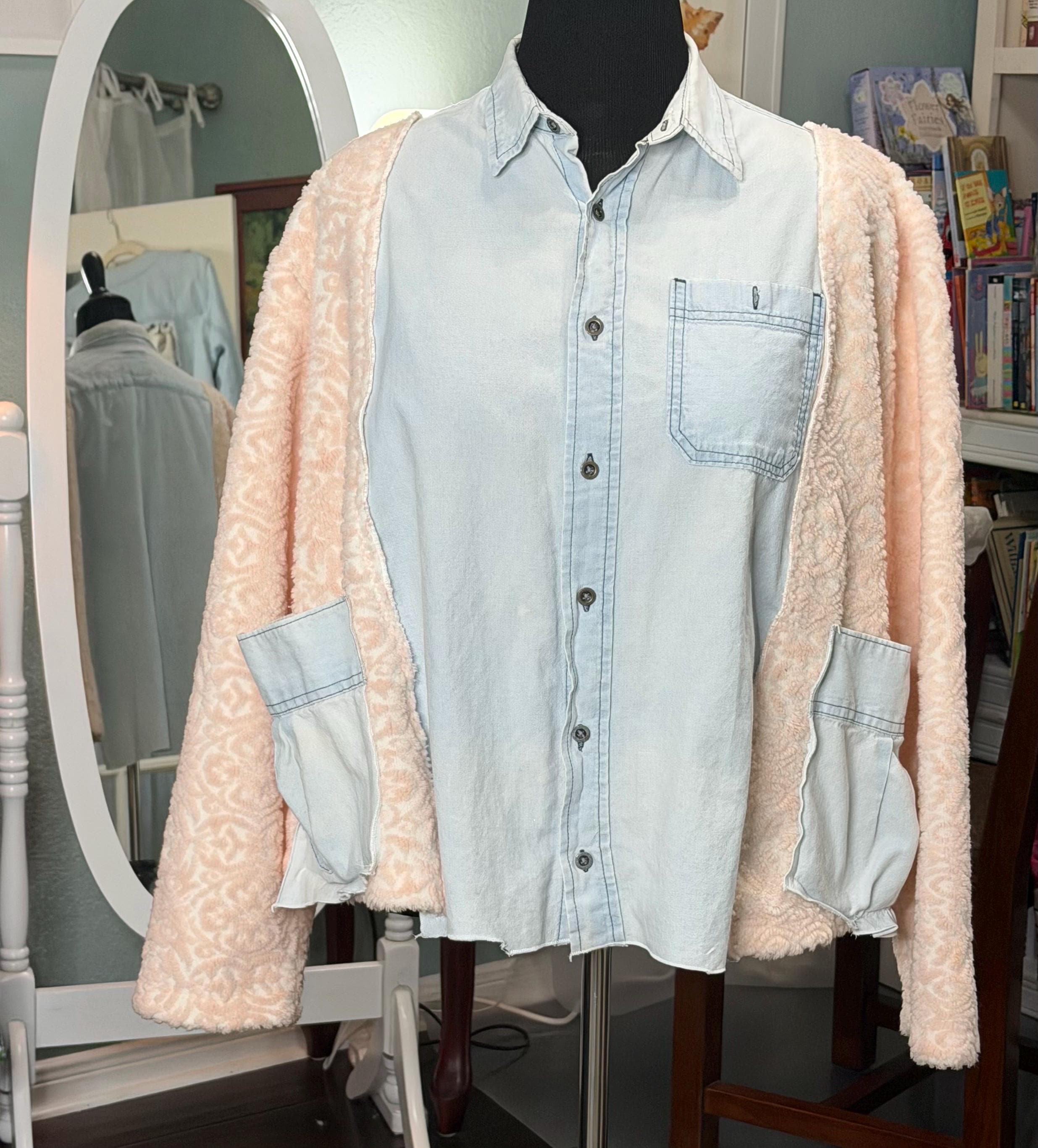 This beautiful upcycled light blue denim jacket is perfect for any occasion. It has sides and sleeves in pink fleece and two large side pockets.