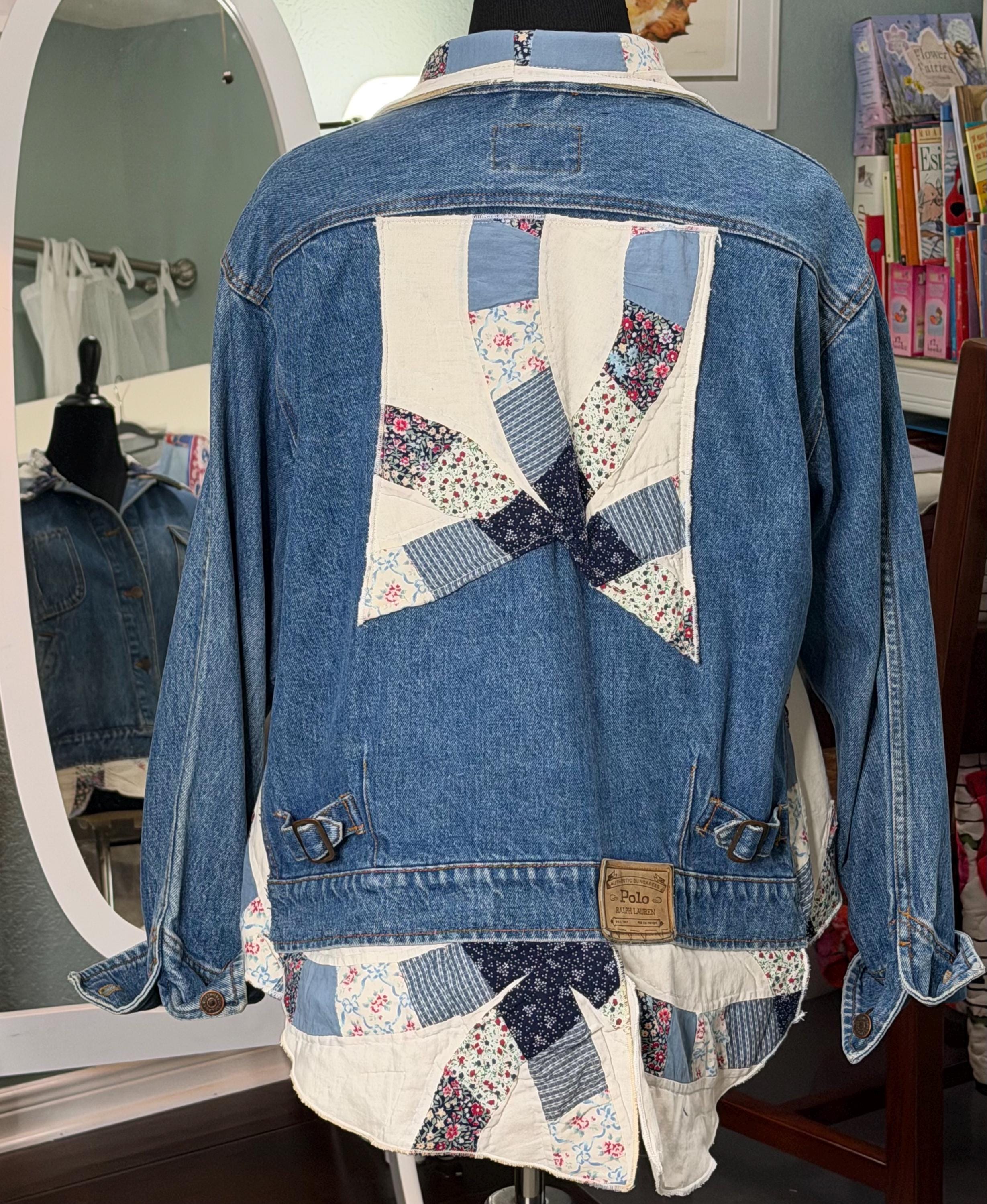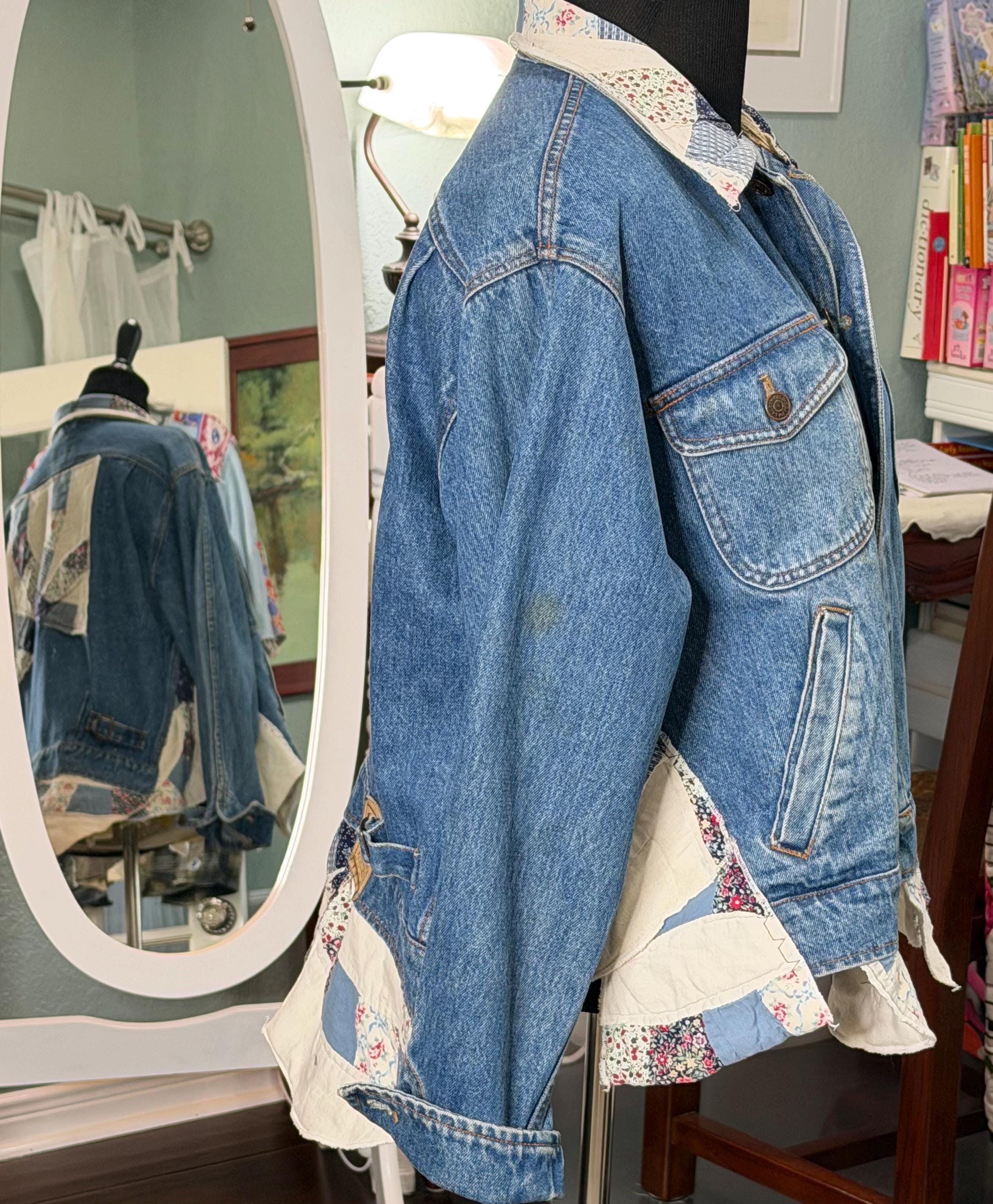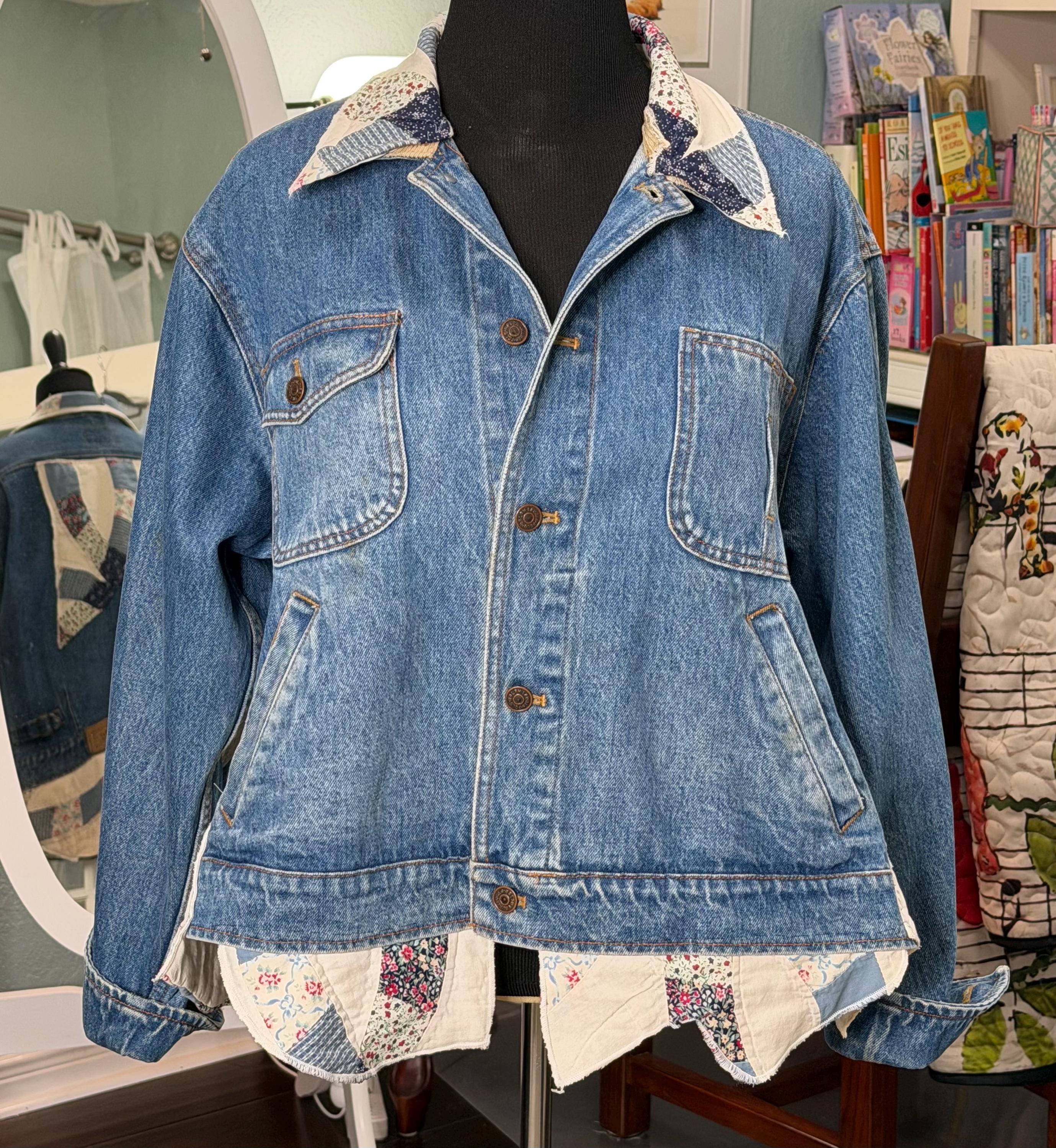This one of a kind blue denim bomber jacket is easy fitting and special. It has an inset at both sides and other special pieces at the hemline from a wedding ring quilt. The back anpplique is also a piece from this same wedding ring pattern quilt.
