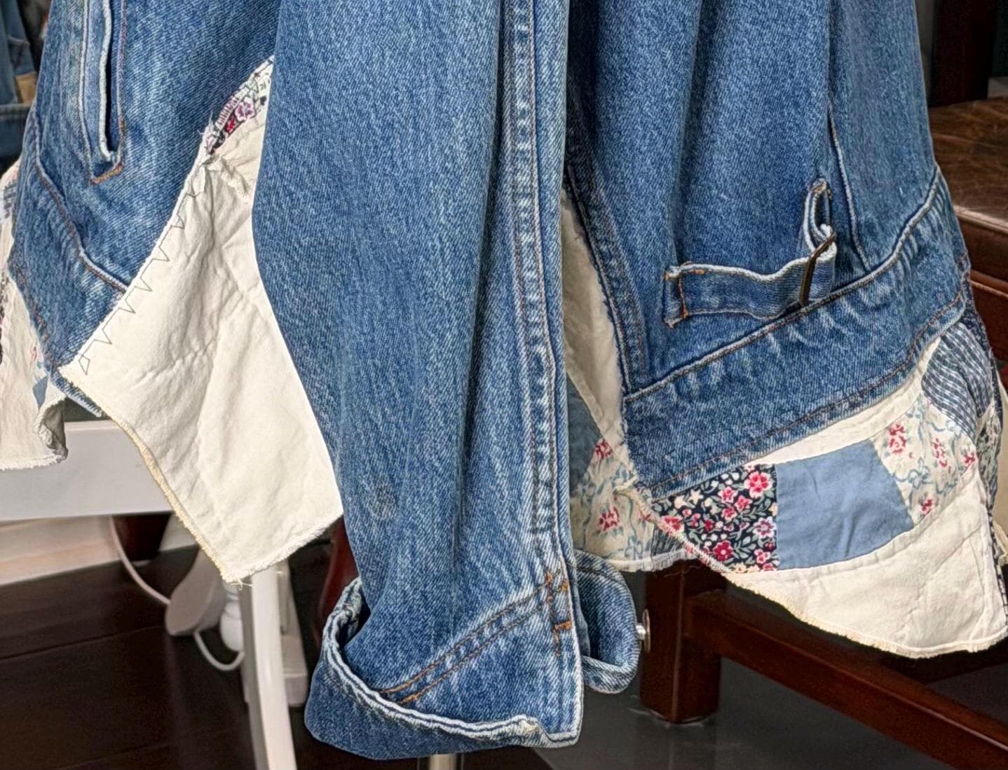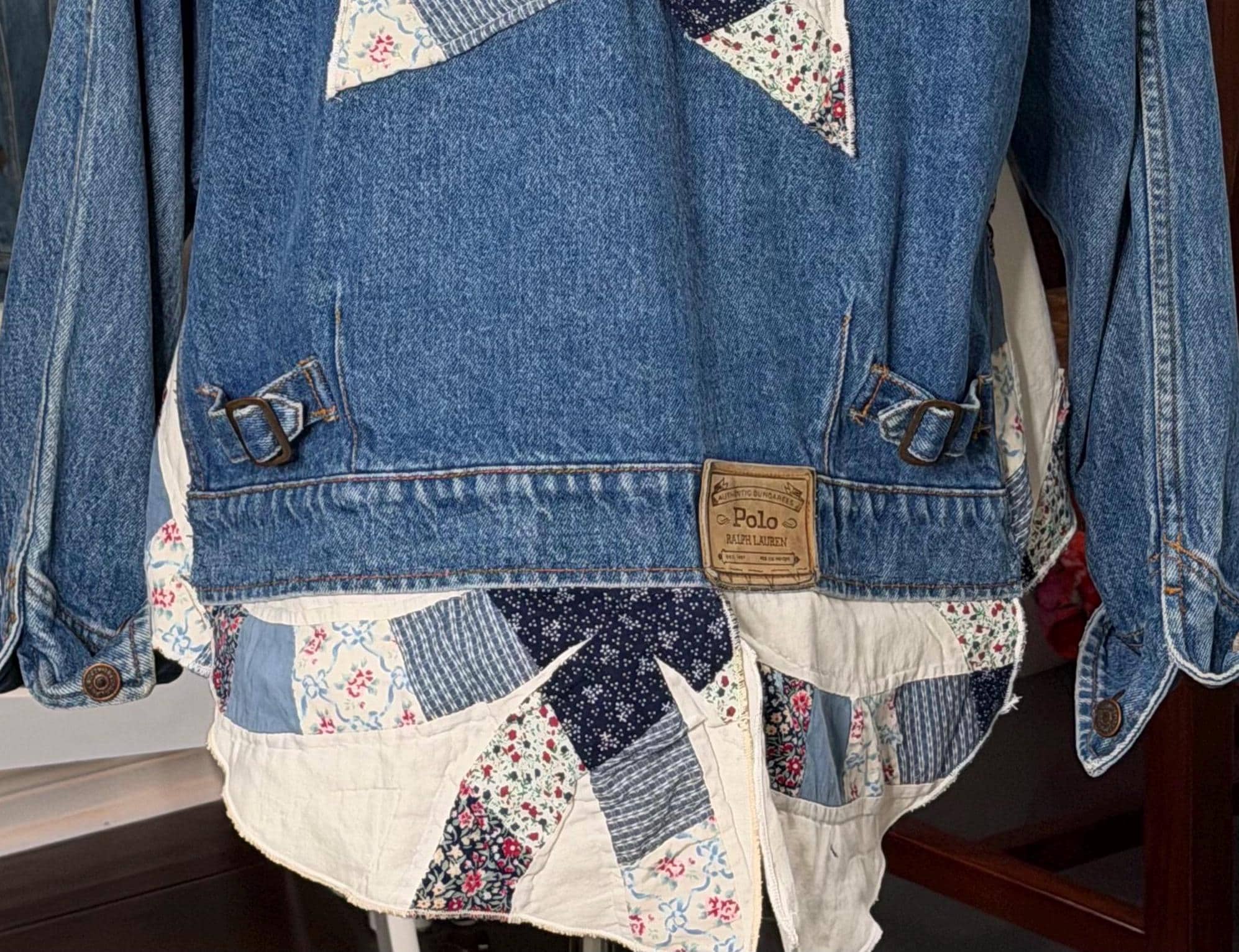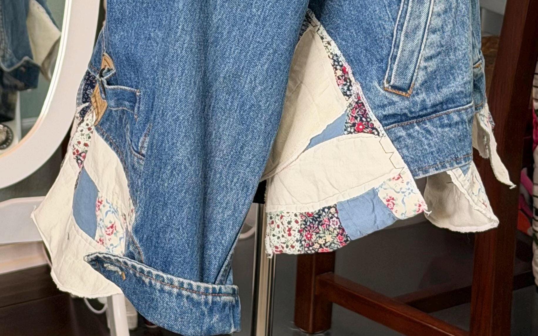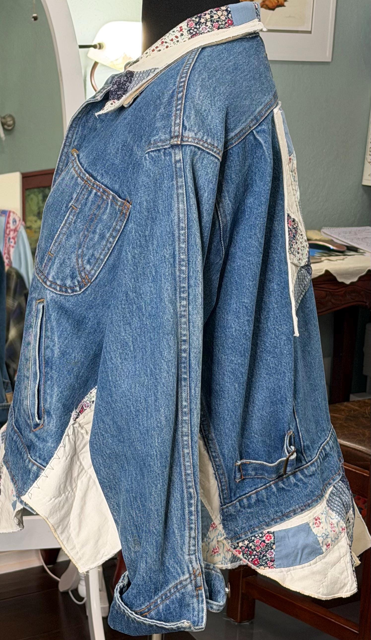 This one of a kind blue denim bomber jacket is easy fitting and special. It has an inset at both sides and other special pieces at the hemline from a wedding ring quilt. The back anpplique is also a piece from this same wedding ring pattern quilt.