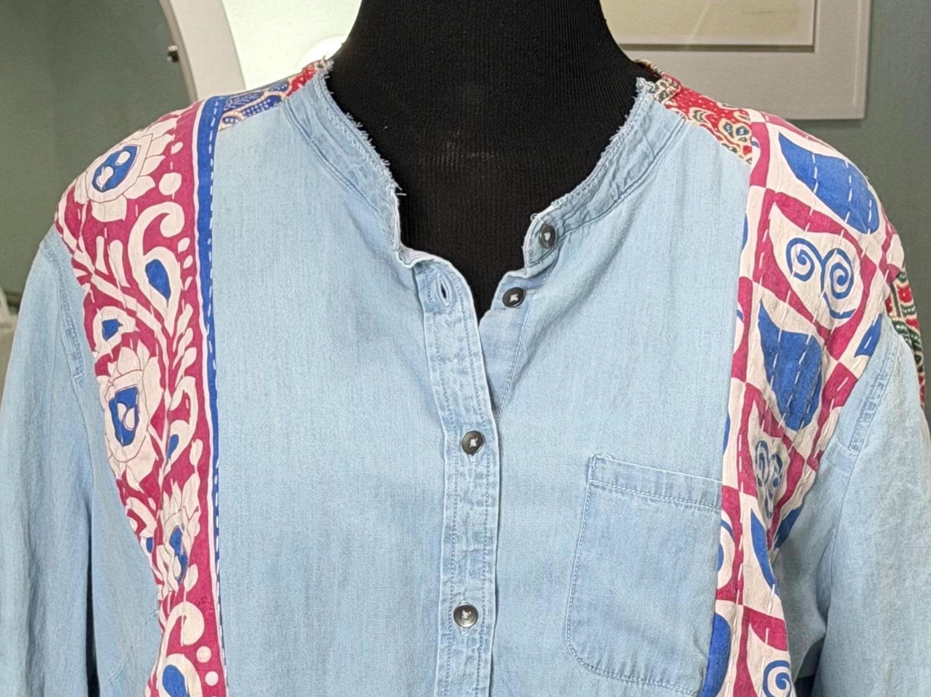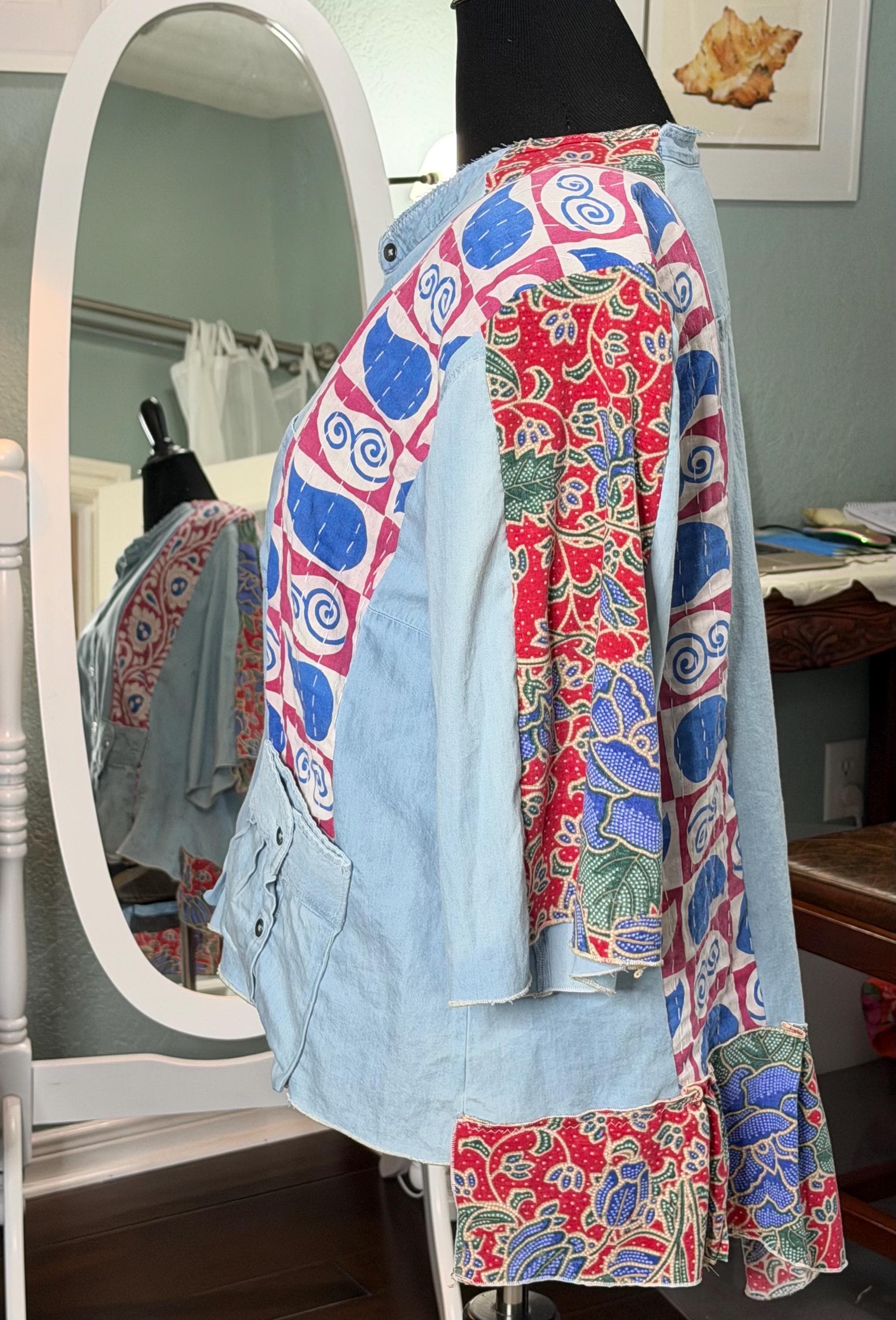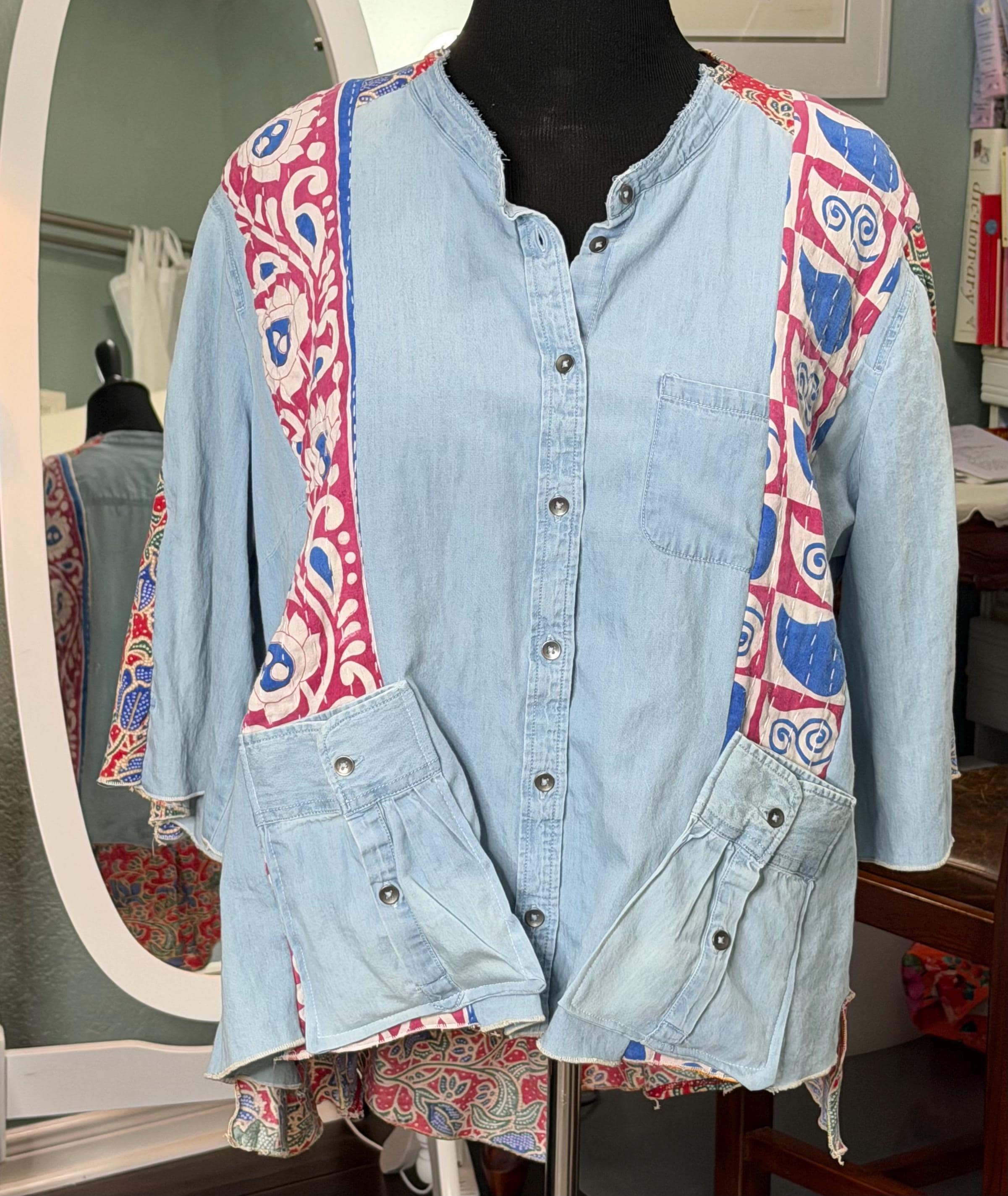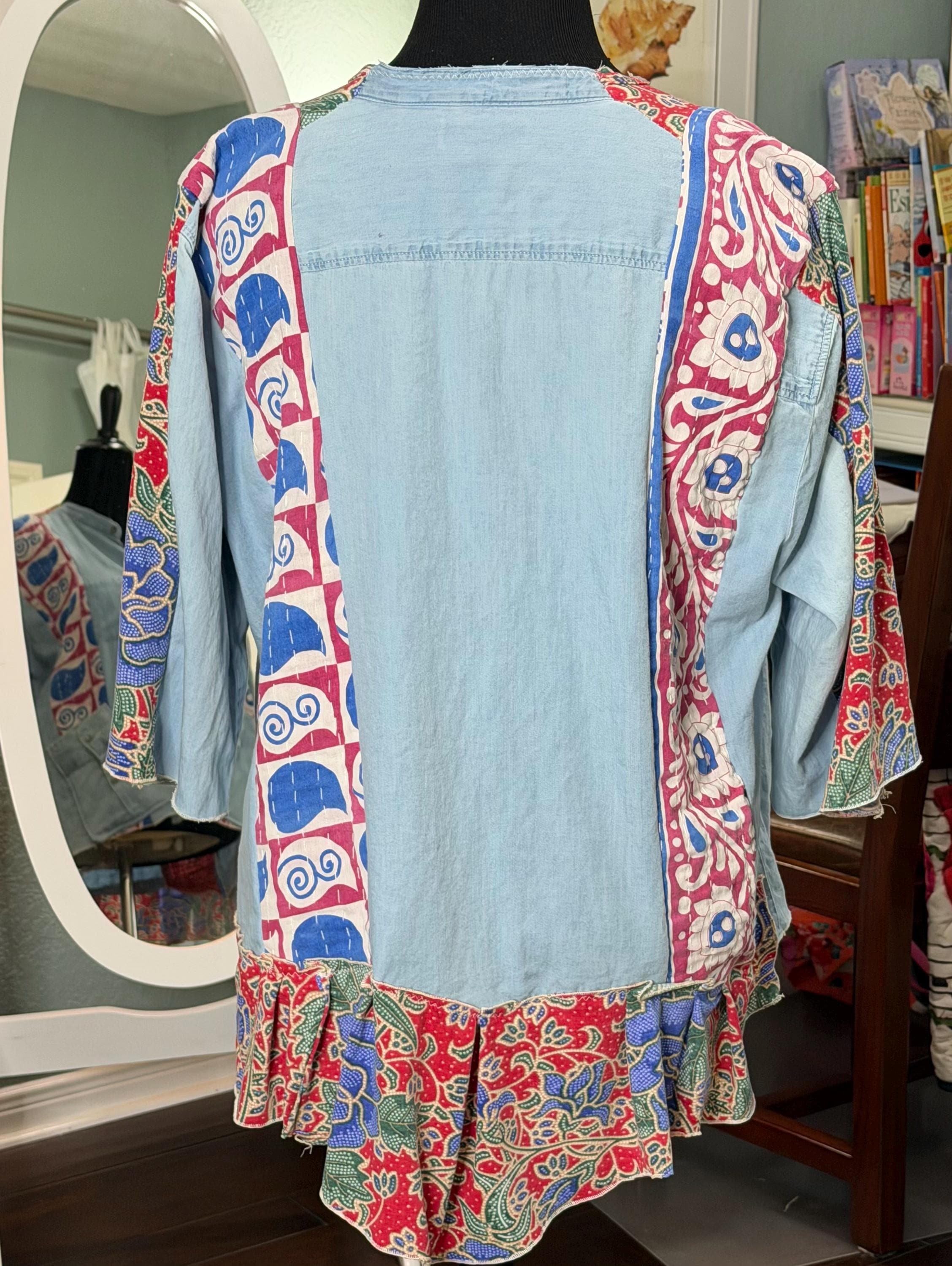 This one of a kind light denim jacket is easy fitting and special. It has an inset of red print fabric along the top sleeves and a stripe of kantha fabric on the front as well as the back. The back hem line has a matching ruffle. There are also two large front side pockets.