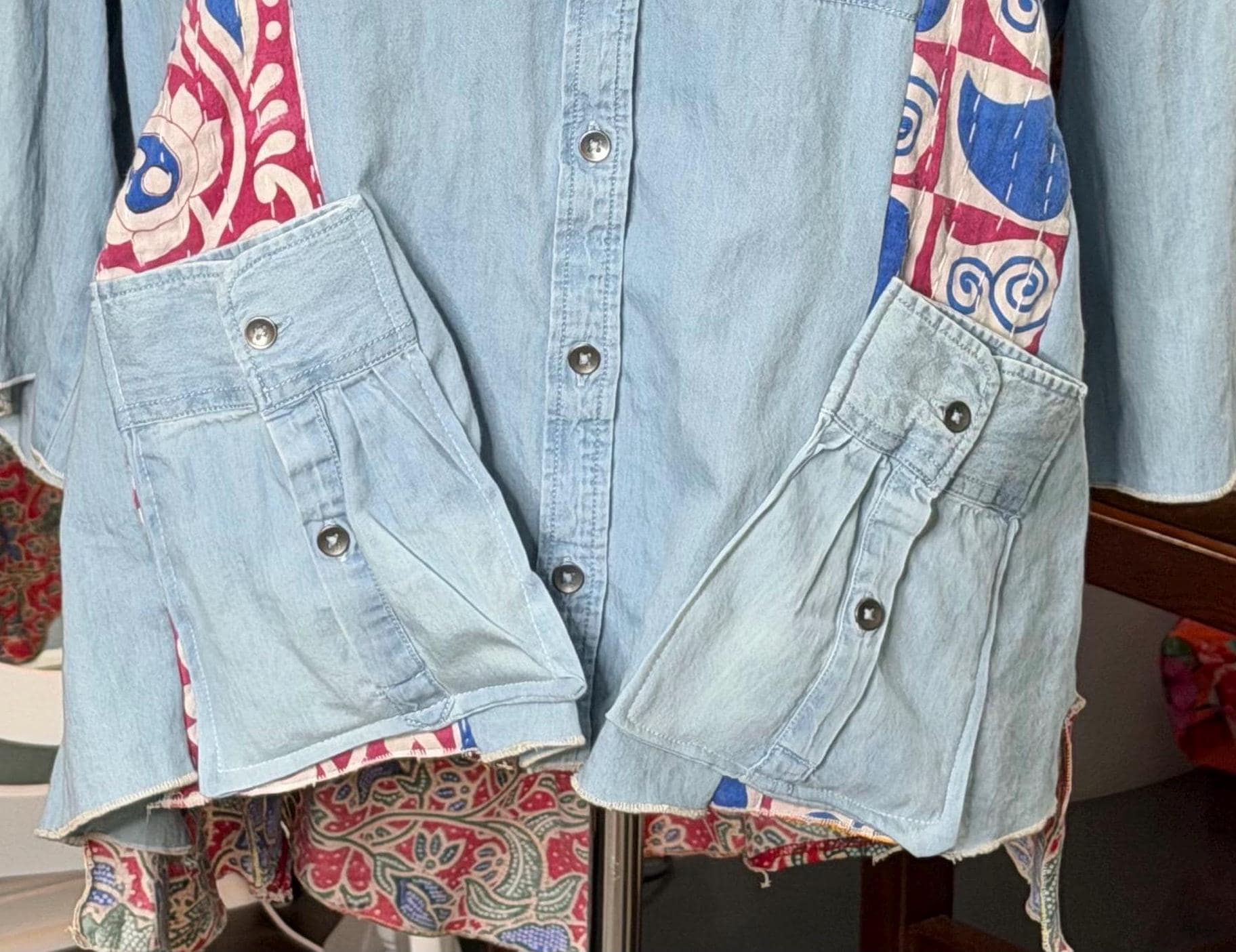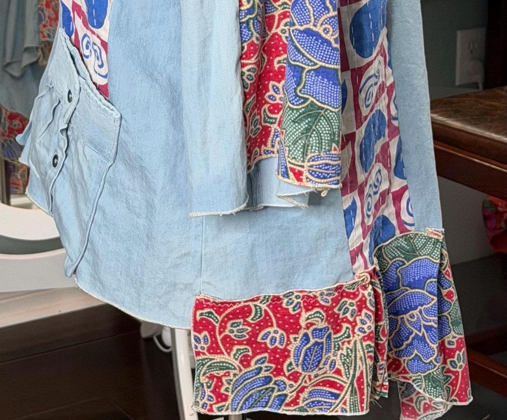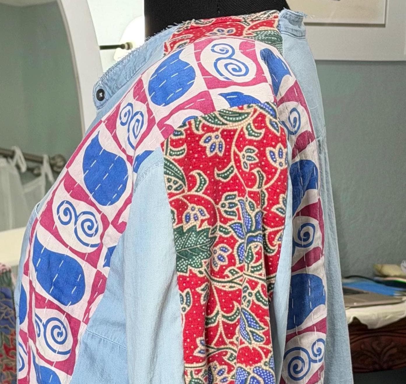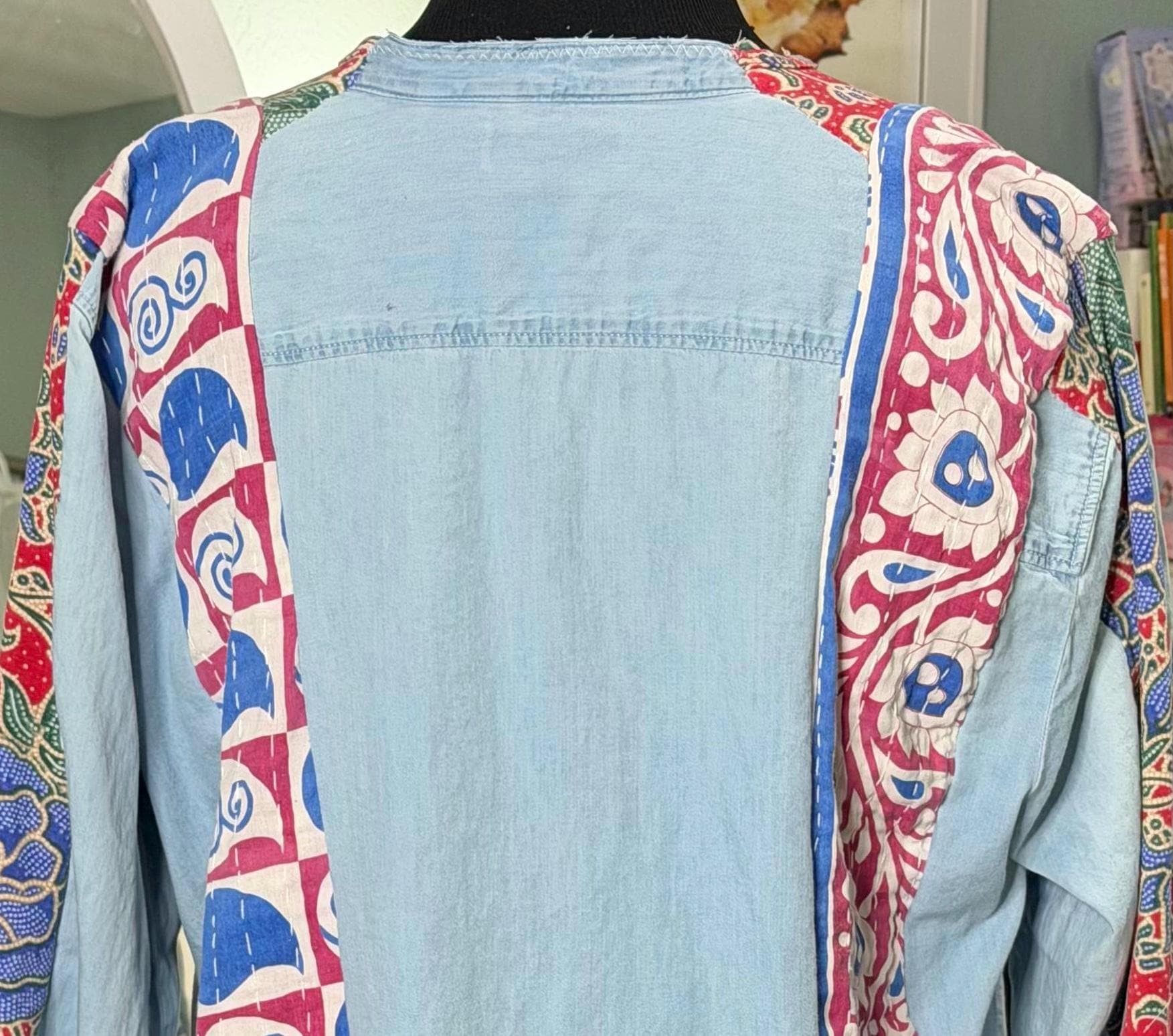 This one of a kind light denim jacket is easy fitting and special. It has an inset of red print fabric along the top sleeves and a stripe of kantha fabric on the front as well as the back. The back hem line has a matching ruffle. There are also two large front side pockets.