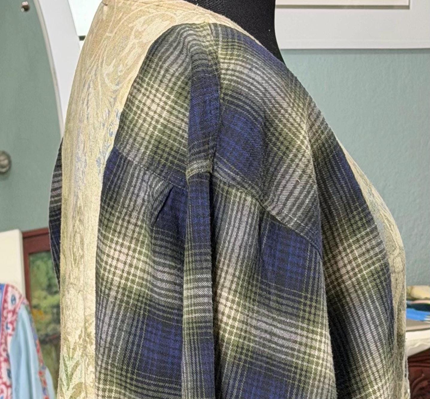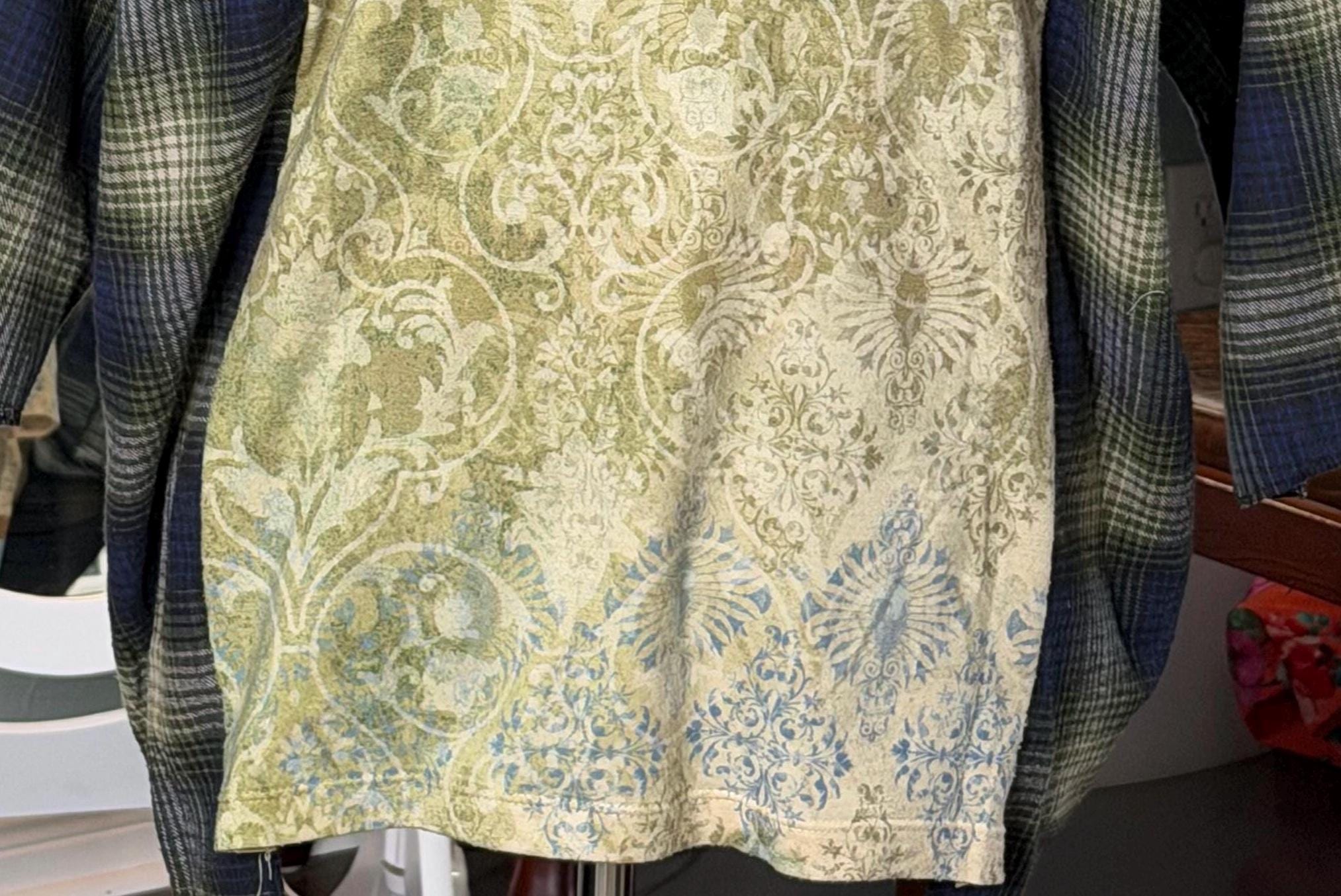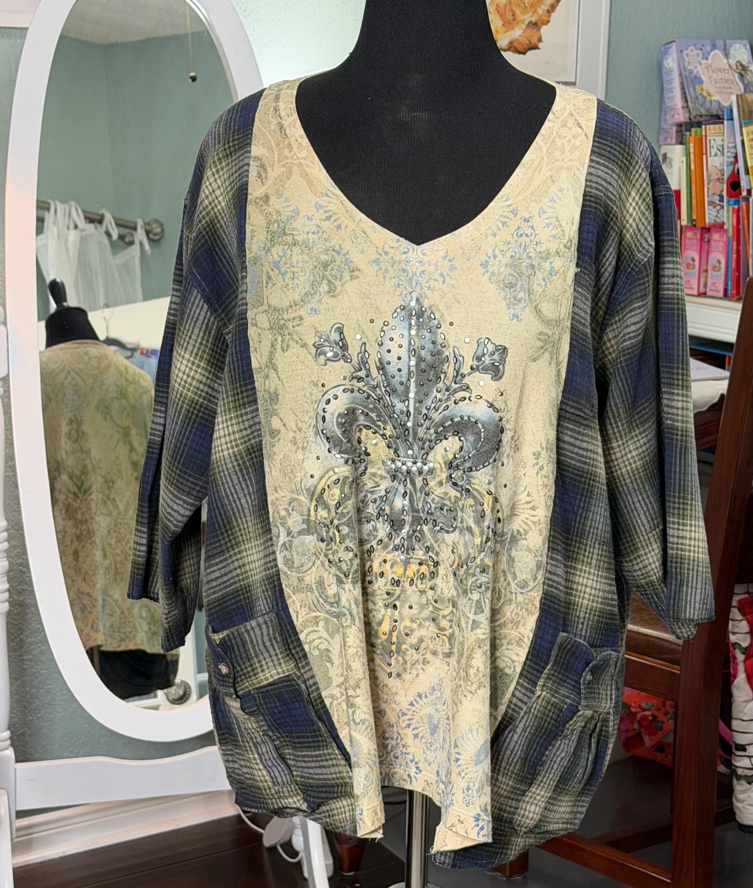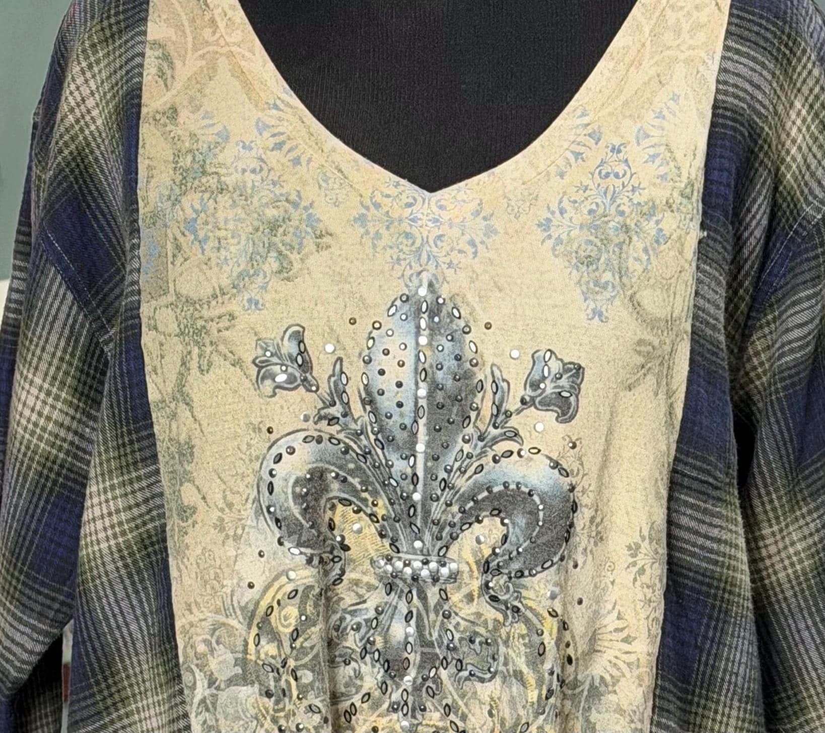 This beautiful one of a kind tunic is made from multiple coordinated pieces. The inspiration piece was the fluer de lis graphic tee. The sleeves and sides are soft flannel in a green and gold plaid.