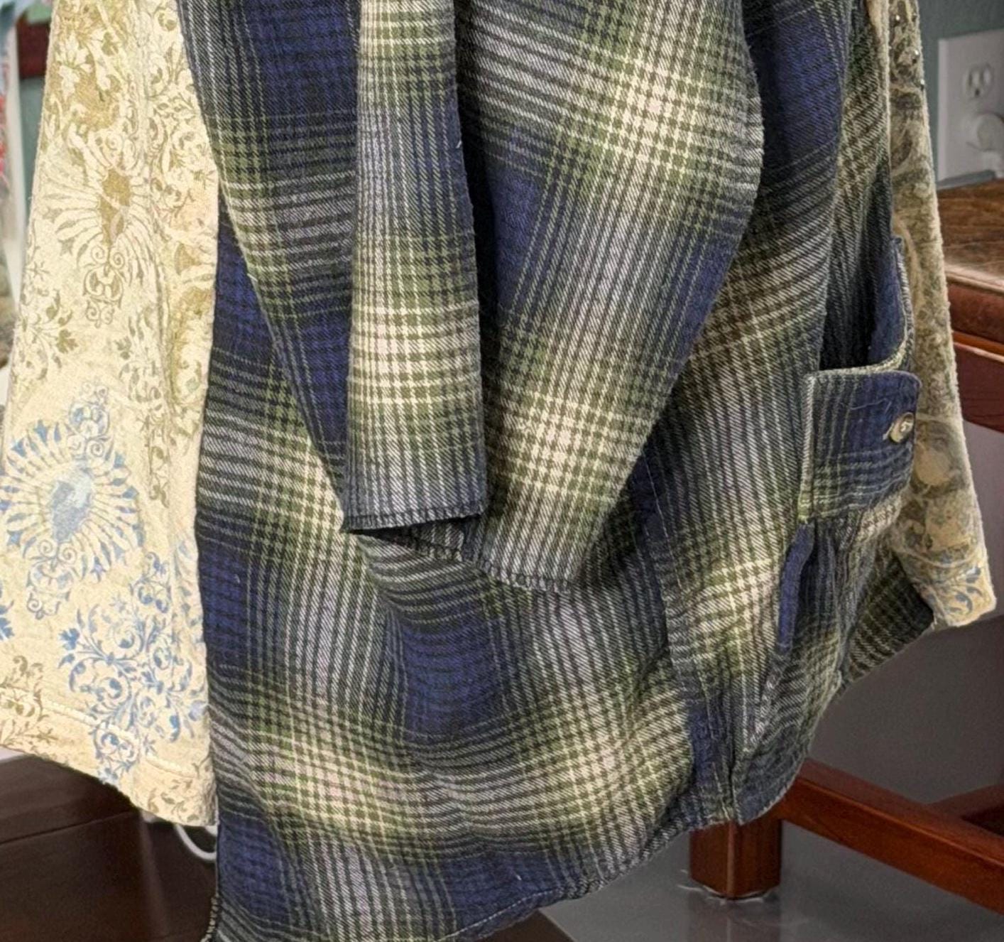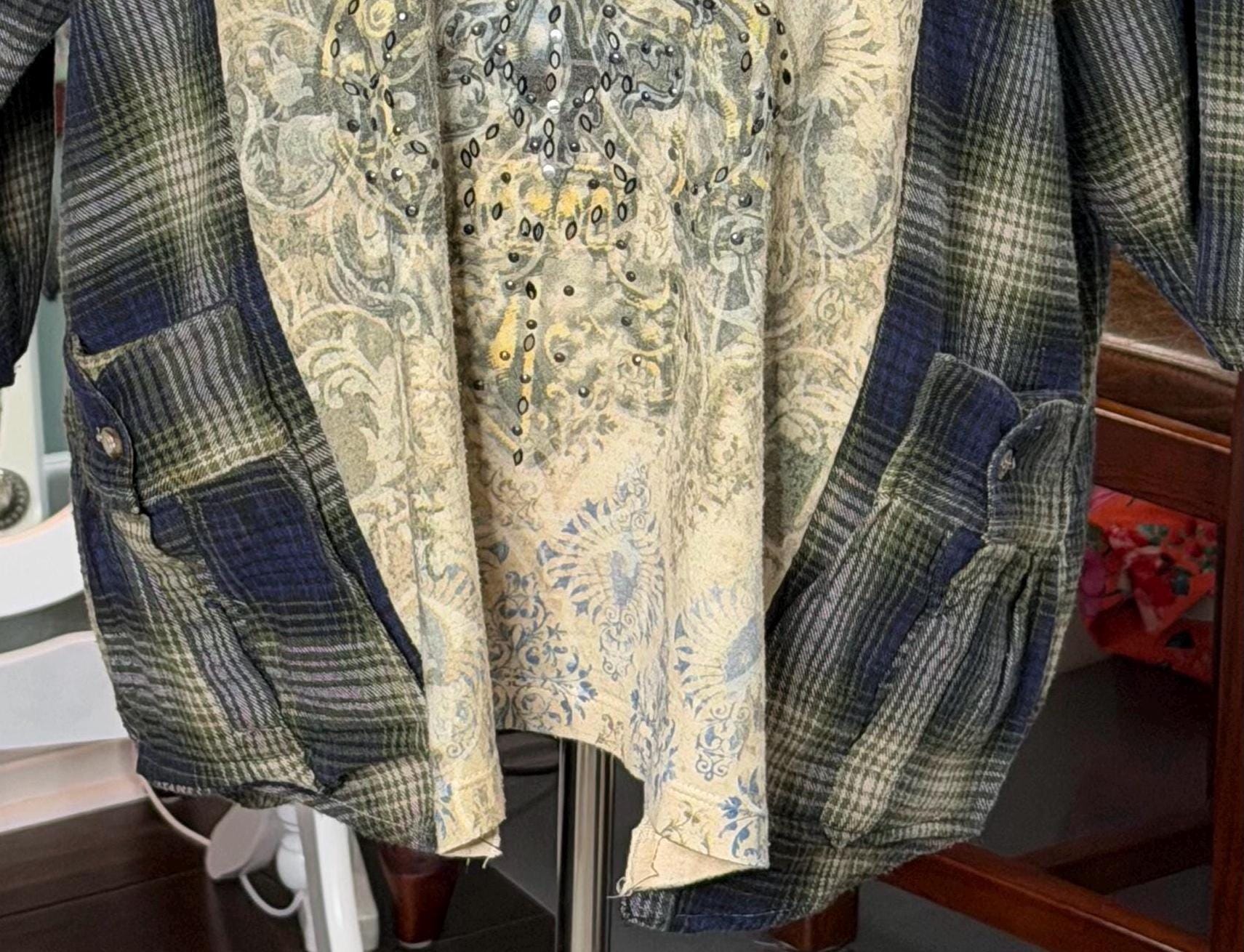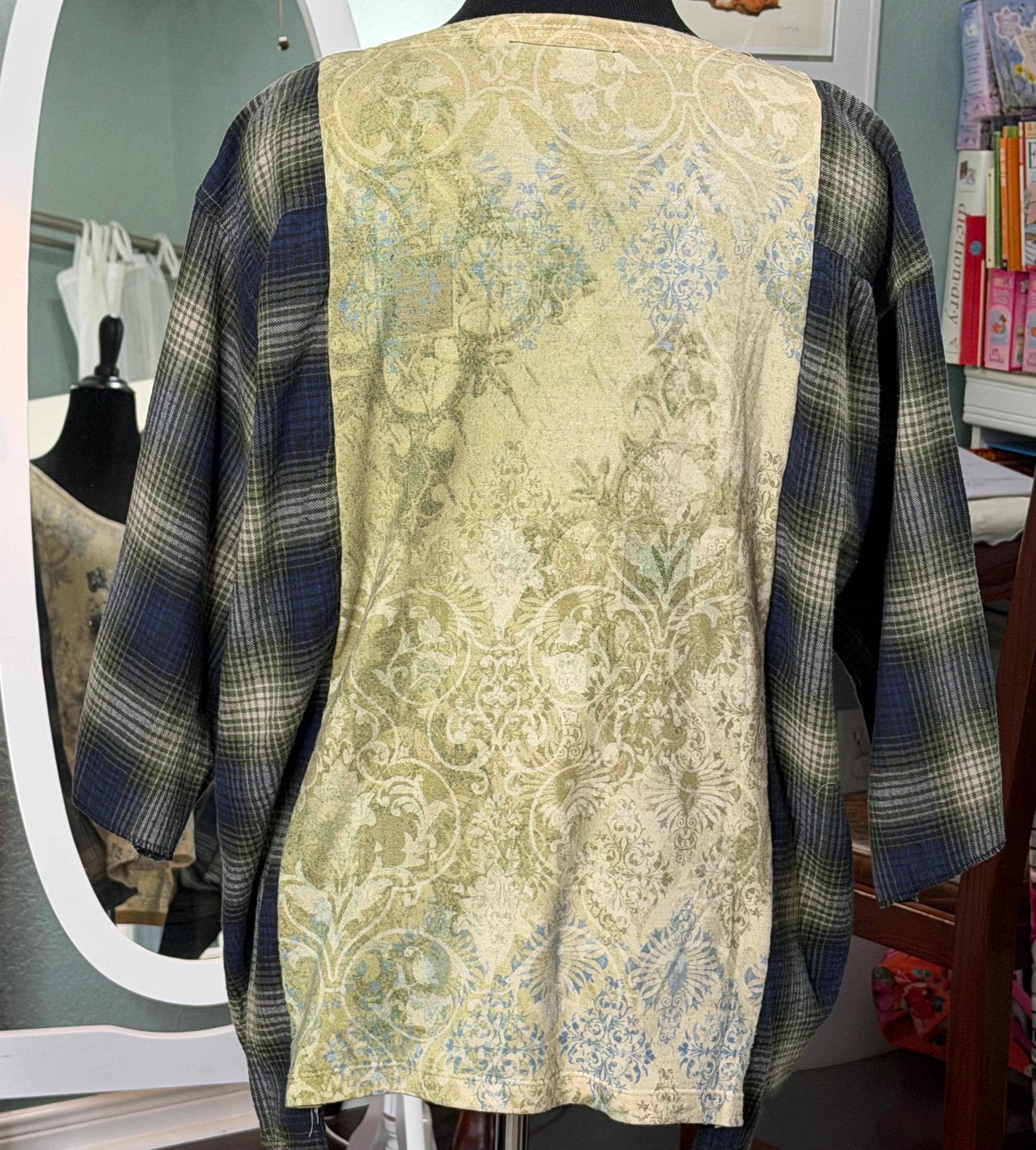 This beautiful one of a kind tunic is made from multiple coordinated pieces. The inspiration piece was the fluer de lis graphic tee. The sleeves and sides are soft flannel in a green and gold plaid.