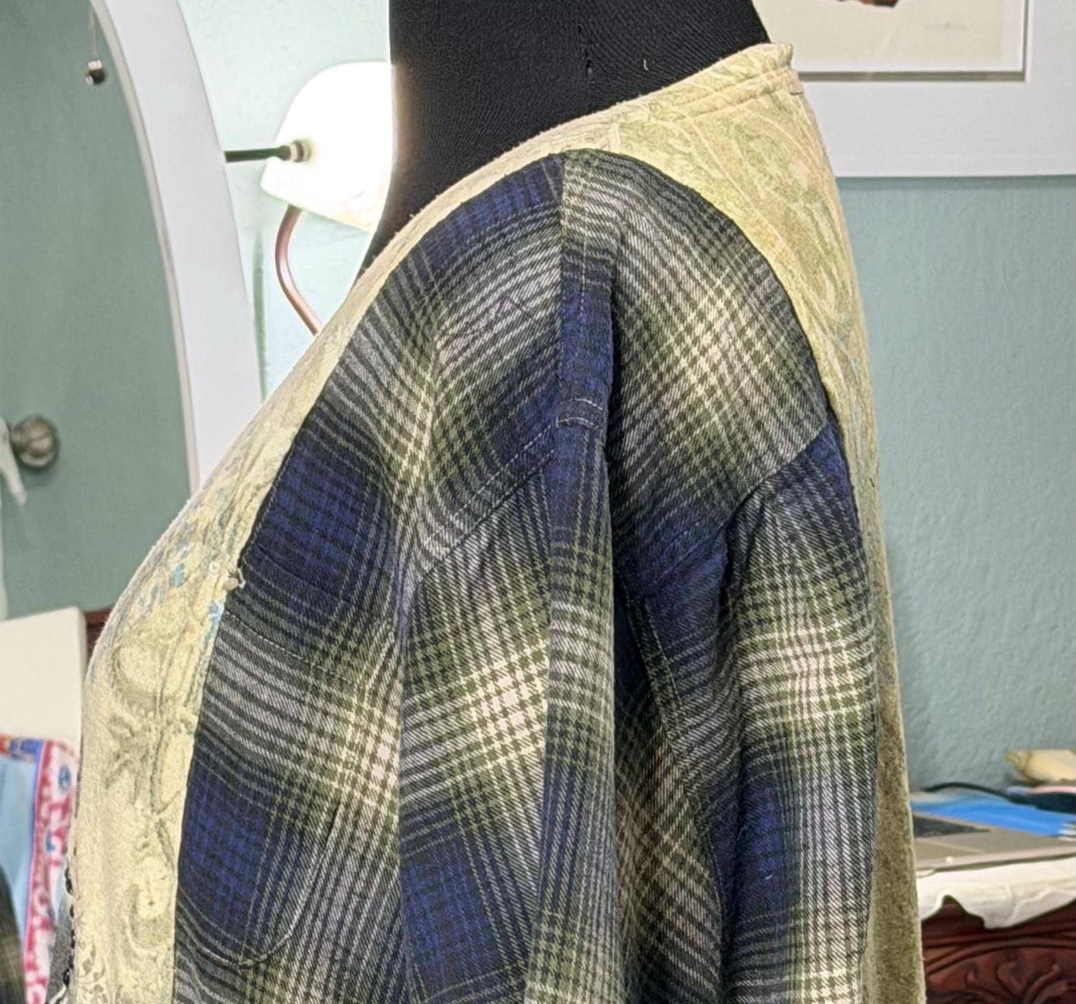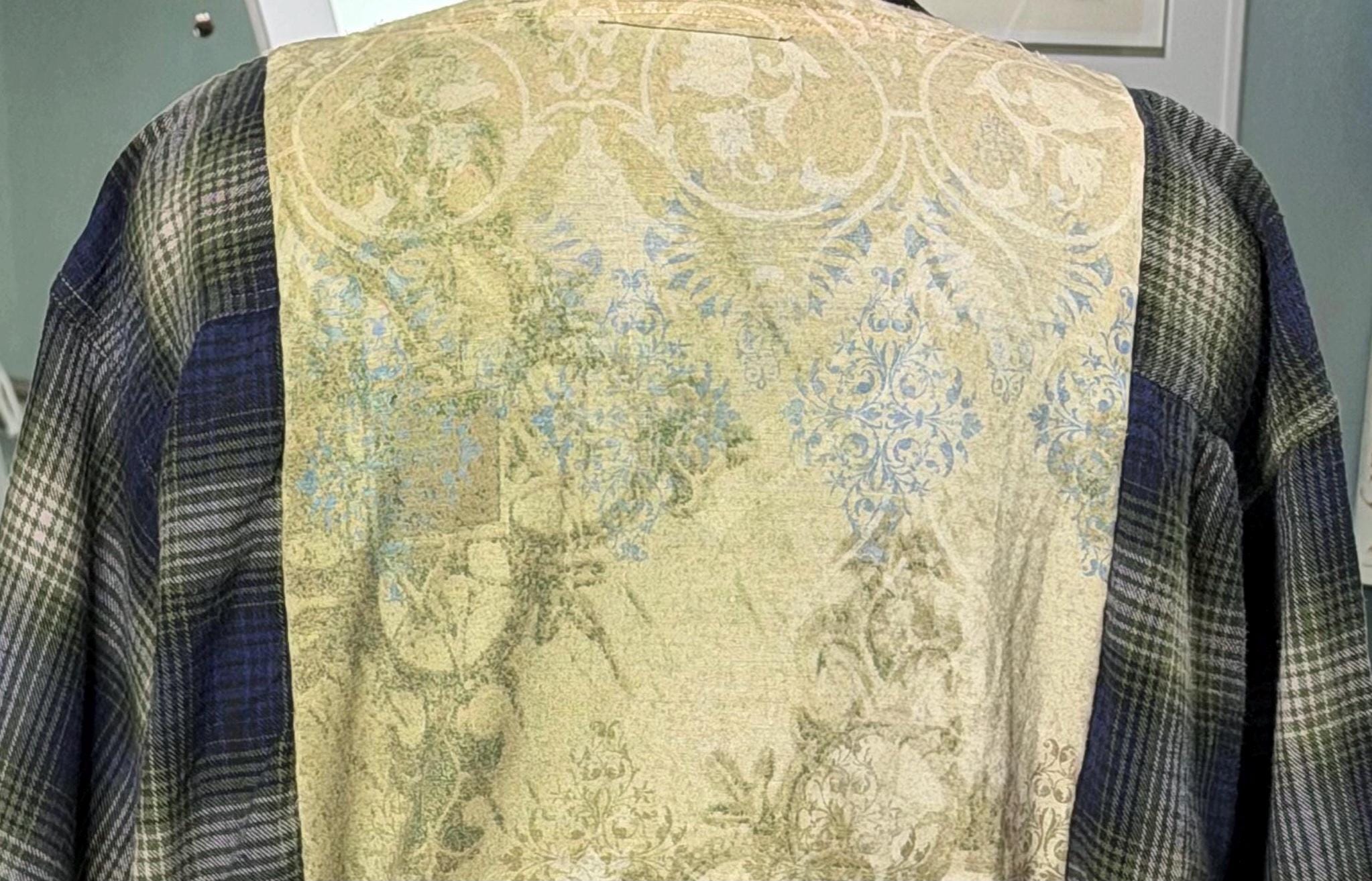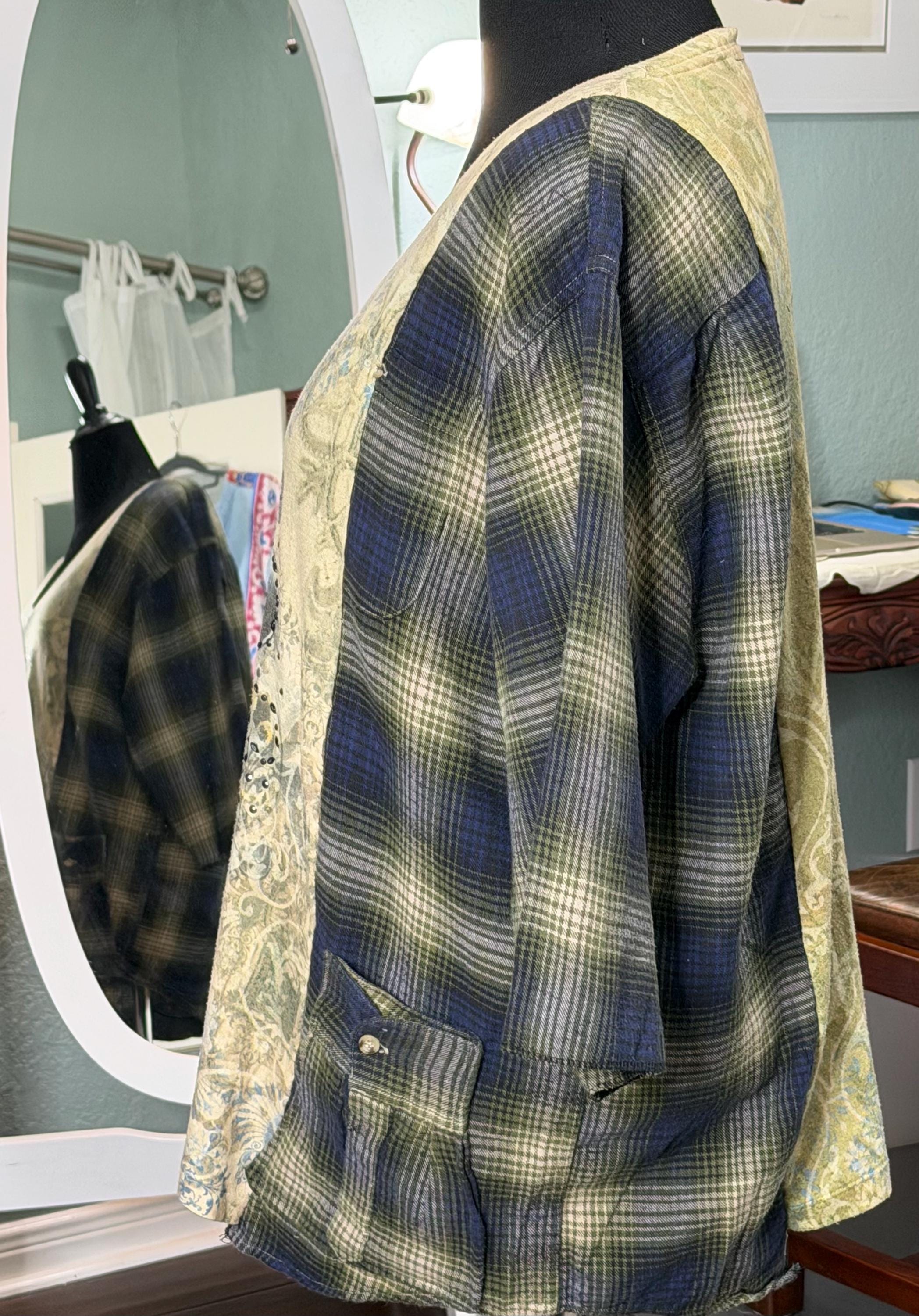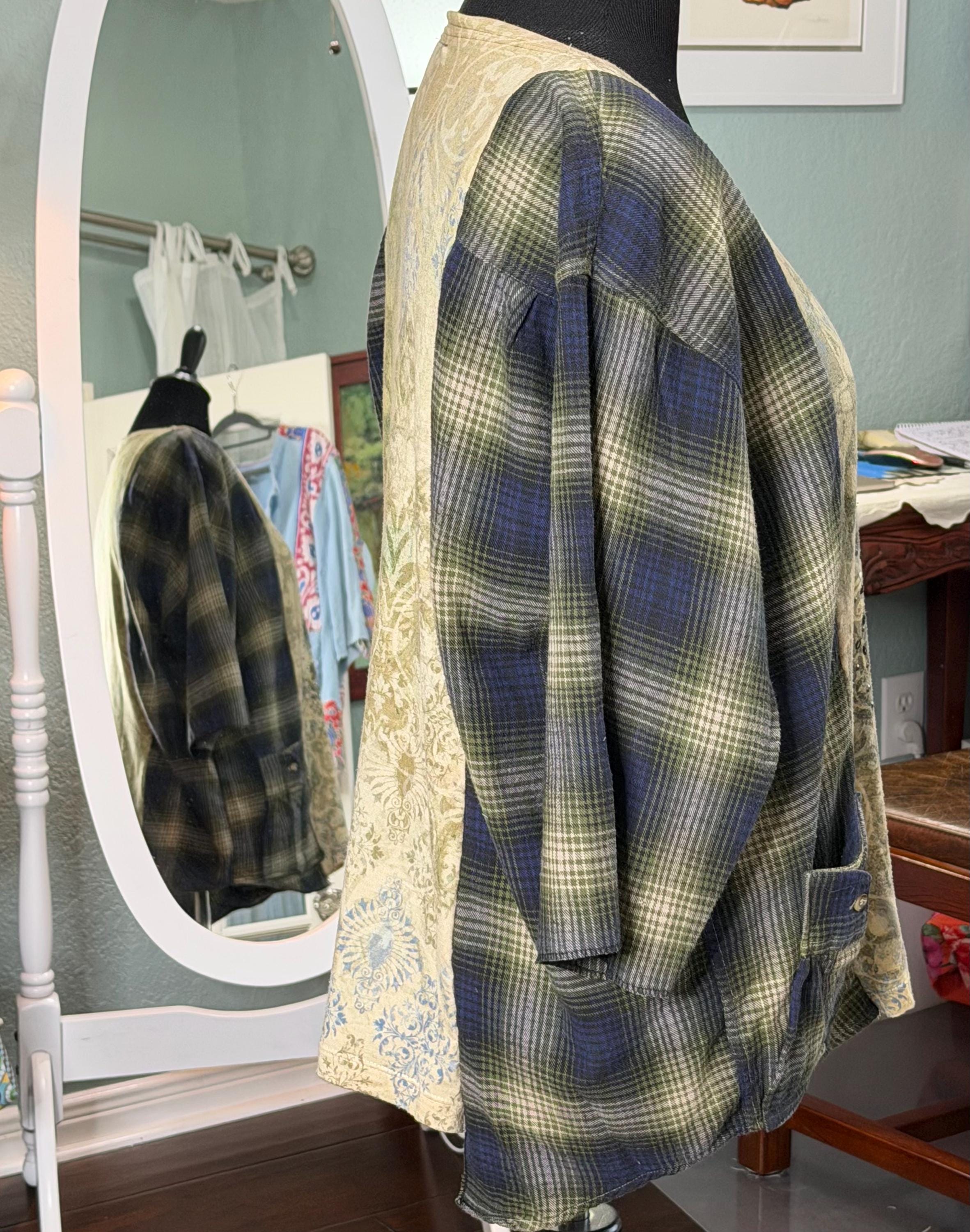 This beautiful one of a kind tunic is made from multiple coordinated pieces. The inspiration piece was the fluer de lis graphic tee. The sleeves and sides are soft flannel in a green and gold plaid.