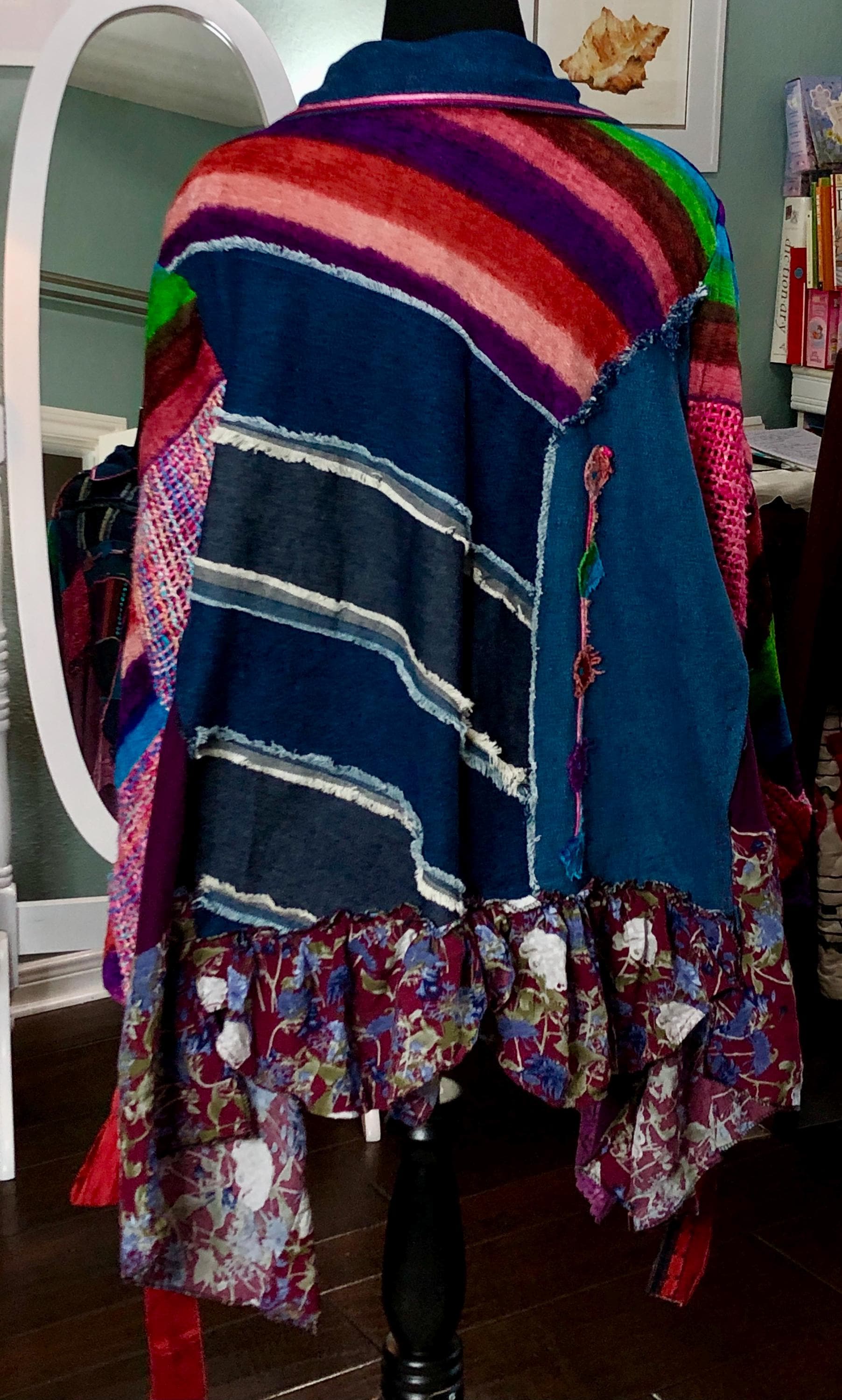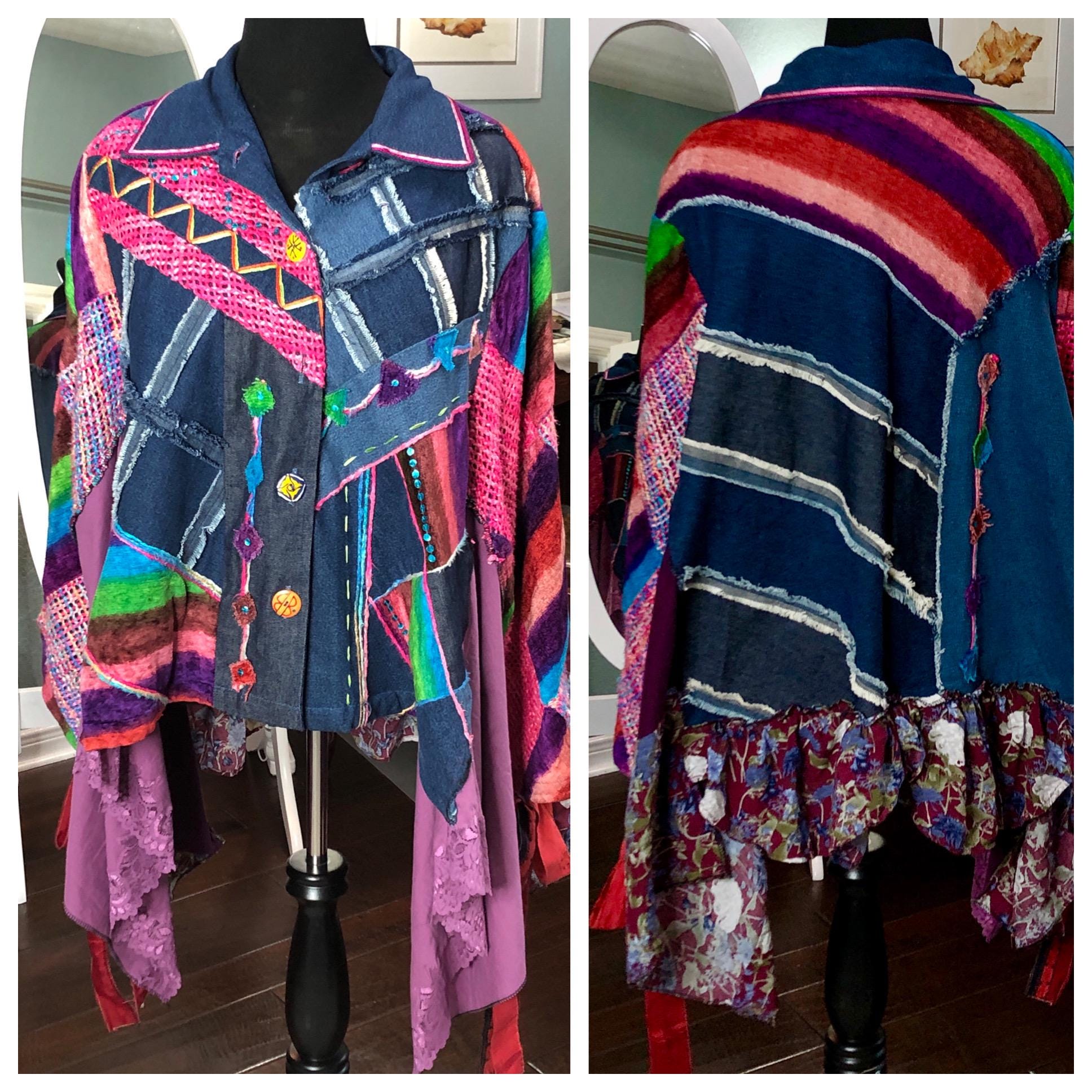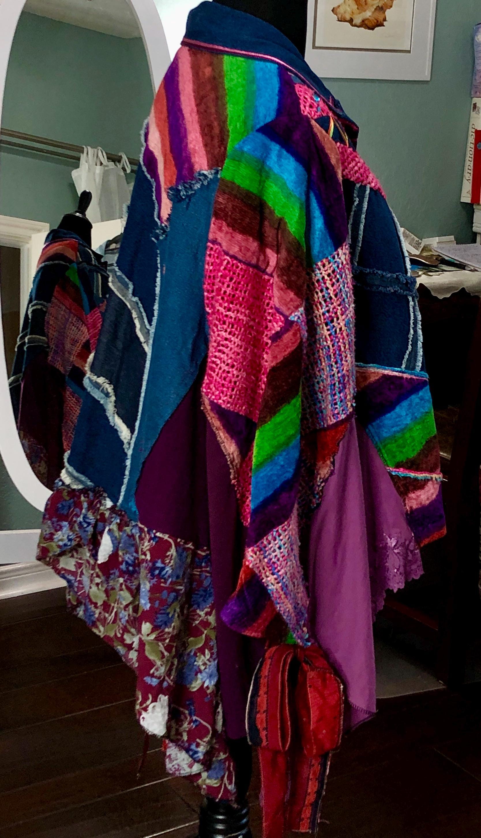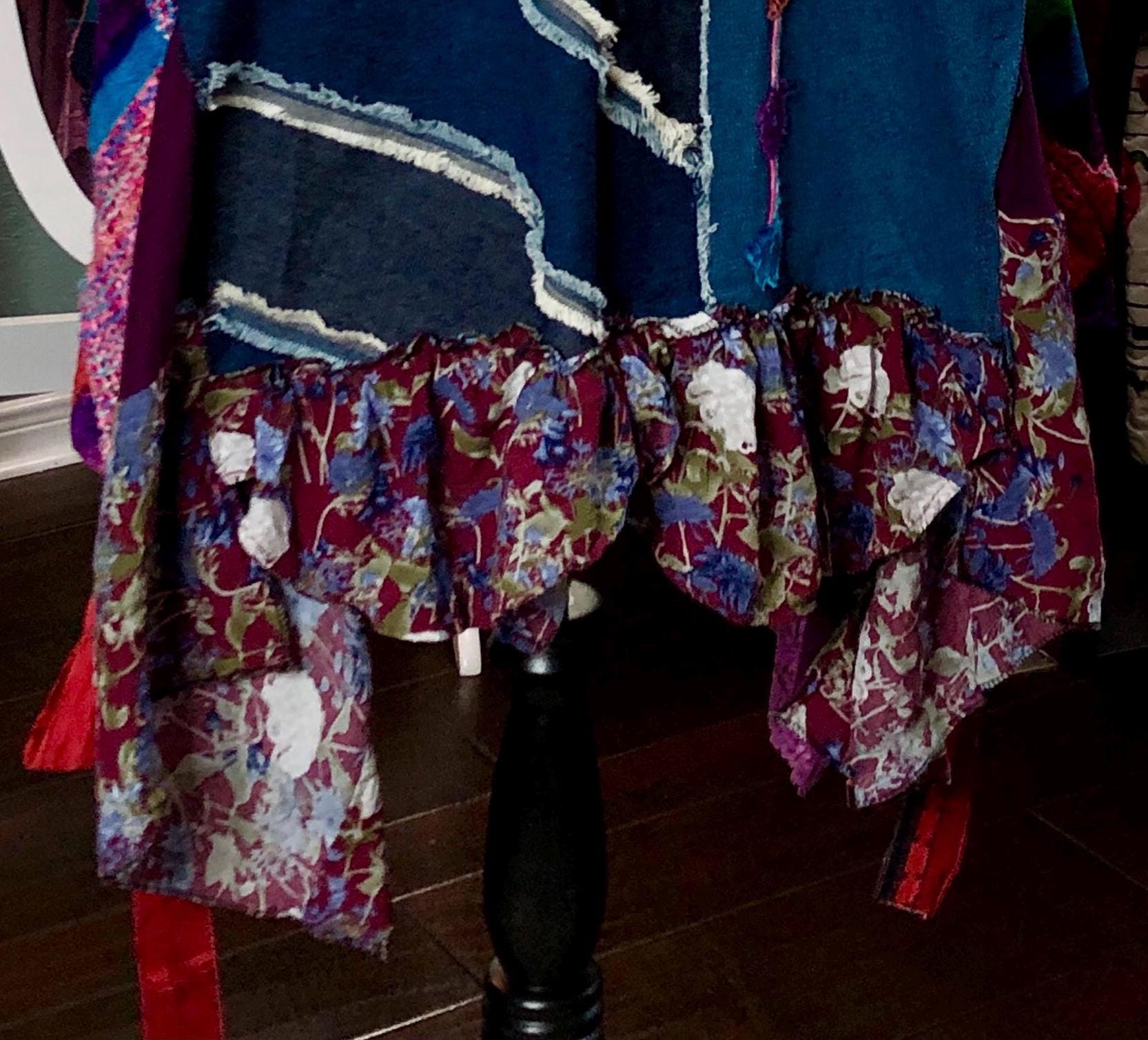 This one of a kind jacket is a statement piece to add to your closet. Dress it up or dress it down perfect with tights or jeans. The random patchwork is a work of art. The cape sleeves can be tied with the silk ribbons at the wrist for a more sleeve like fit. With the open sides this is a most size forgiving fit. The back ruffled hem is the perfect feminine touch for this upcycled piece.