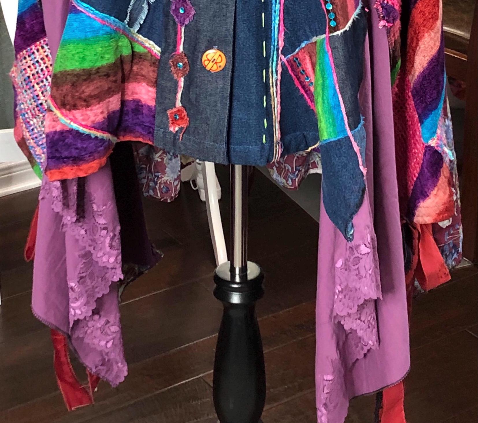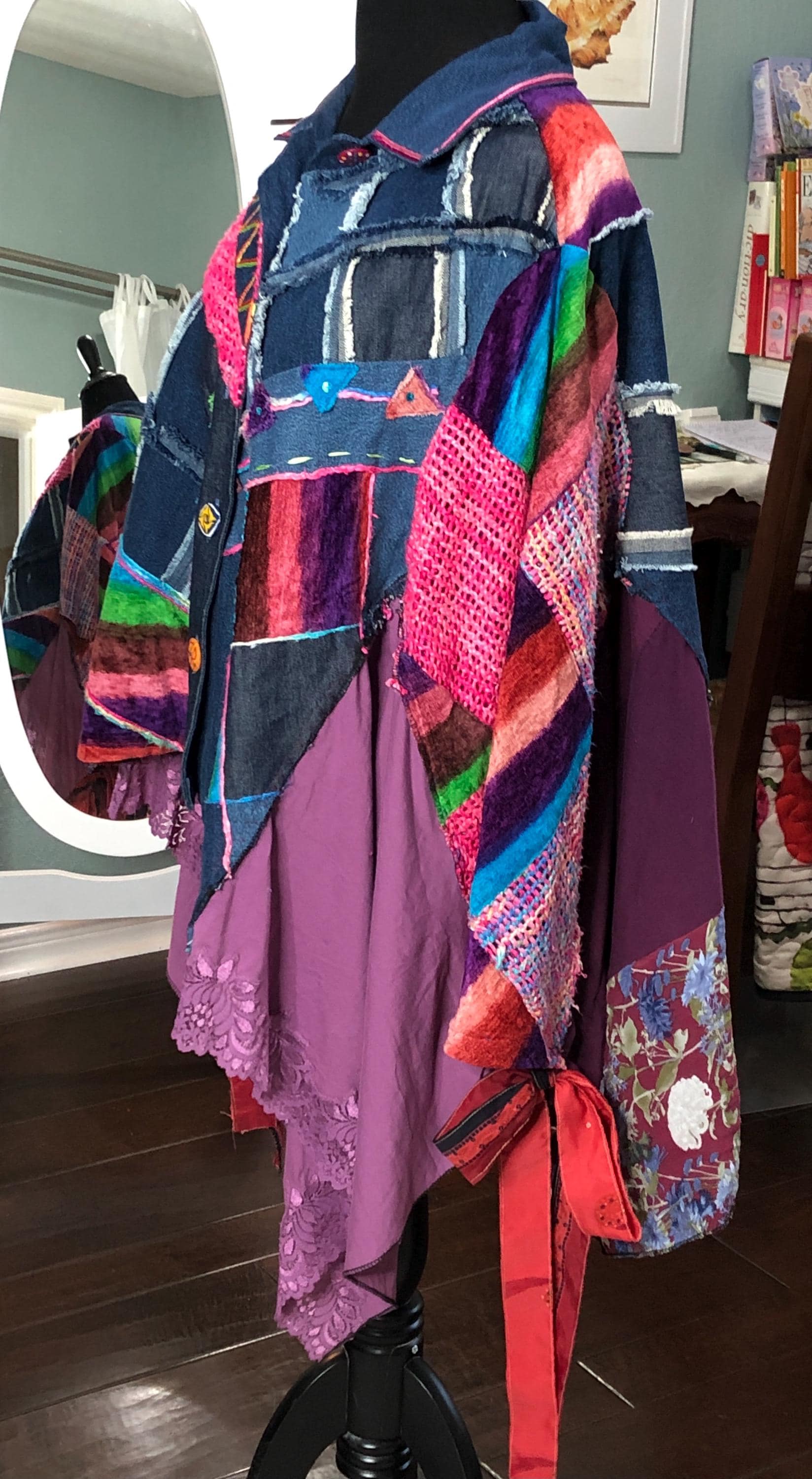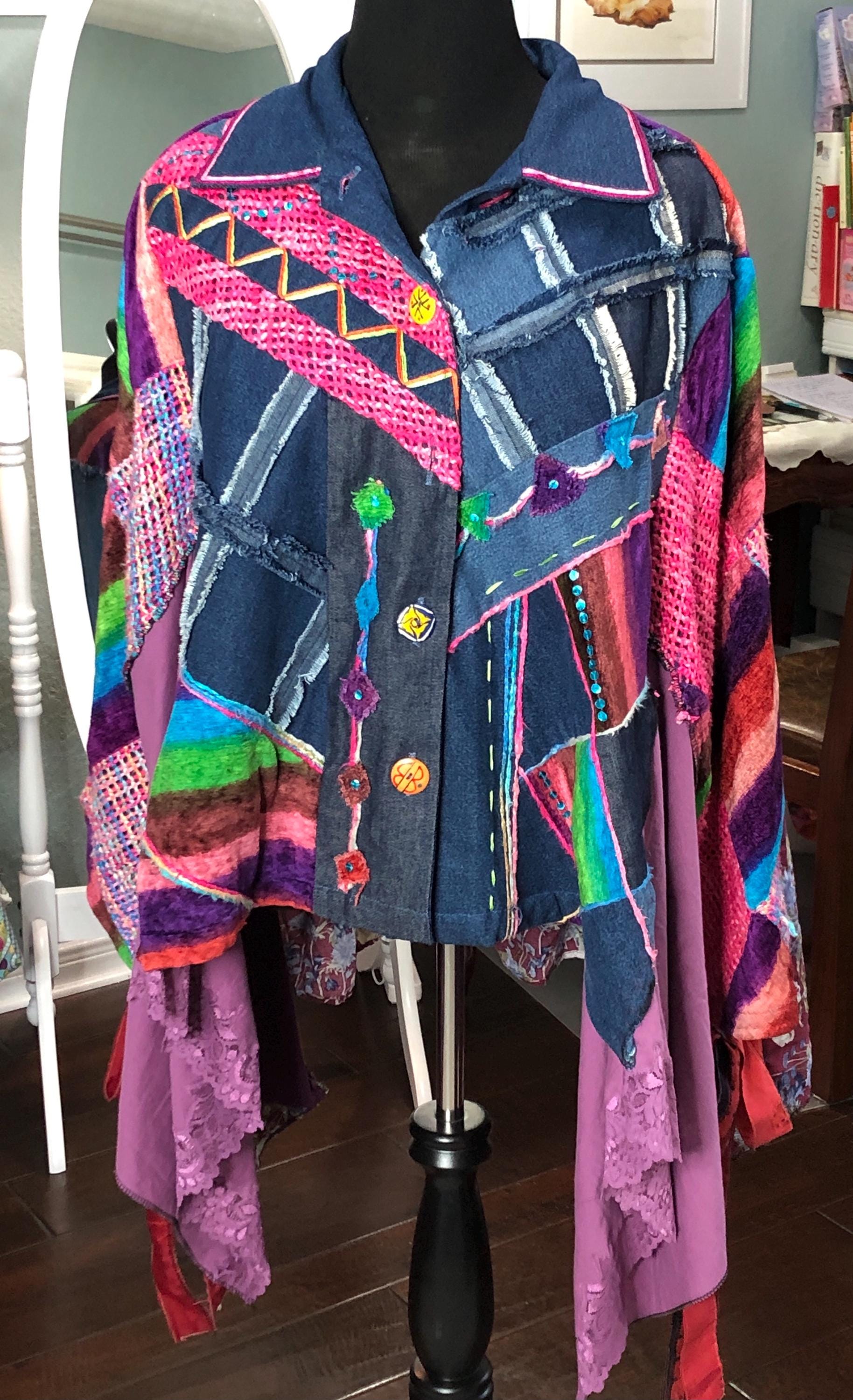 This one of a kind jacket is a statement piece to add to your closet. Dress it up or dress it down perfect with tights or jeans. The random patchwork is a work of art. The cape sleeves can be tied with the silk ribbons at the wrist for a more sleeve like fit. With the open sides this is a most size forgiving fit. The back ruffled hem is the perfect feminine touch for this upcycled piece.