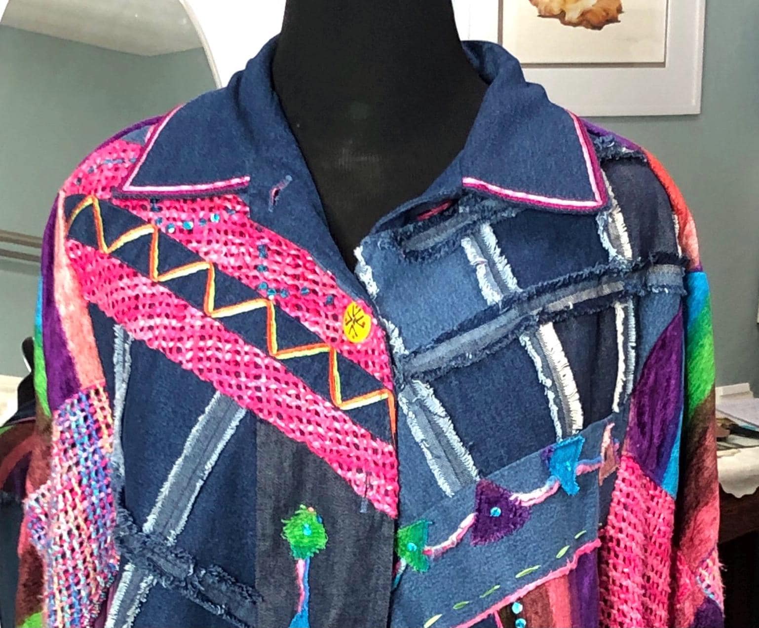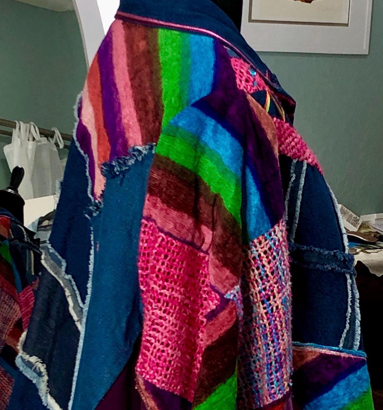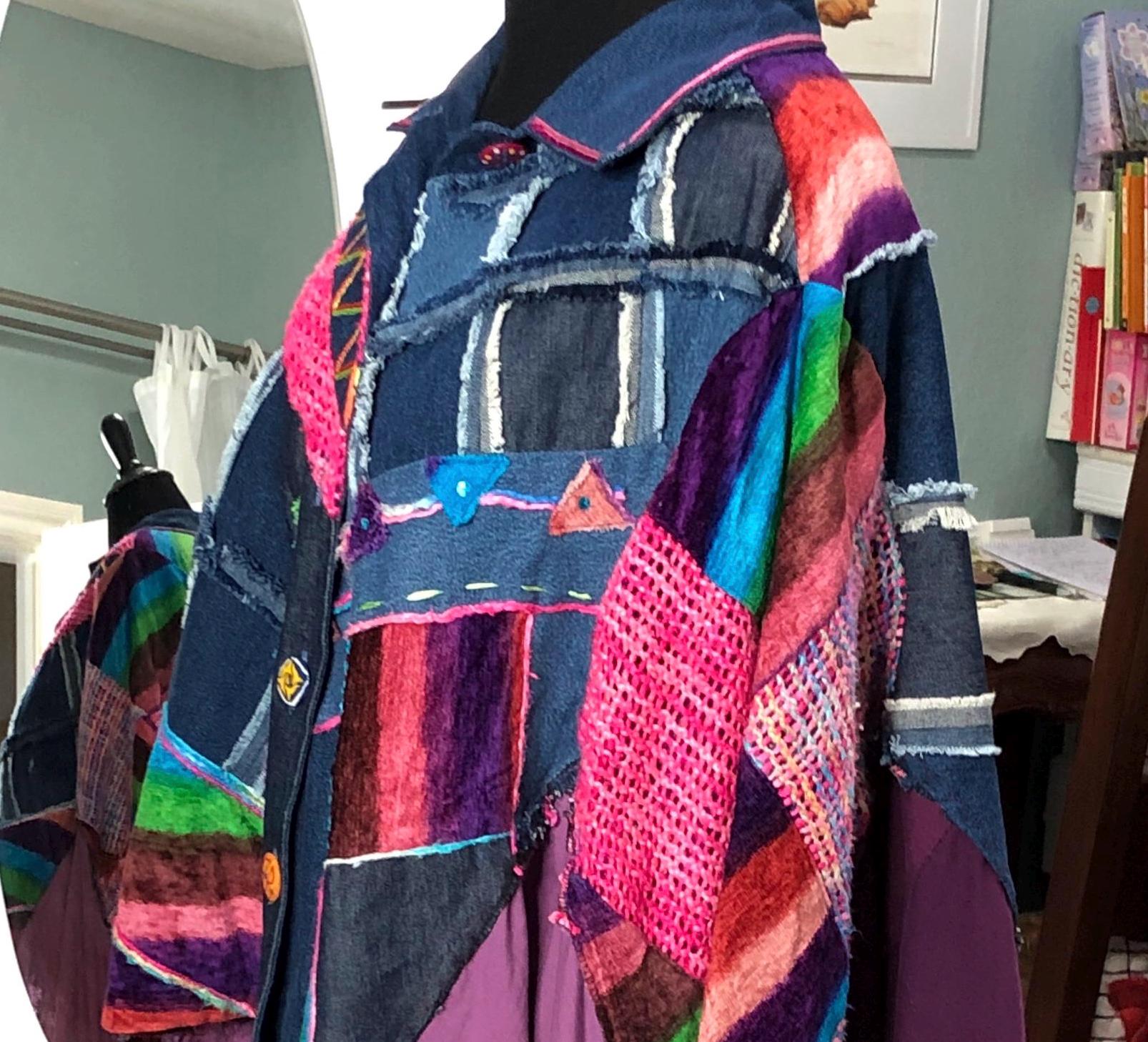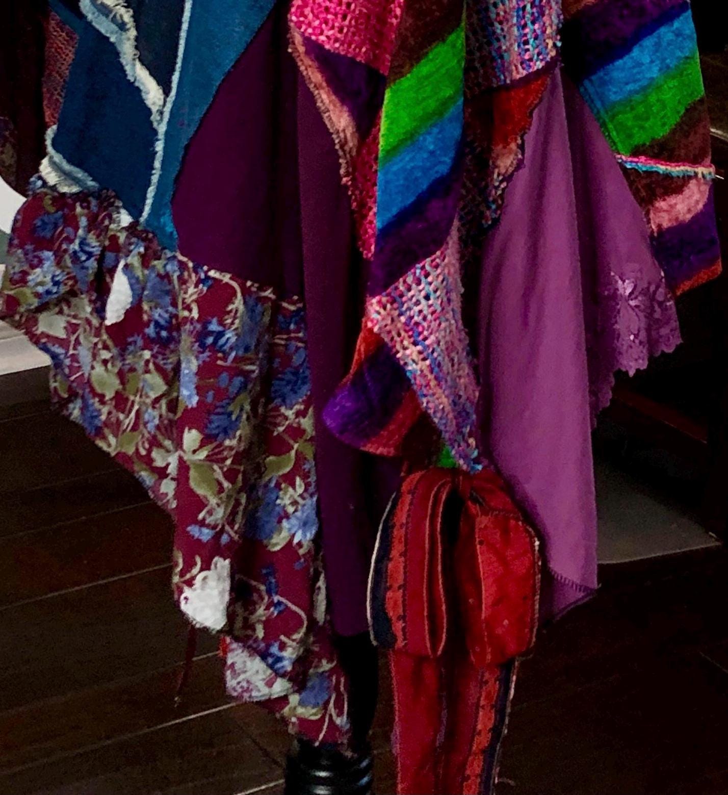 This one of a kind jacket is a statement piece to add to your closet. Dress it up or dress it down perfect with tights or jeans. The random patchwork is a work of art. The cape sleeves can be tied with the silk ribbons at the wrist for a more sleeve like fit. With the open sides this is a most size forgiving fit. The back ruffled hem is the perfect feminine touch for this upcycled piece.
