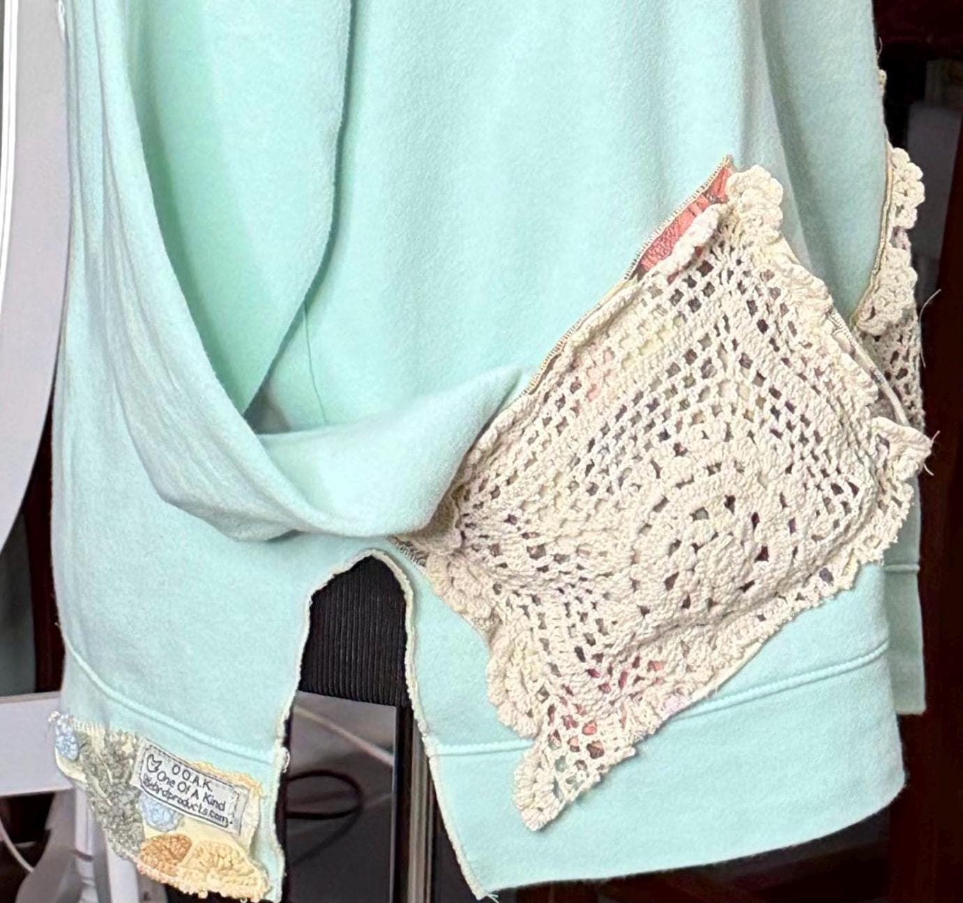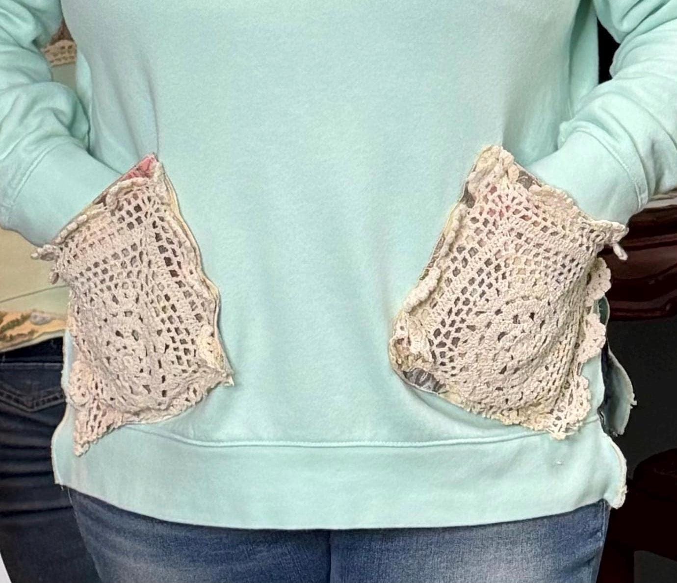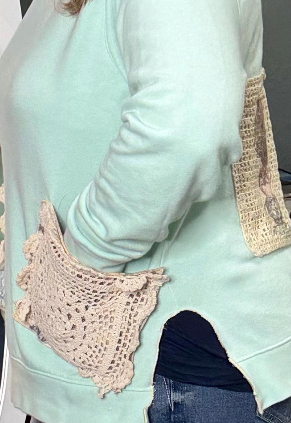 This one of a kind upcycled embroidered sweatshirt is paired with beautiful vintage crochet and lace to make it a one of a kind plus size “sweet” shirt top.