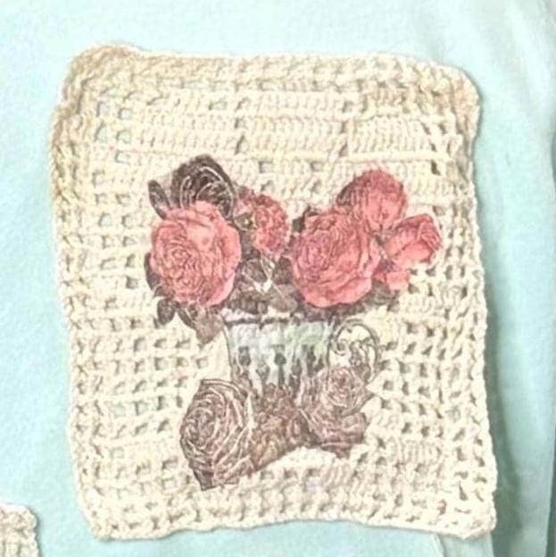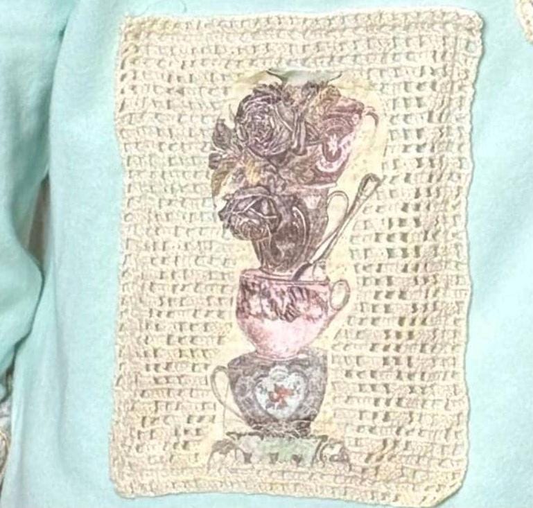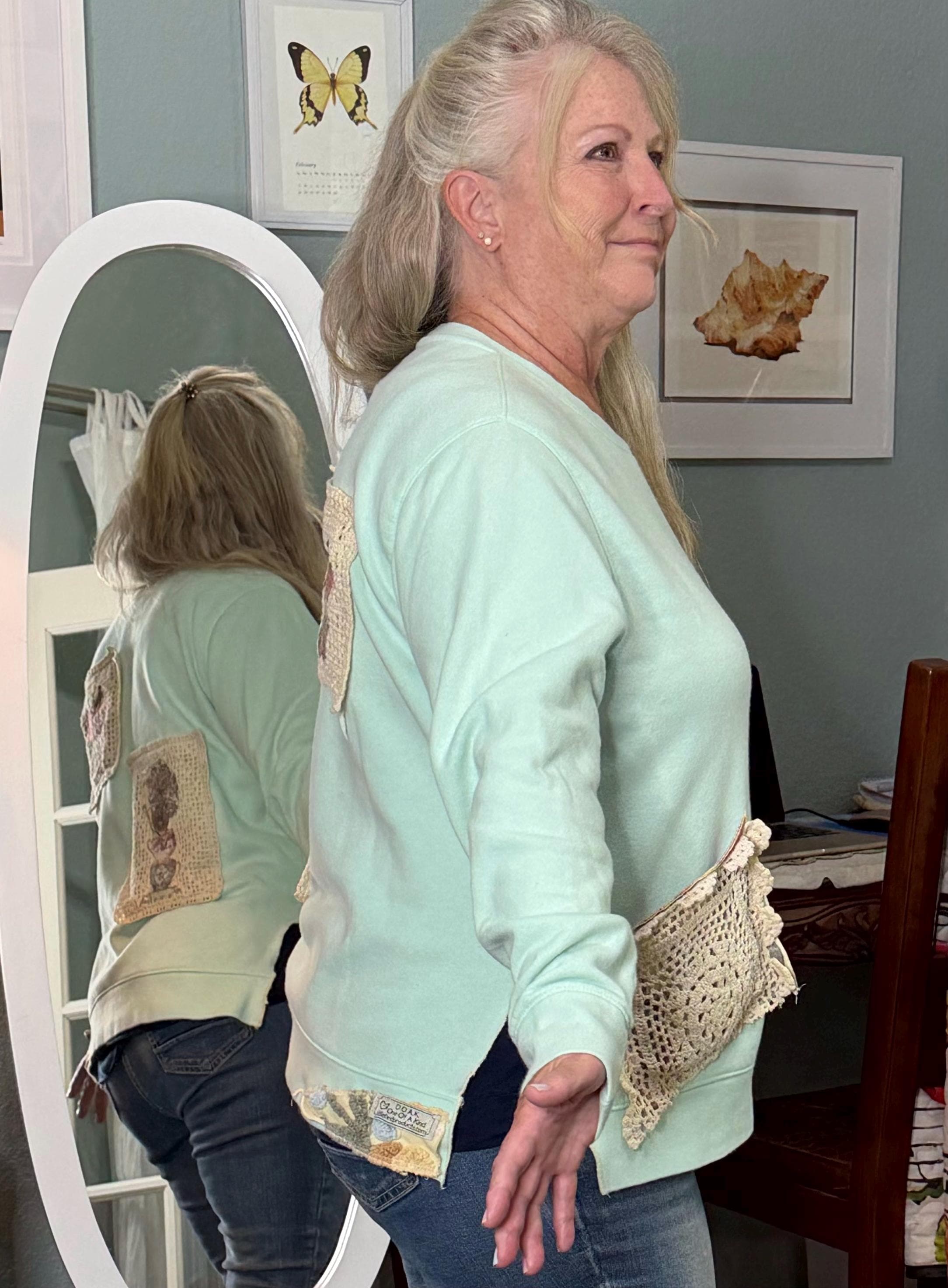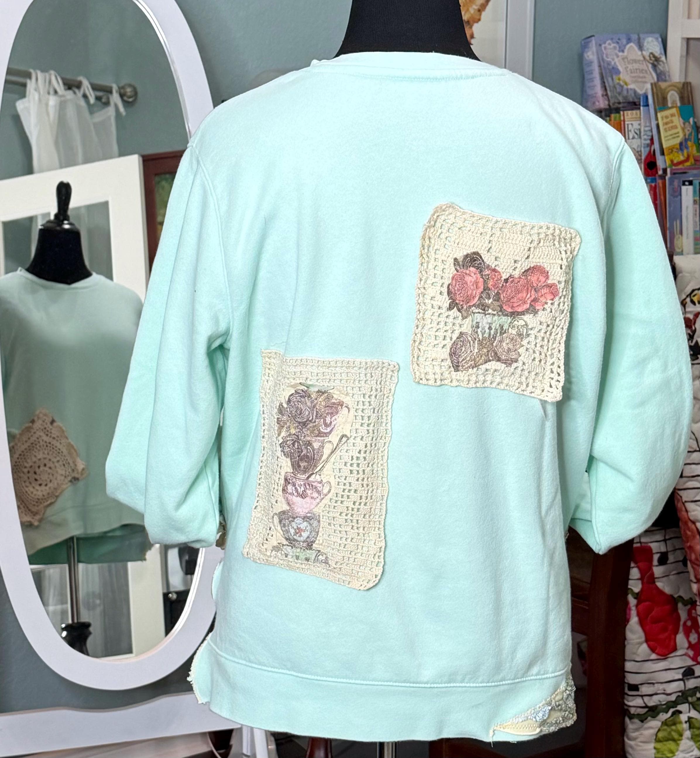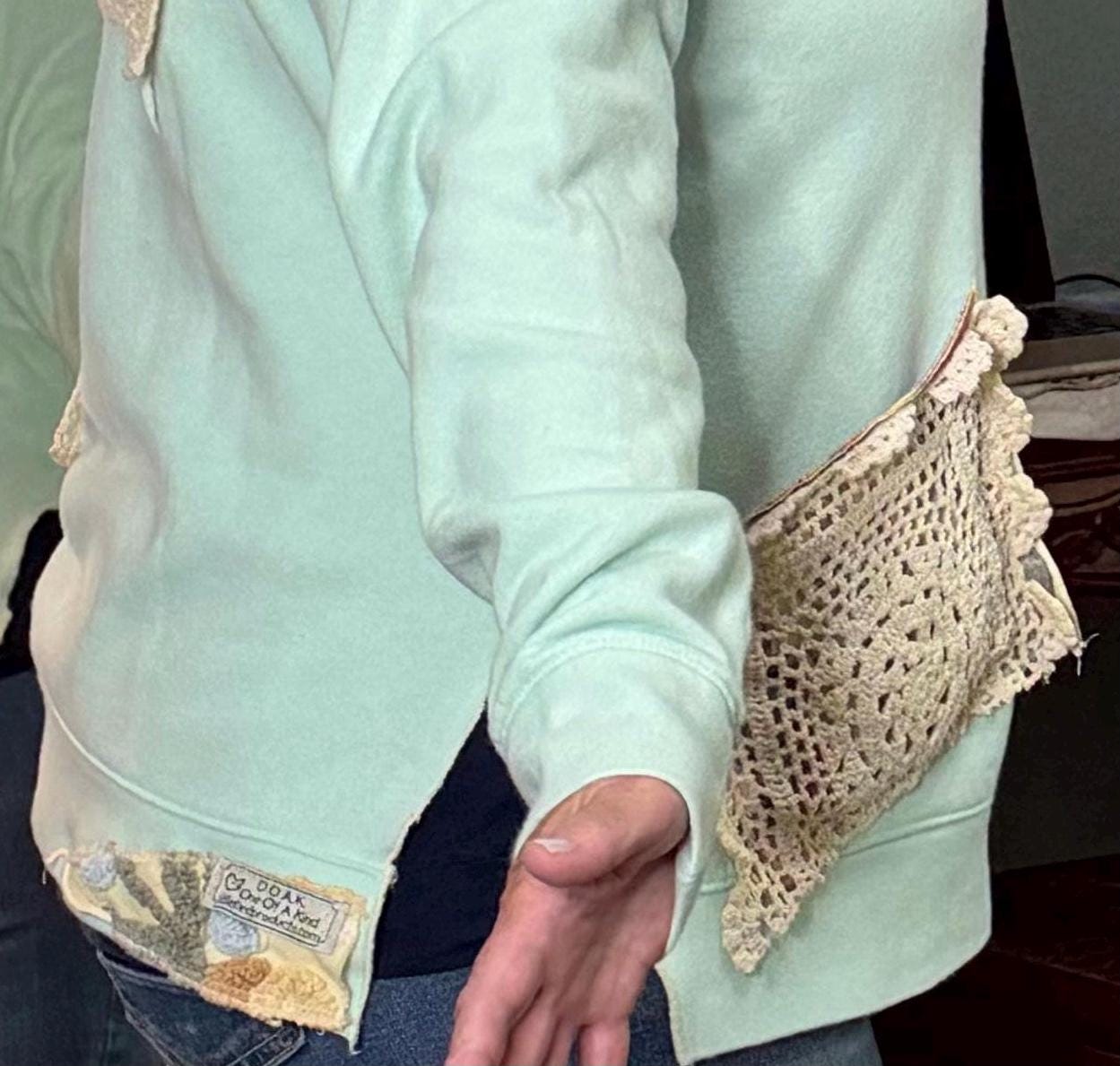 This one of a kind upcycled embroidered sweatshirt is paired with beautiful vintage crochet and lace to make it a one of a kind plus size “sweet” shirt top.