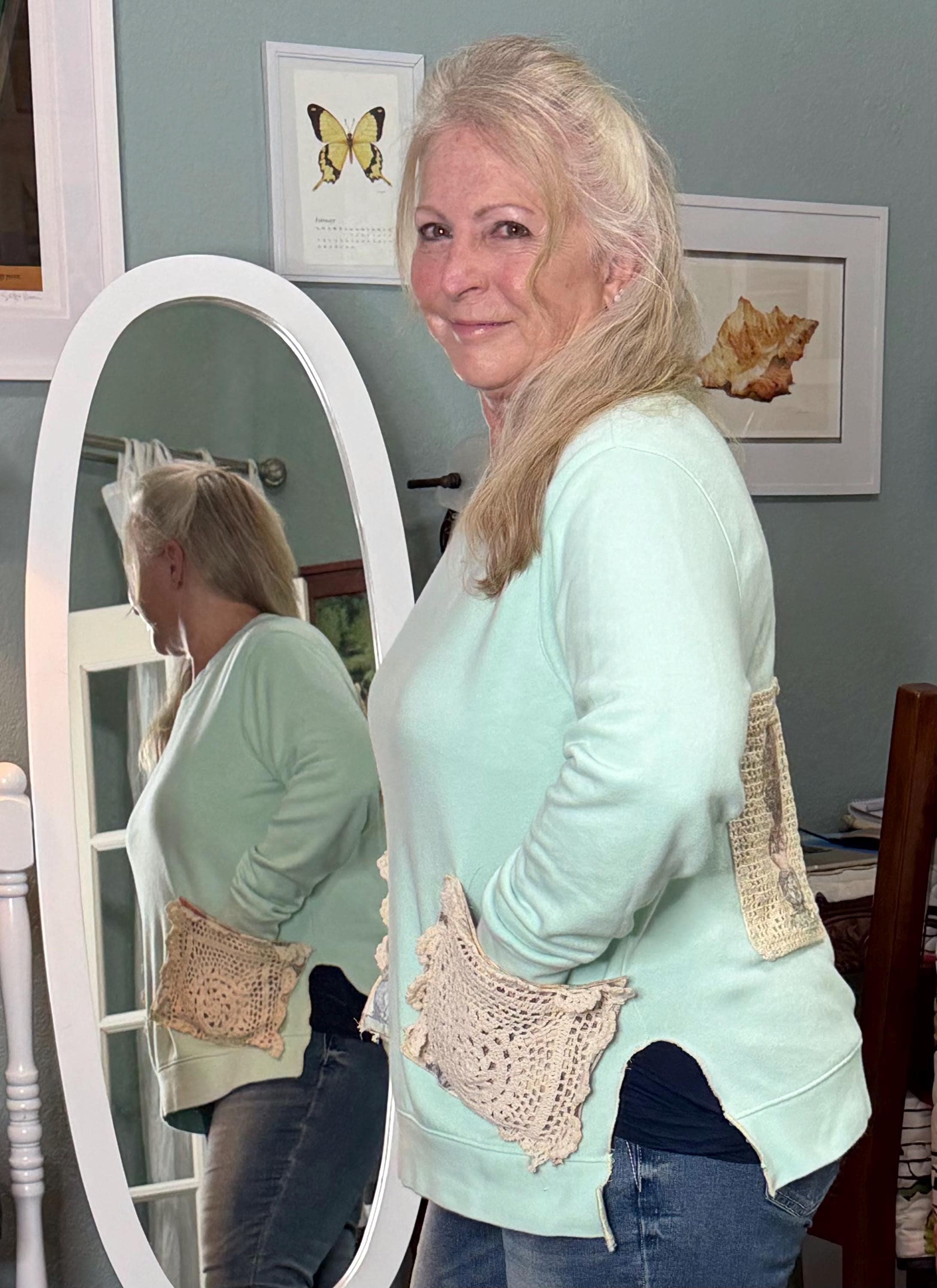 I have named this style Sweet Shirts because adding the vintage crocheted pieces along with lace and other sweet little bits and bobs you are sure to hear compliments on your sweet new shirt. Check out the sweet side pockets too.