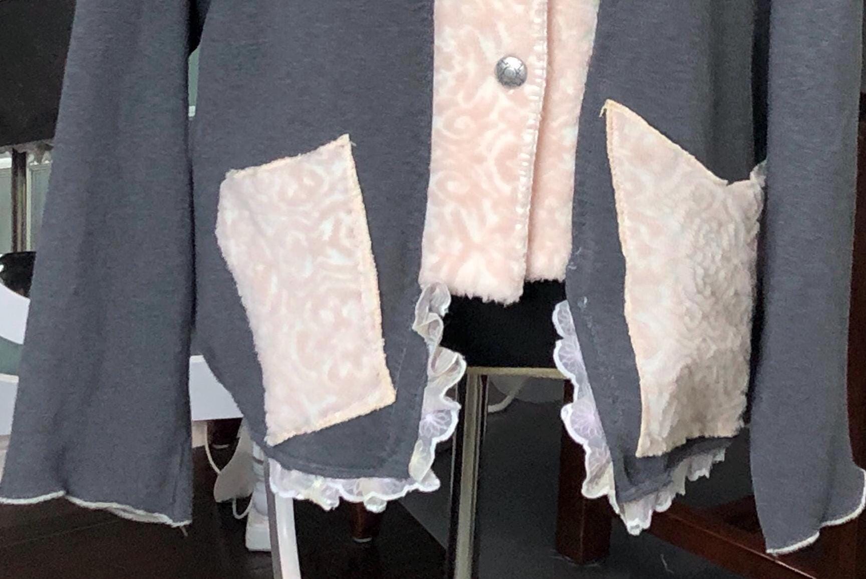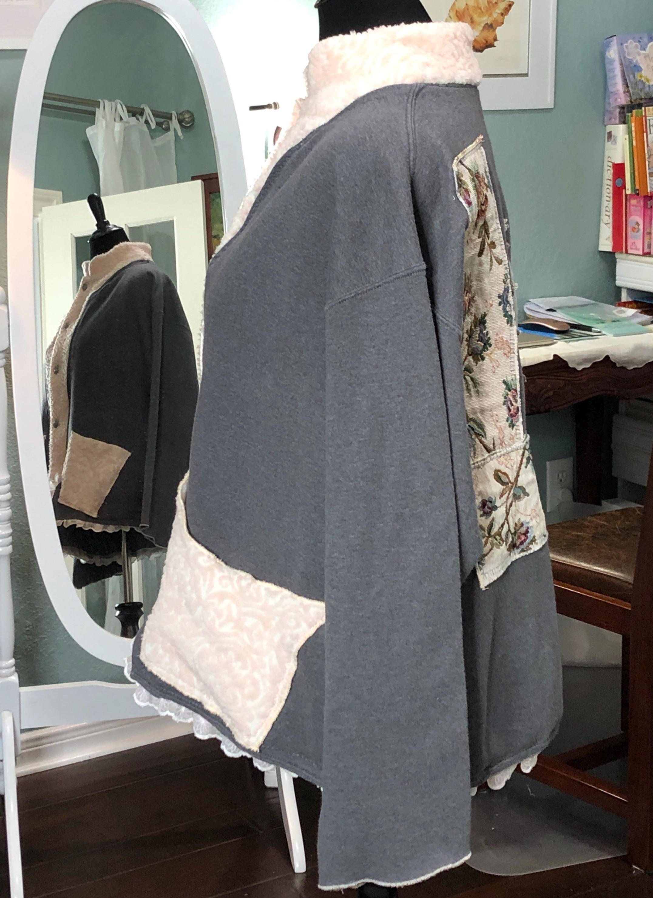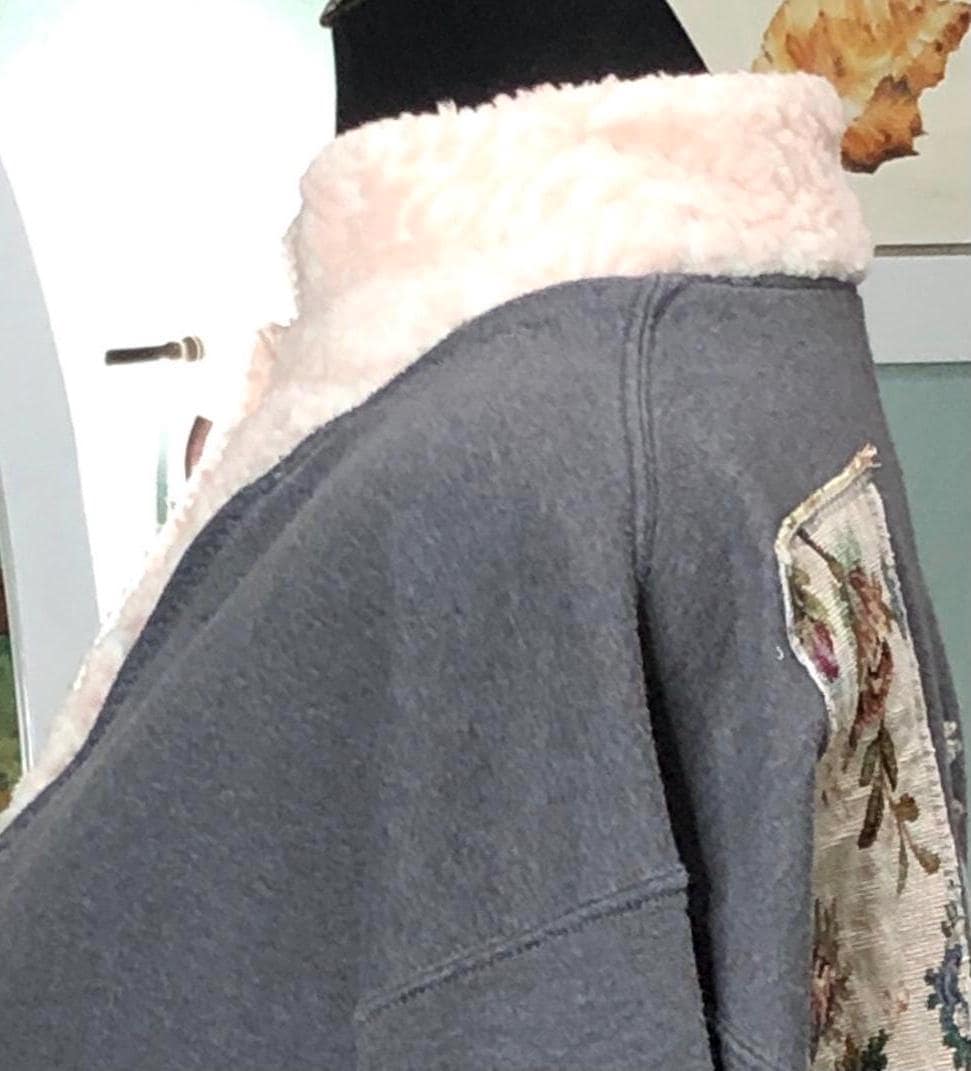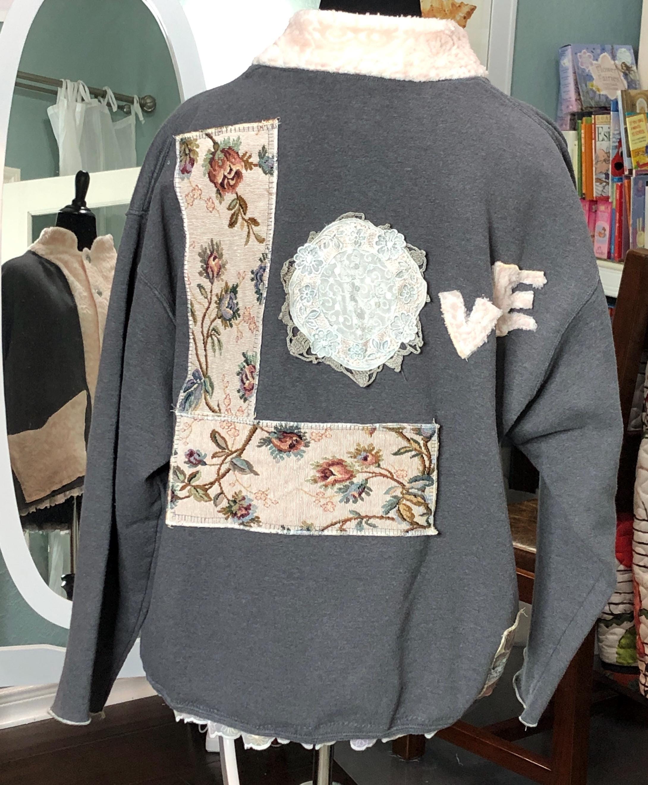 This one of a kind upcycled gray sweatshirt is paired with the collar and silver button front of a pink fleece jacket. Pieces of beautiful vintage crochet and lace make it a one of a kind plus size “sweet” shirt jacket. With the LOVE appliqué on back this is the perfect gift for her for Mothers Day or any day.