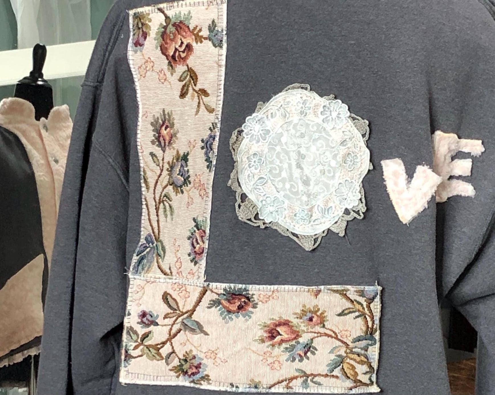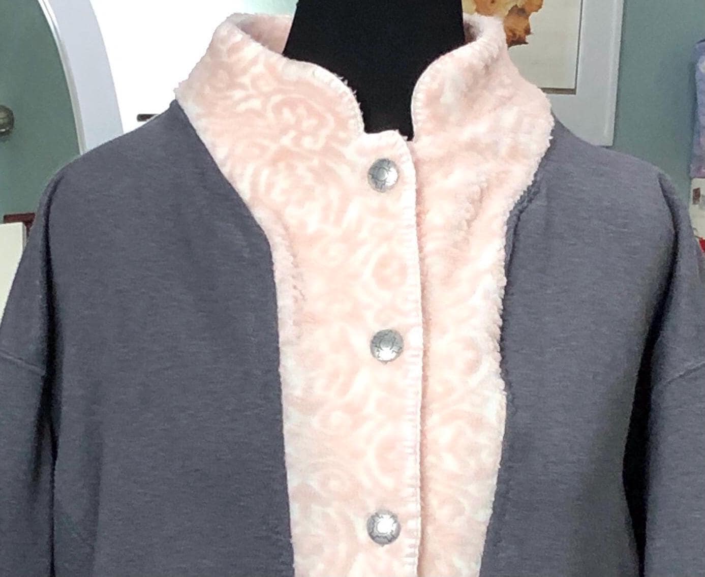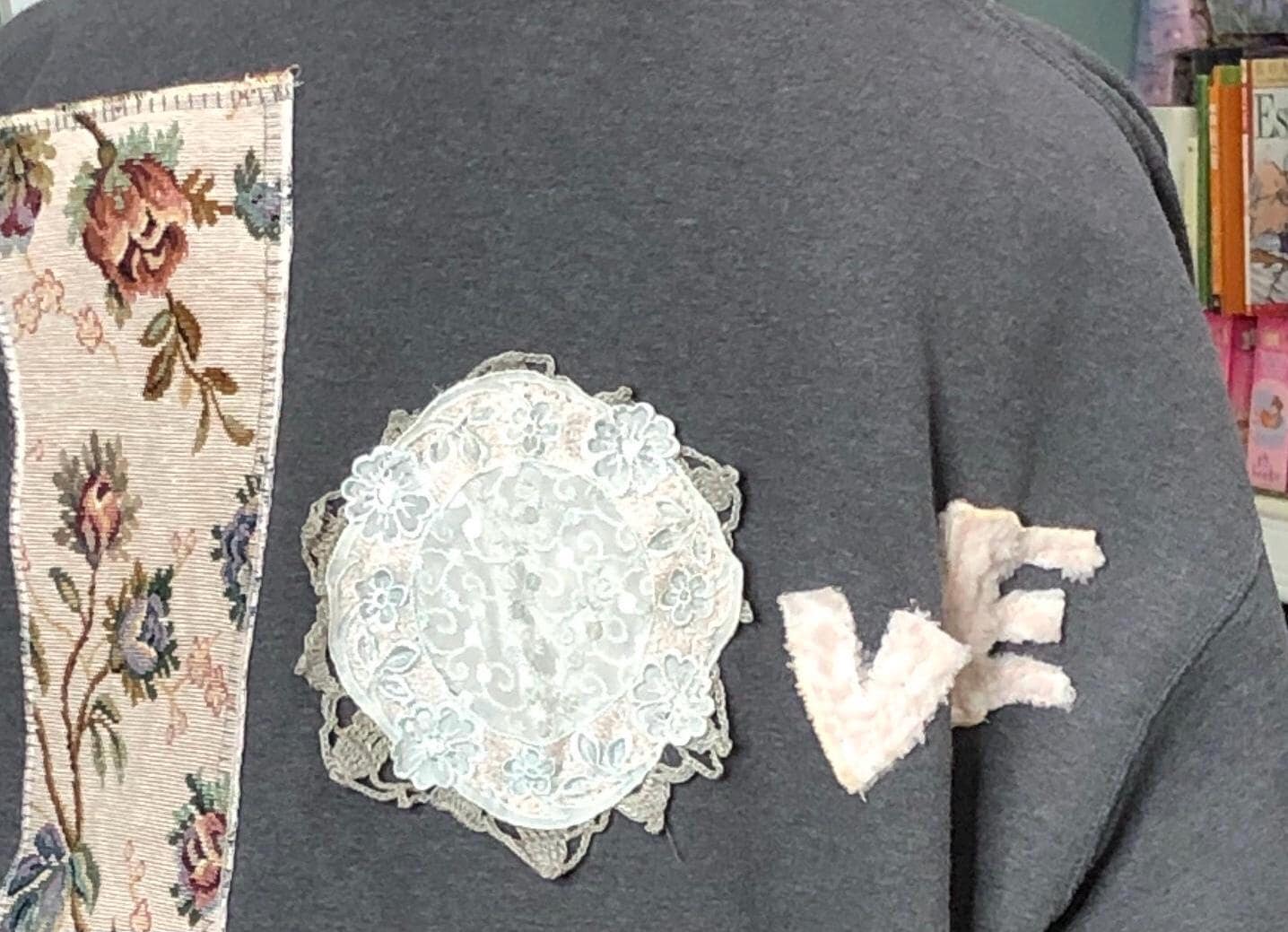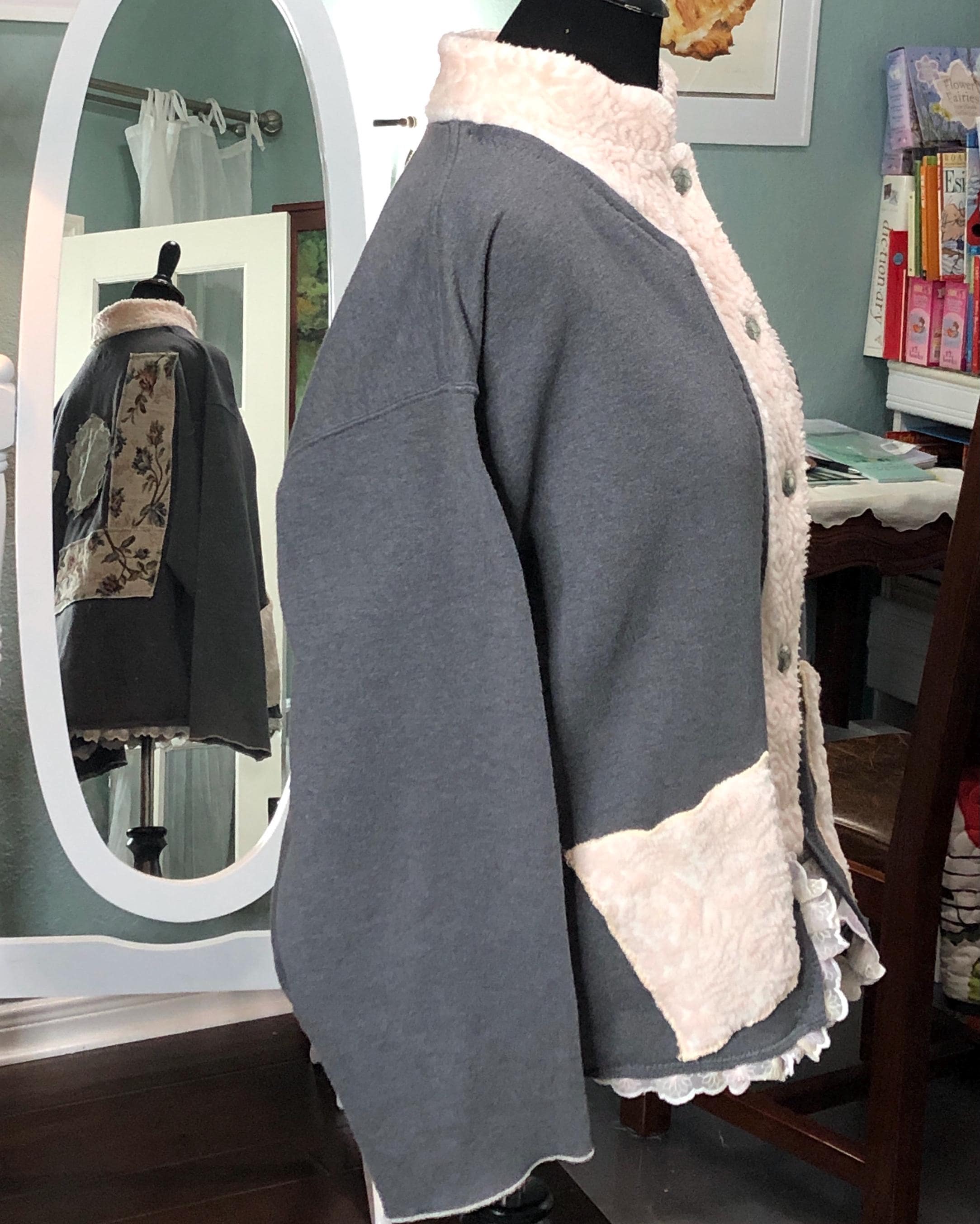 This one of a kind upcycled gray sweatshirt is paired with the collar and silver button front of a pink fleece jacket. Pieces of beautiful vintage crochet and lace make it a one of a kind plus size “sweet” shirt jacket. With the LOVE appliqué on back this is the perfect gift for her for Mothers Day or any day.
