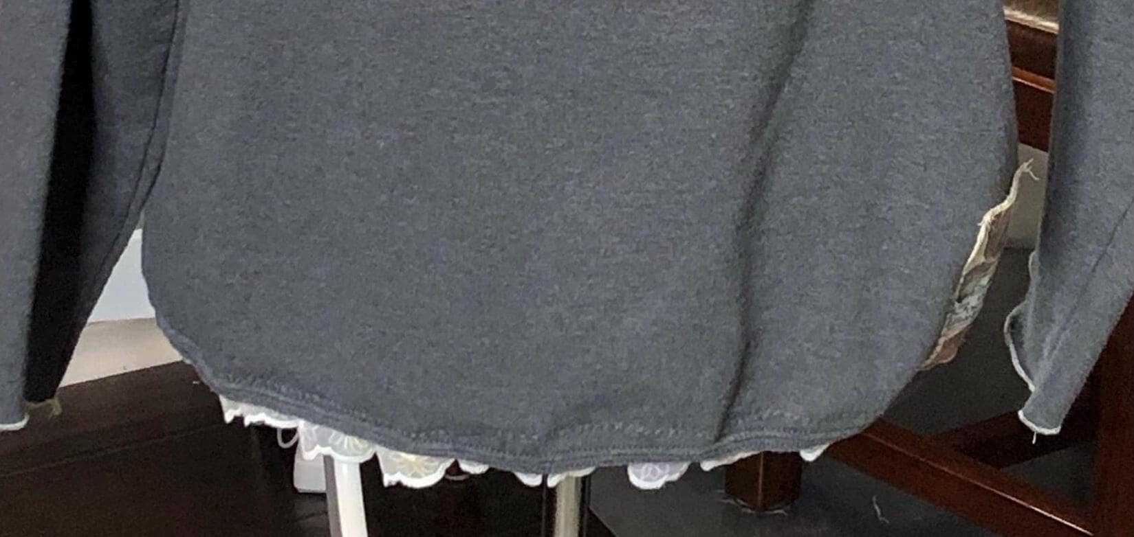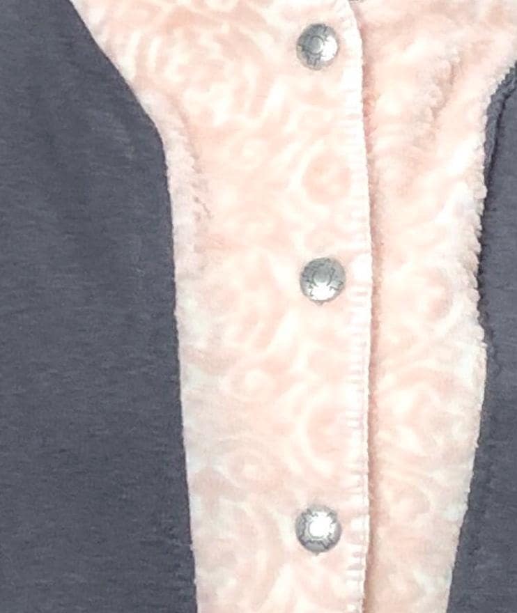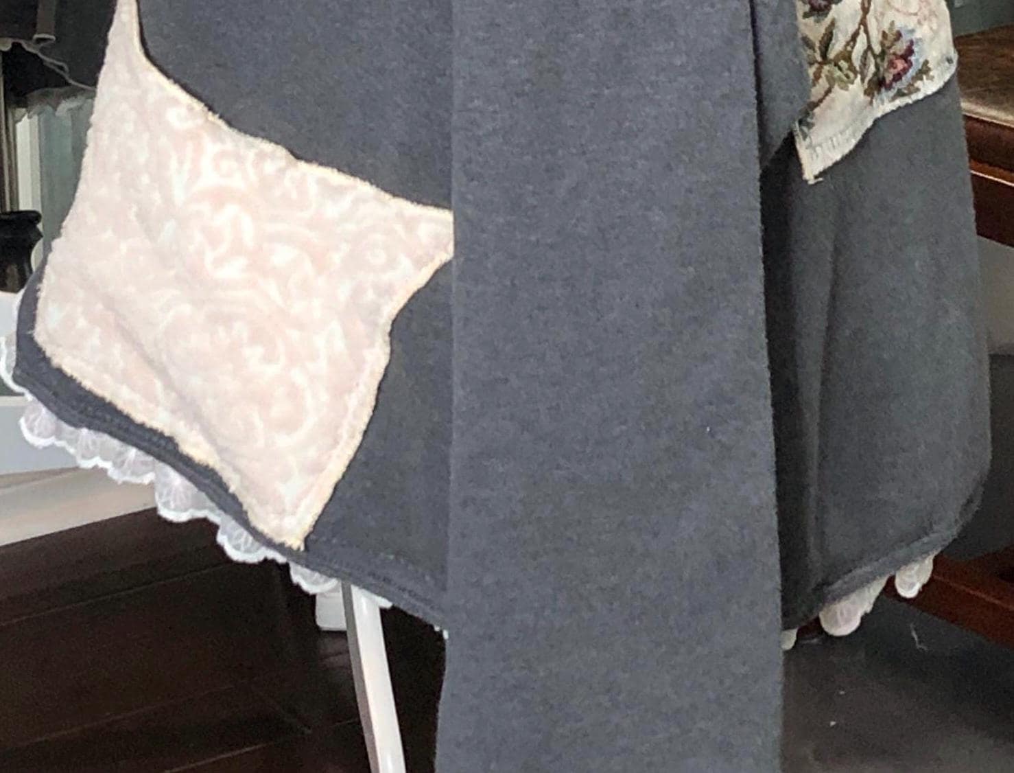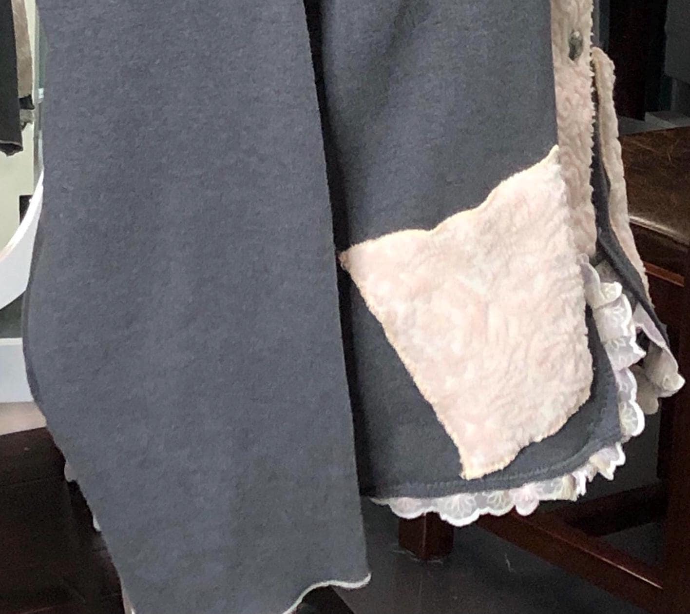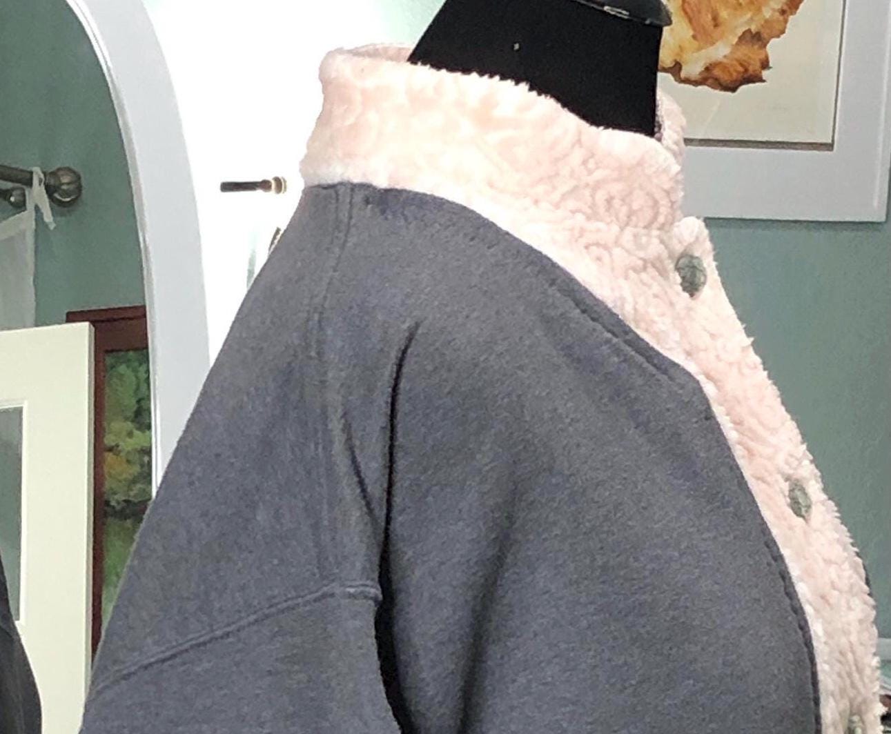 This one of a kind upcycled gray sweatshirt is paired with the collar and silver button front of a pink fleece jacket. Pieces of beautiful vintage crochet and lace make it a one of a kind plus size “sweet” shirt jacket. With the LOVE appliqué on back this is the perfect gift for her for Mothers Day or any day.