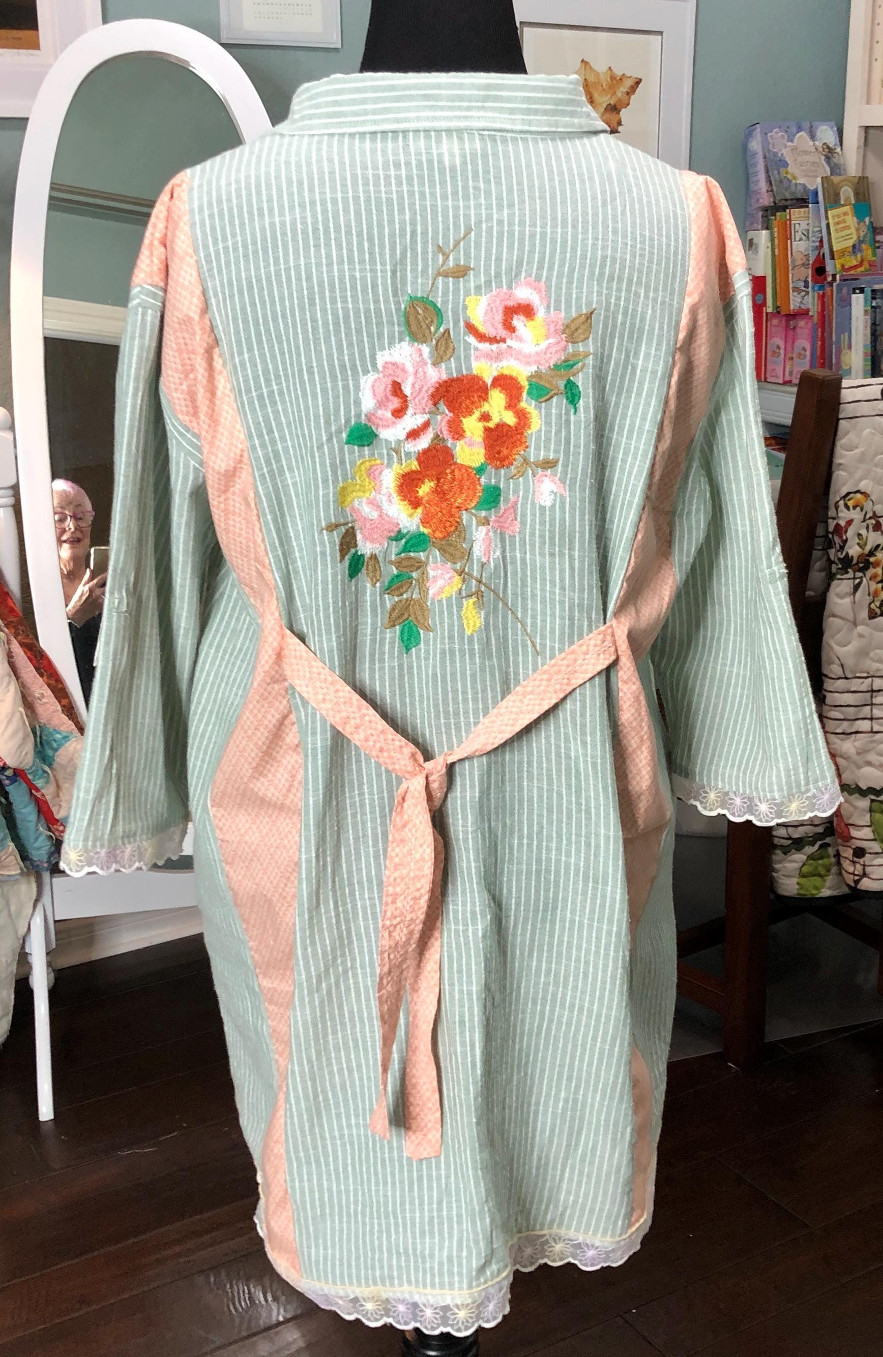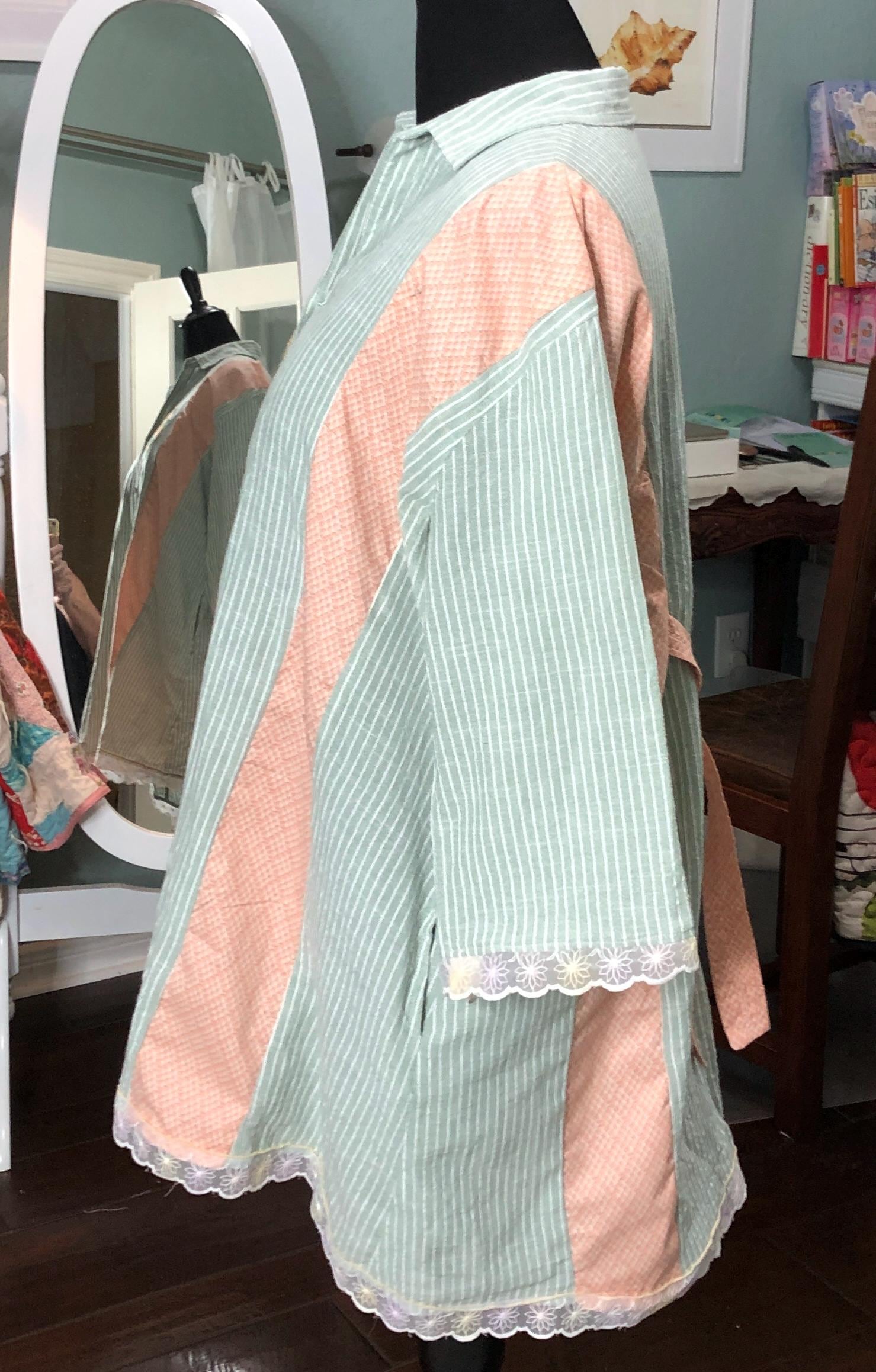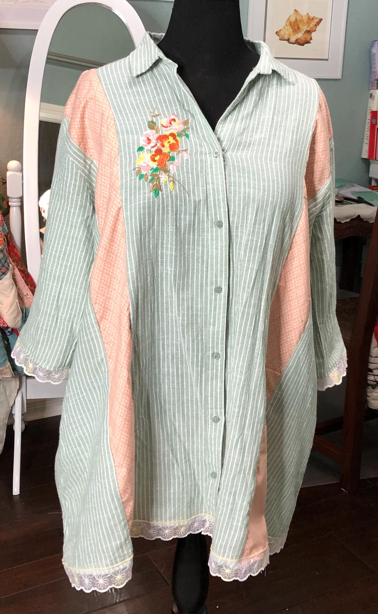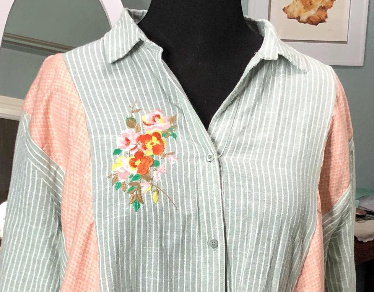 This one of a kind upcycled button front tunic top is extra special. The button front top is celery green with a light pin stripe cotton linen like frabric. The peach orange cotton stripe on front and back widens the top to a comfy 2X fit. The front and back are beautifully embroidered with flowers. The quarter sleeves and bottom are trimmed with vintage flower lace trim.
