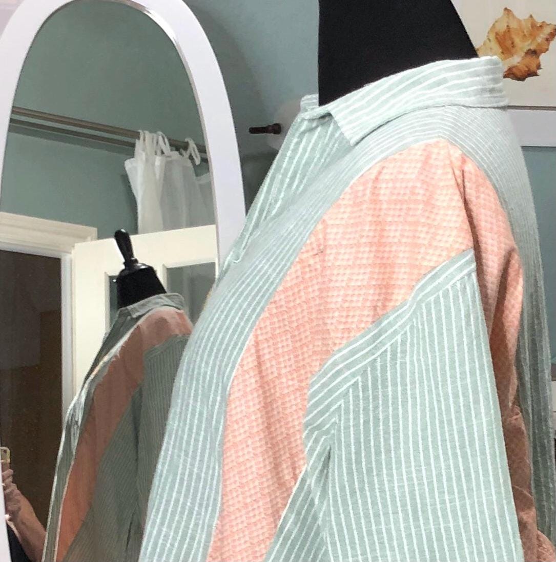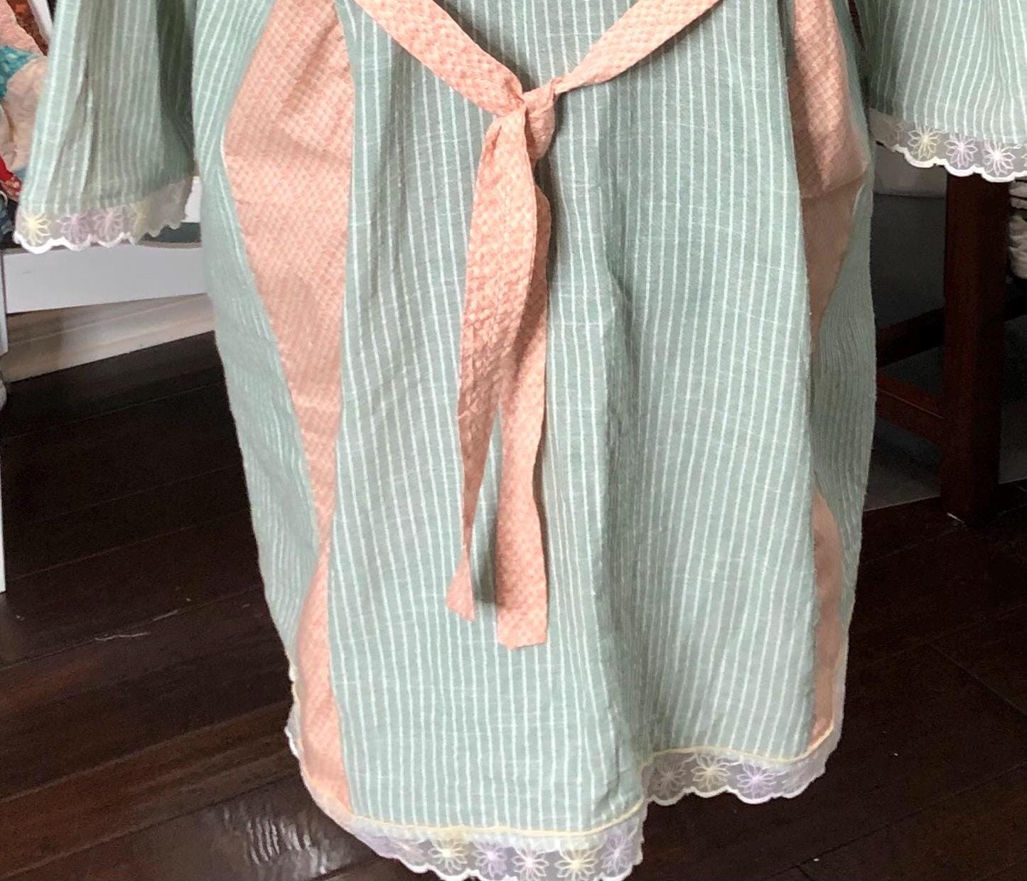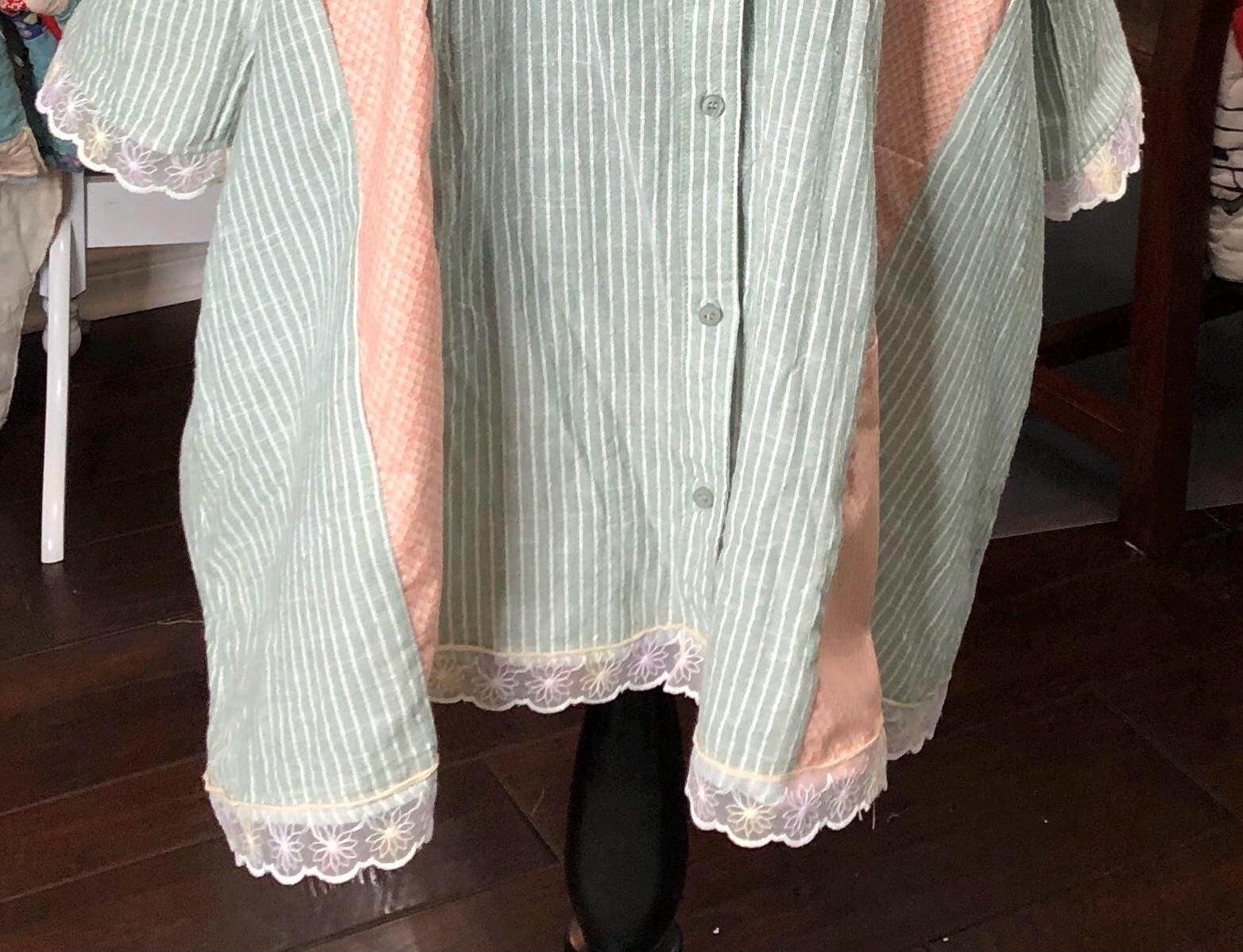This one of a kind upcycled button front tunic top is extra special. The button front top is celery green with a light pin stripe cotton linen like frabric. The peach orange cotton stripe on front and back widens the top to a comfy 2X fit. The front and back are beautifully embroidered with flowers. The quarter sleeves and bottom are trimmed with vintage flower lace trim.