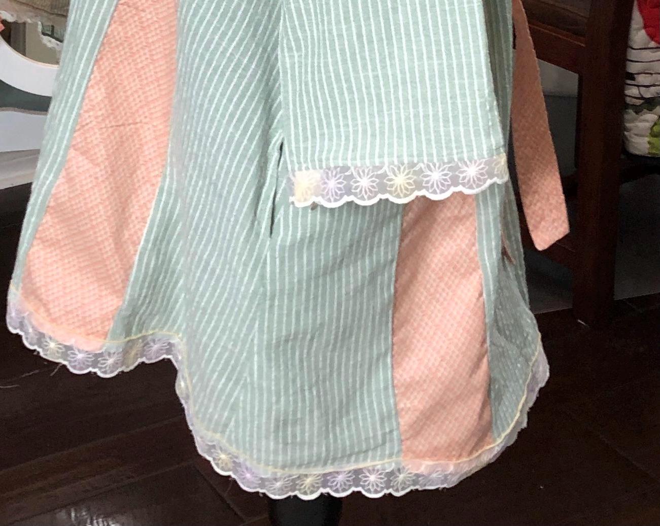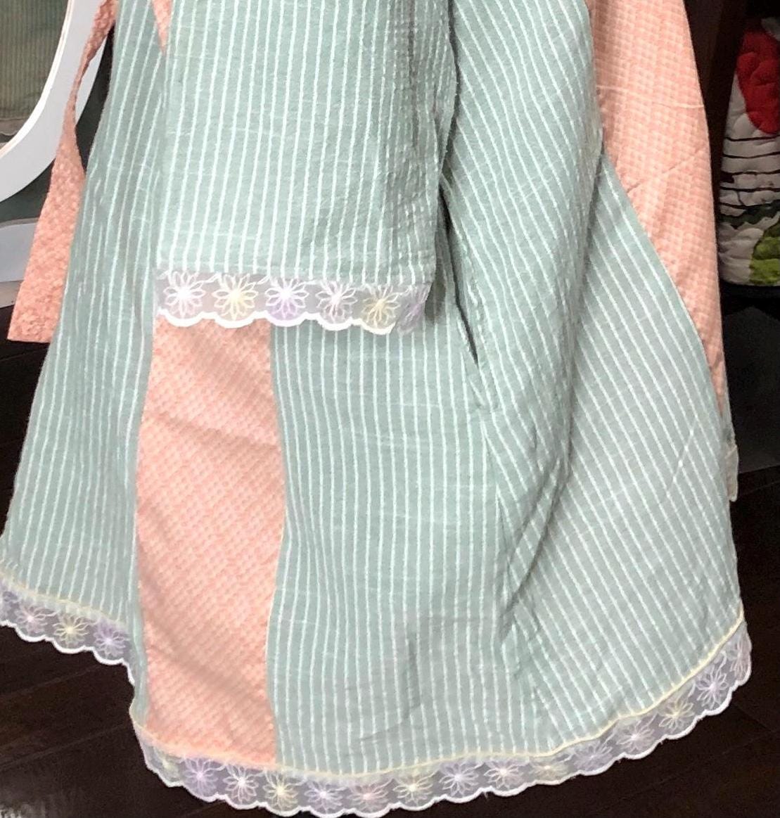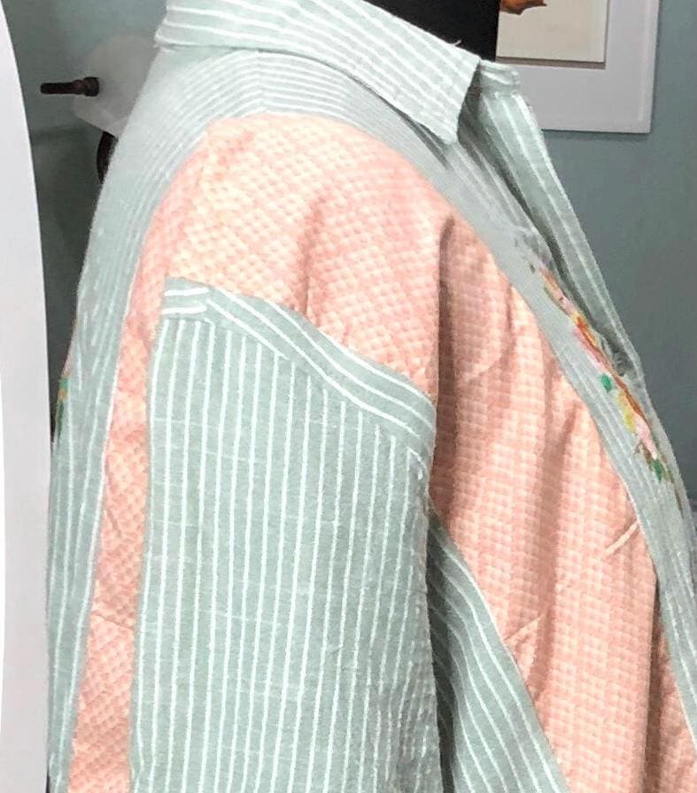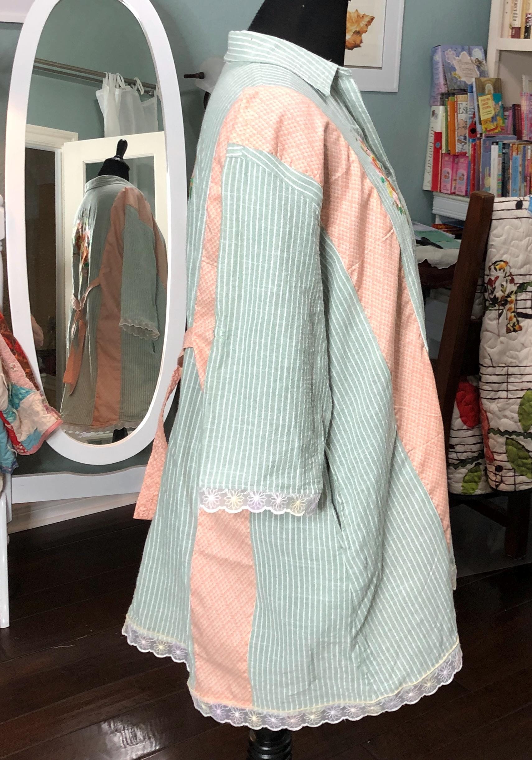 This one of a kind upcycled button front tunic top is extra special. The button front top is celery green with a light pin stripe cotton linen like frabric. The peach orange cotton stripe on front and back widens the top to a comfy 2X fit. The front and back are beautifully embroidered with flowers. The quarter sleeves and bottom are trimmed with vintage flower lace trim.