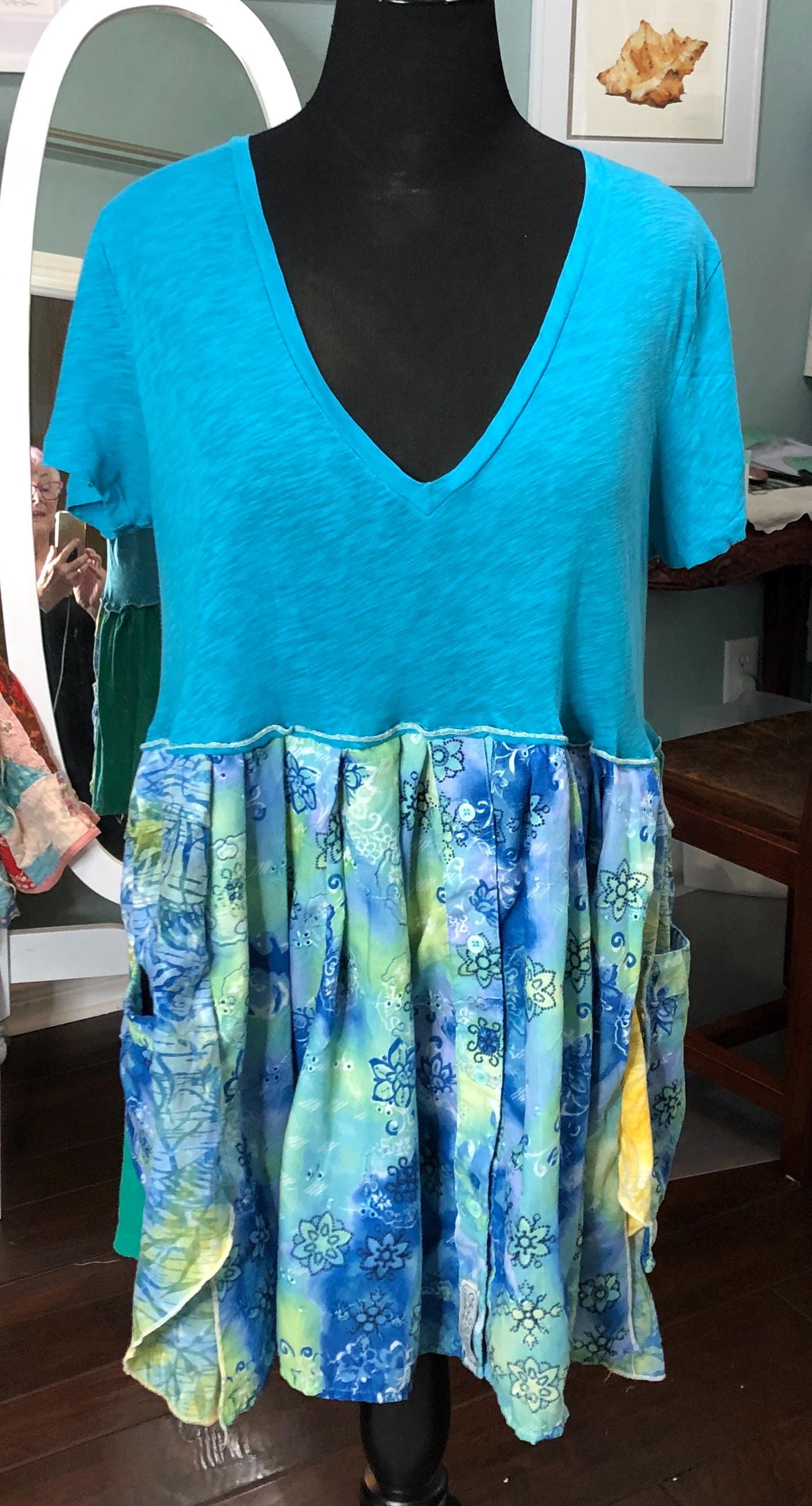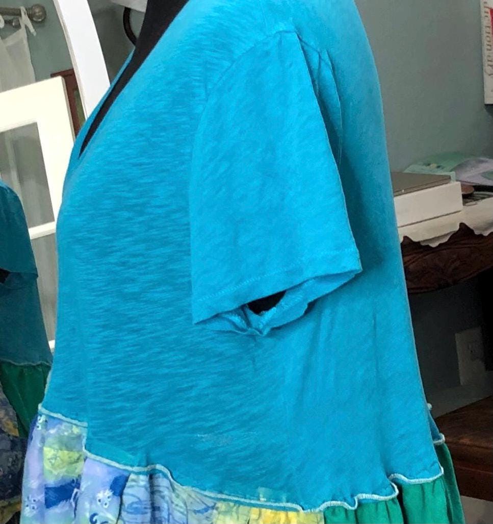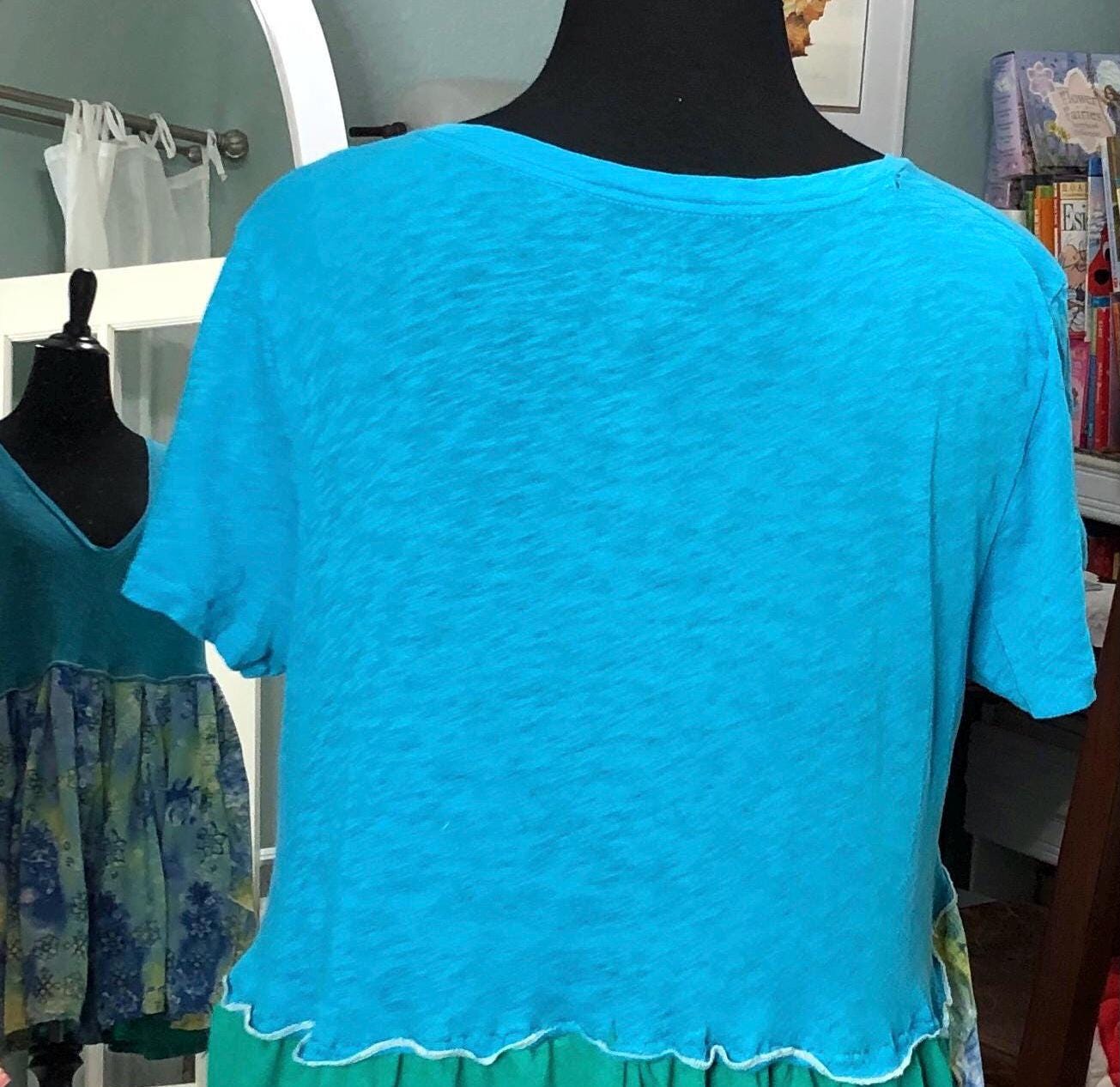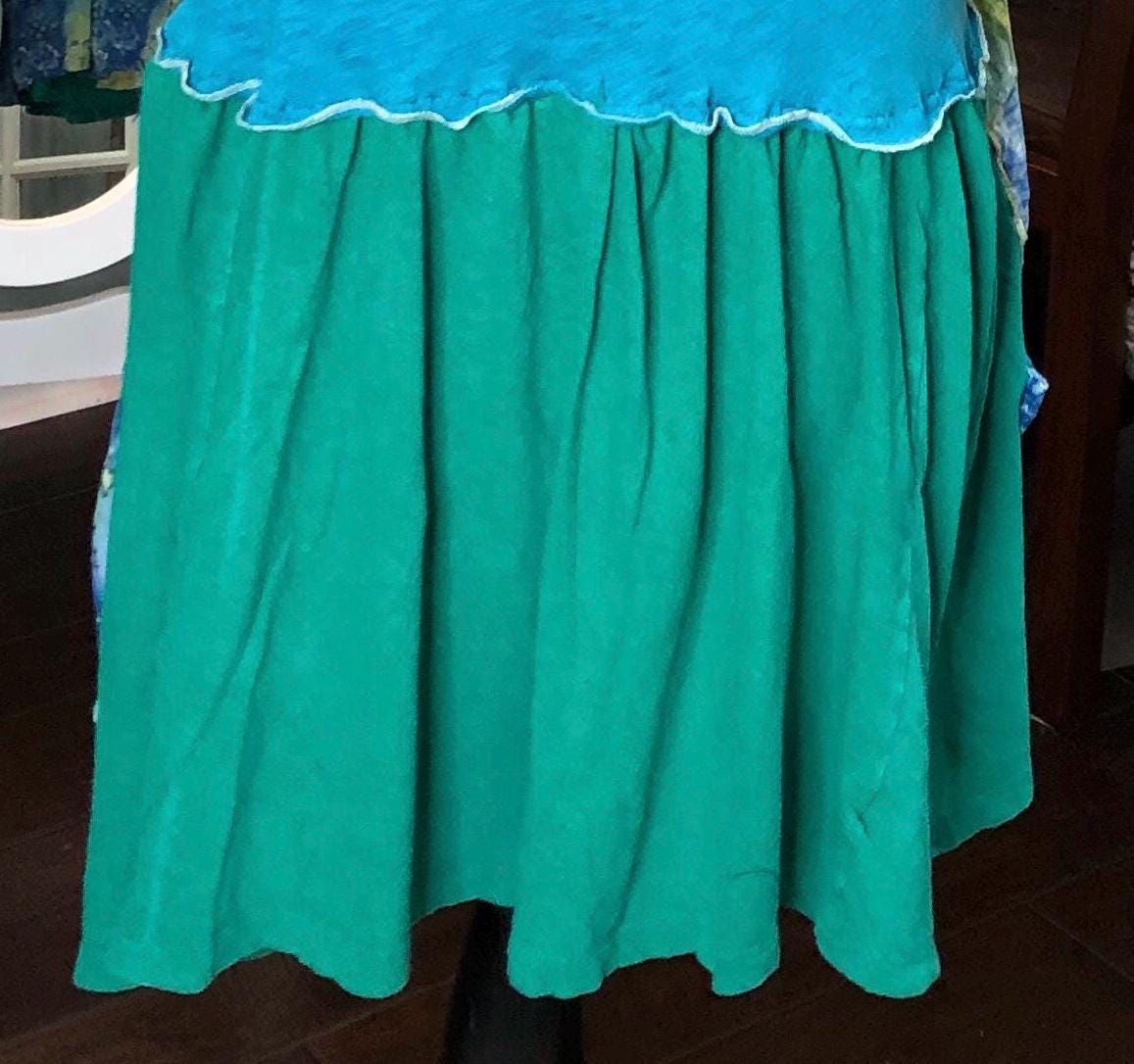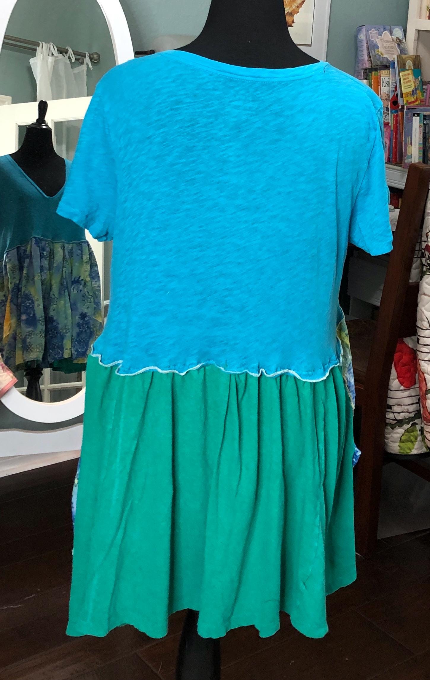 This easy fitting women's tee shirt tunic is a soft aqua green mix of tee shirts and print cotton with darker aqua green cotton tee sides with on the back. The aqua flowered cotton graphic button front skirt married with the soft cotton tee shirts is the perfect combination.
