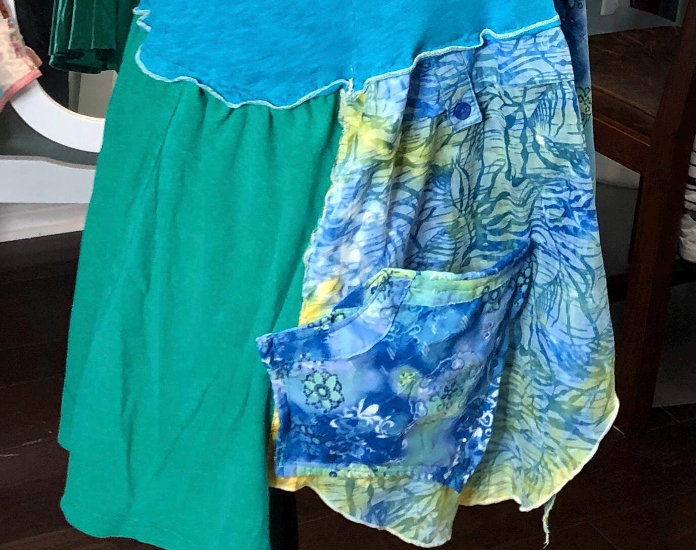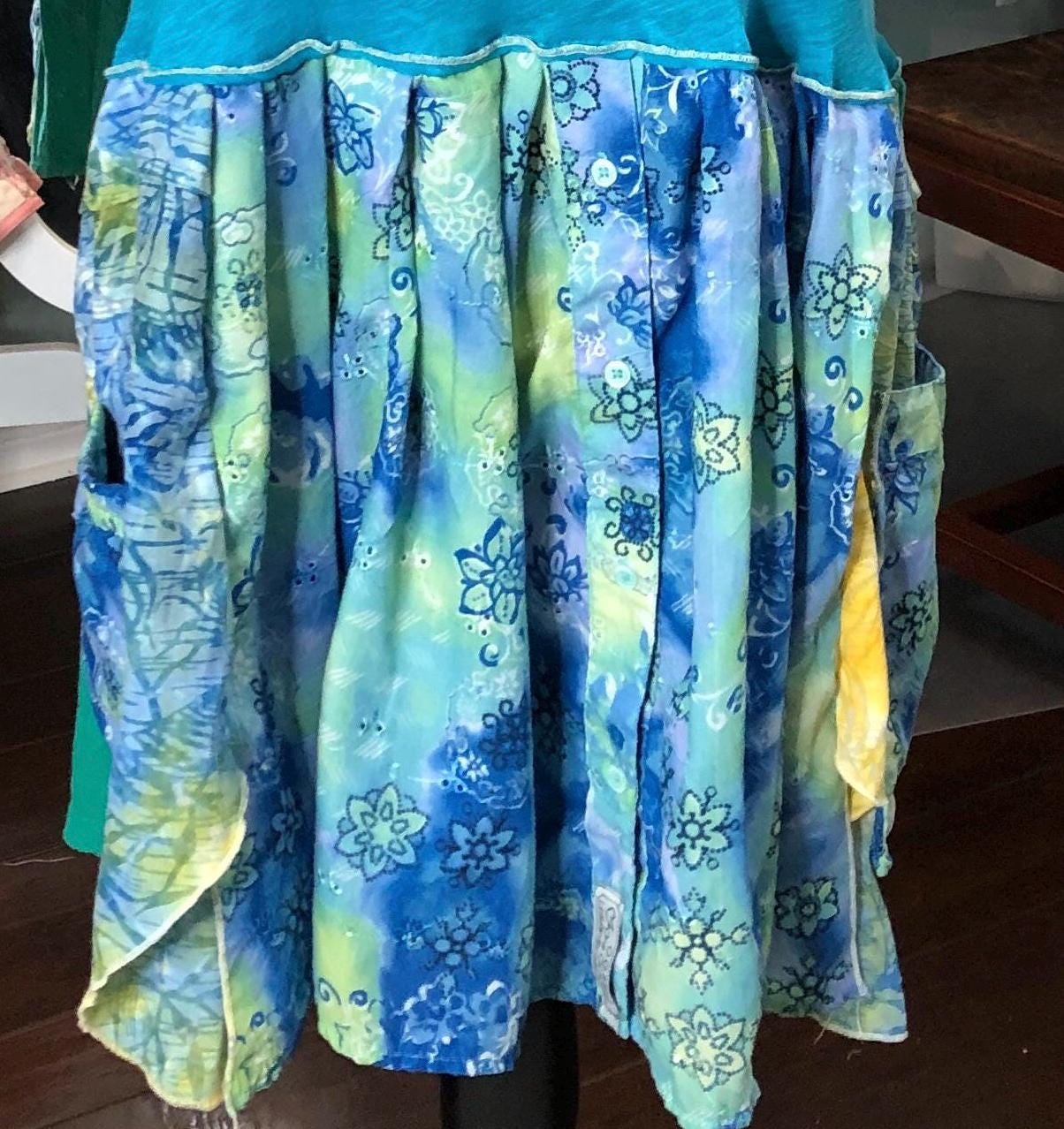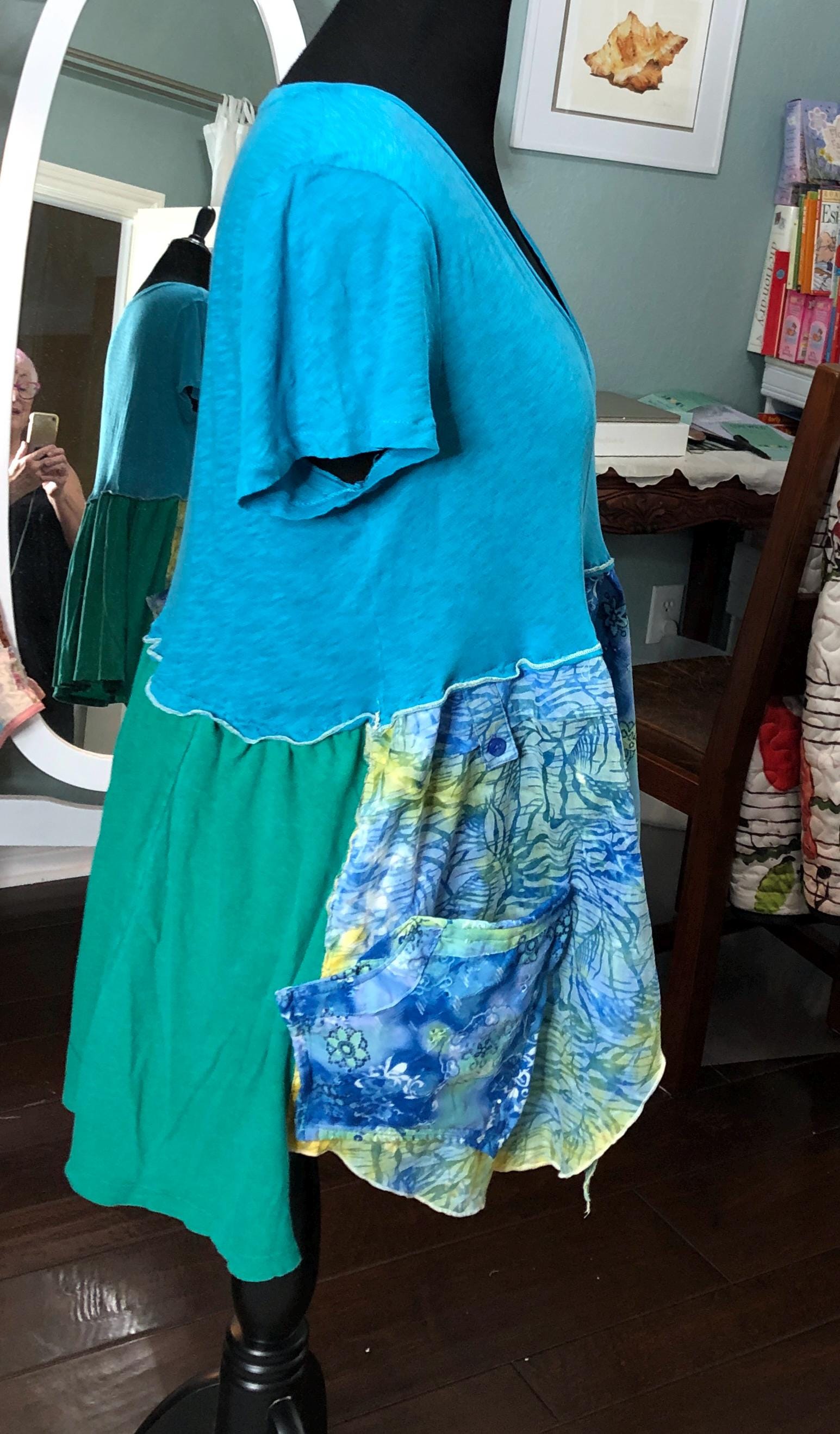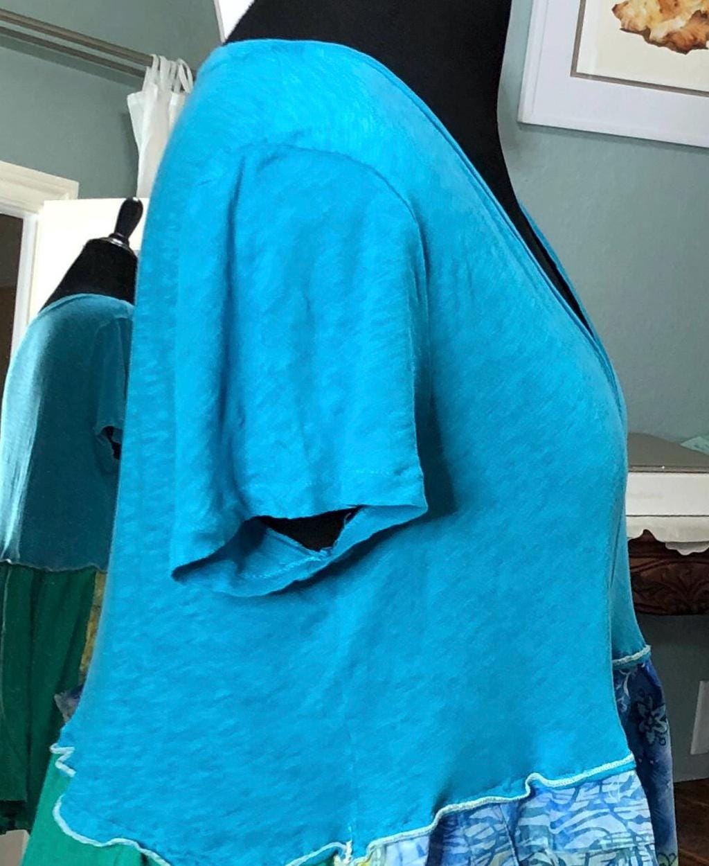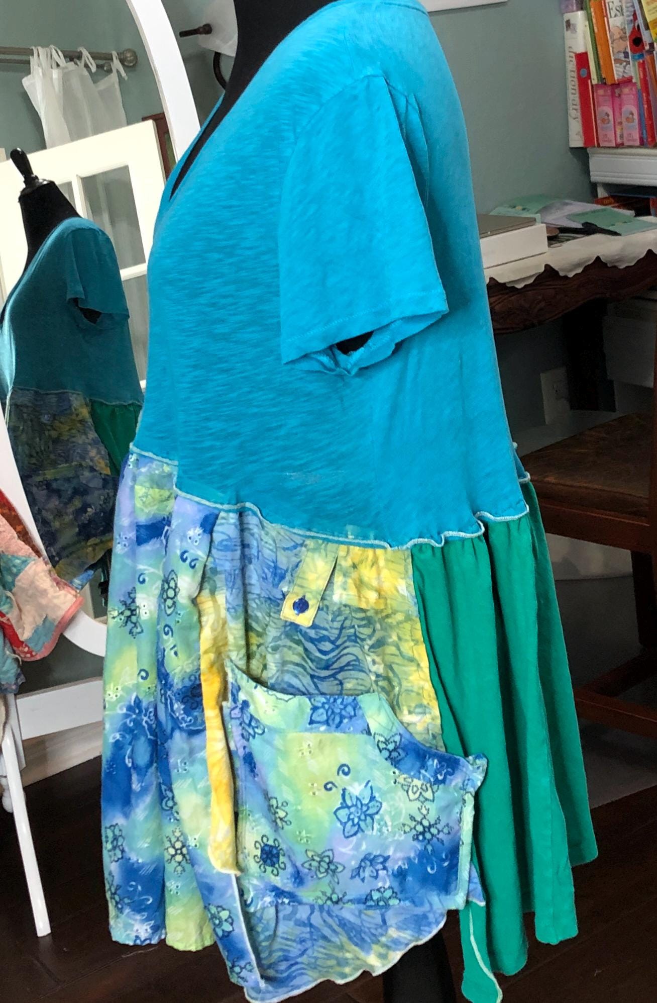This easy fitting women's tee shirt tunic is a soft aqua green mix of tee shirts and print cotton with darker aqua green cotton tee sides with on the back. The aqua flowered cotton graphic button front skirt married with the soft cotton tee shirts is the perfect combination.