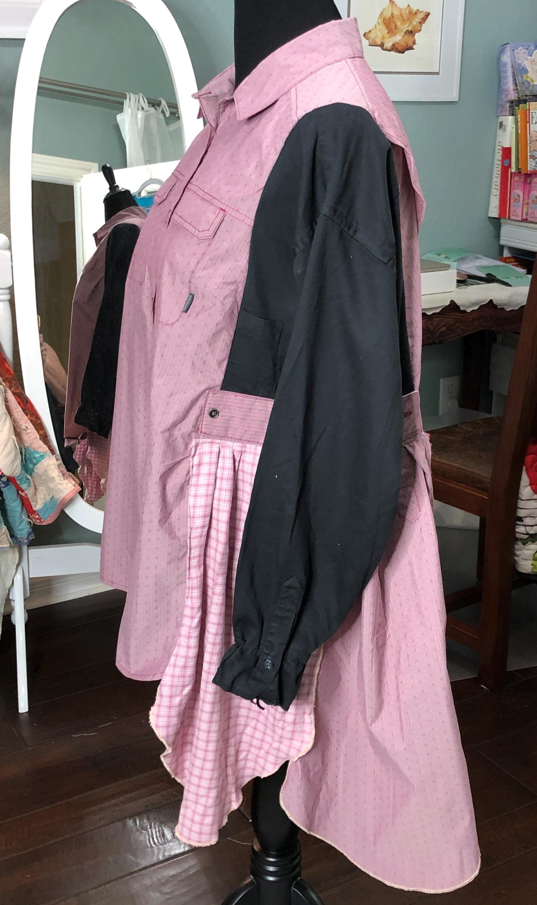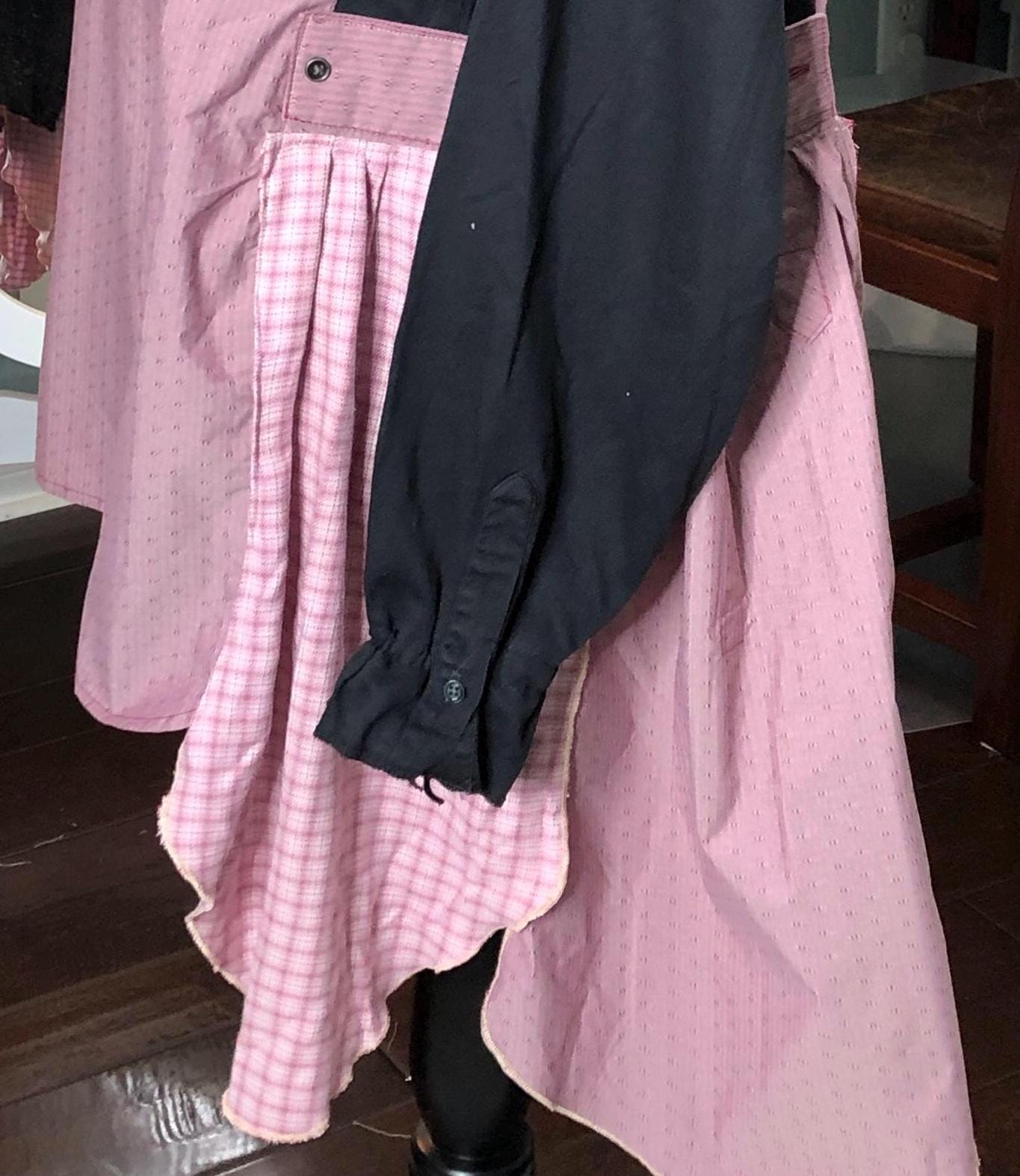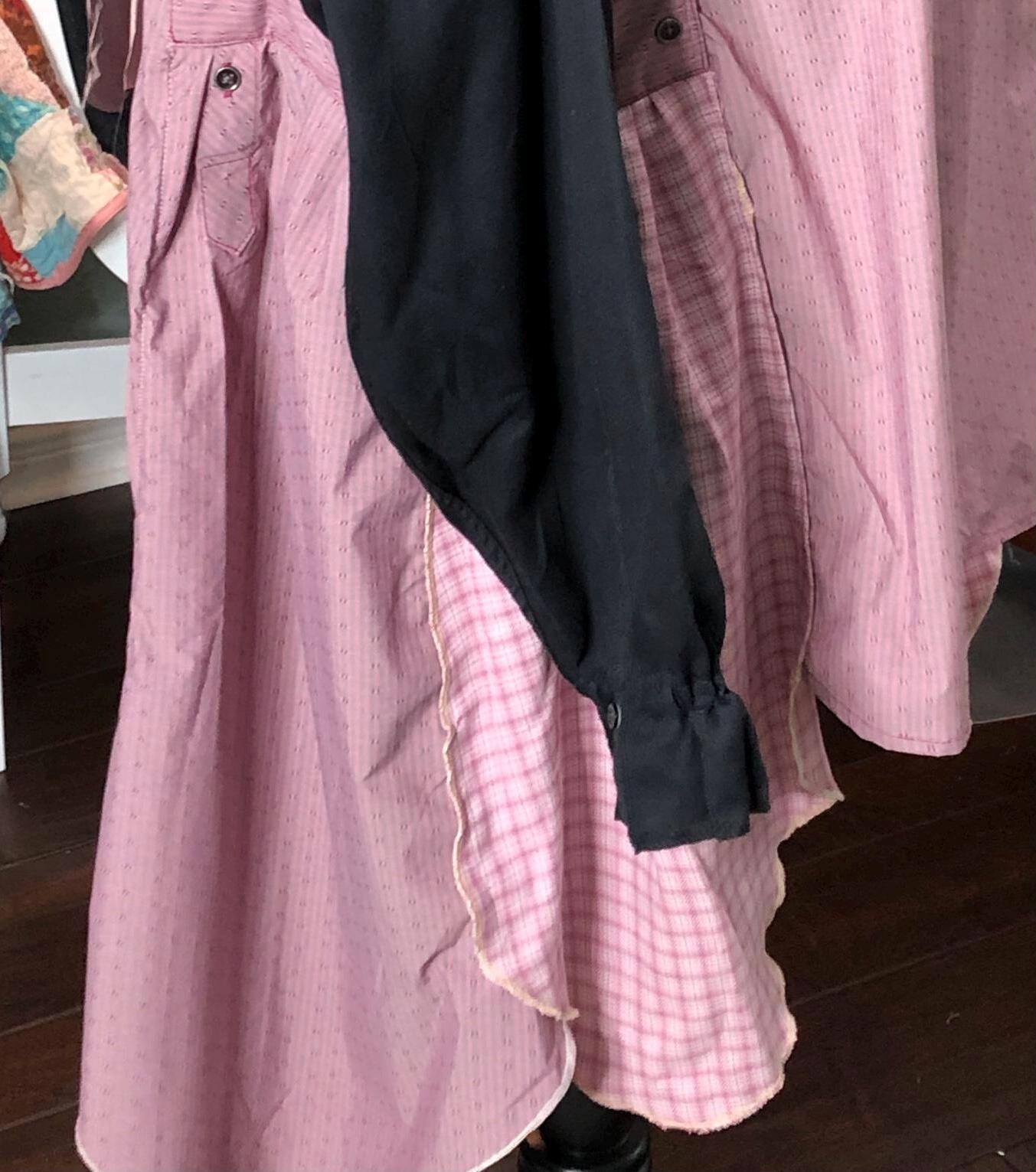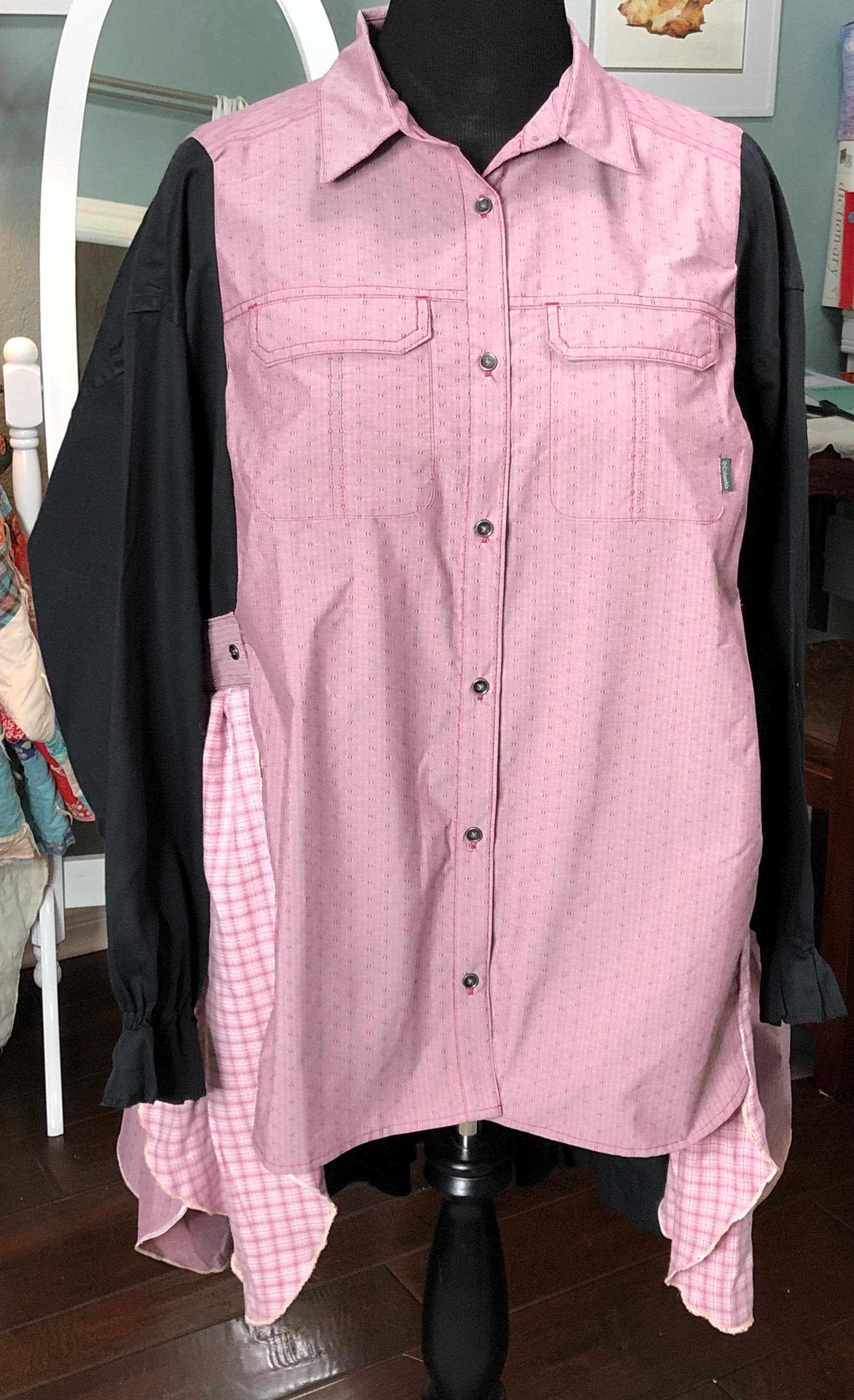 This one of a kind upcycled button front tunic top is extra special. The bodice in an outdoor fabric in a pink mauve color with black cotton sleeves. the sleeves have an elastic edge ruffle that can be adjusted to push up. There are also two breast pockets. The gathered sides are fashioned from mauve and pink check sleeves. This style is figure flattering and comfortable. The addition of the black back ruffle makes this a dress length tunic.