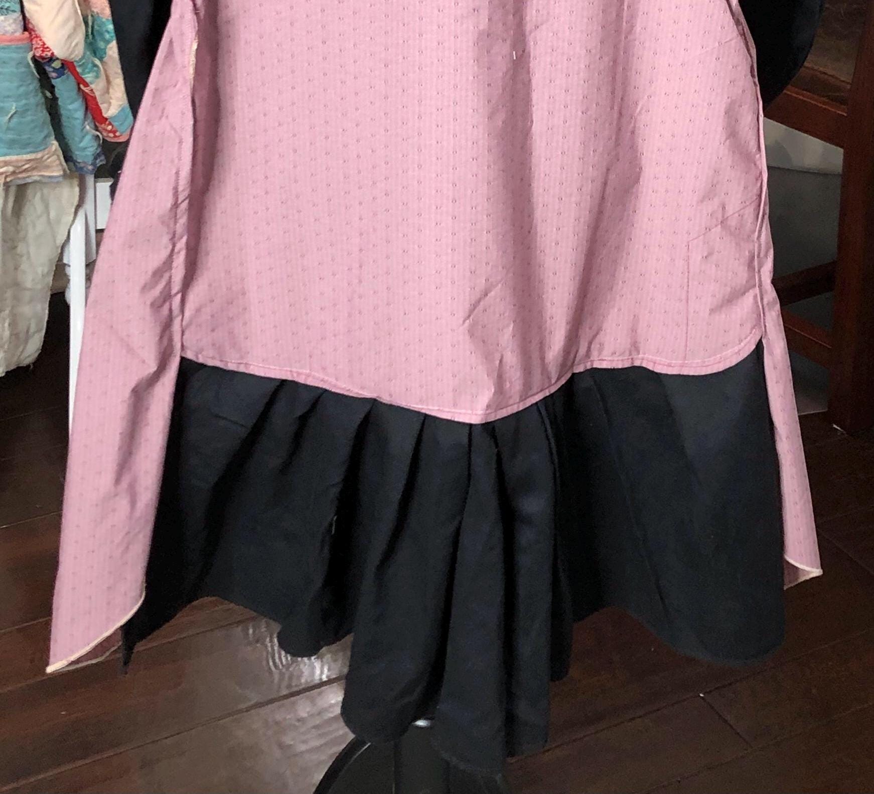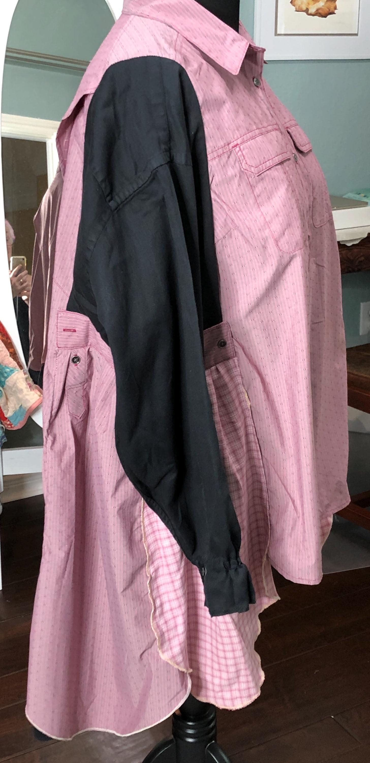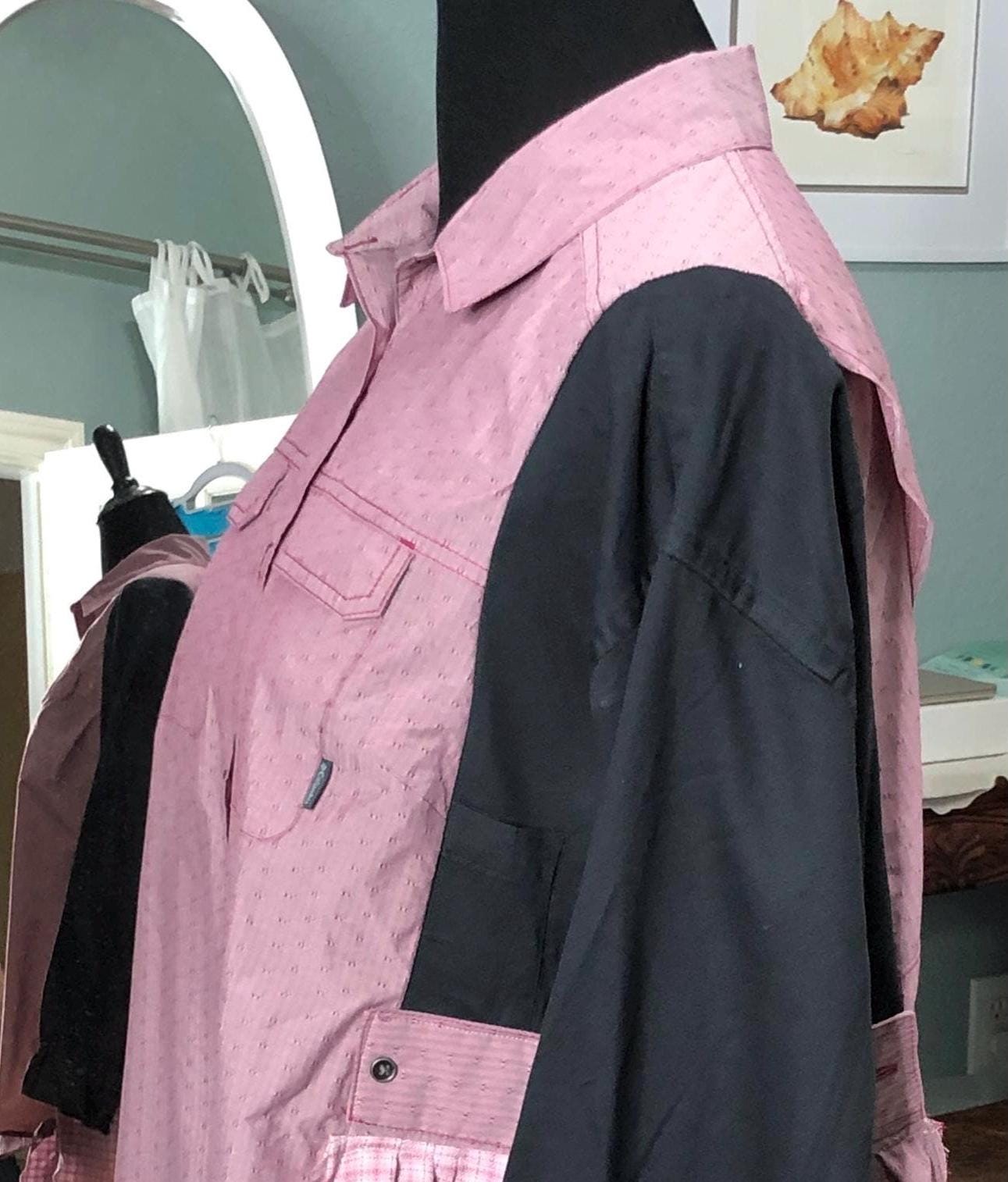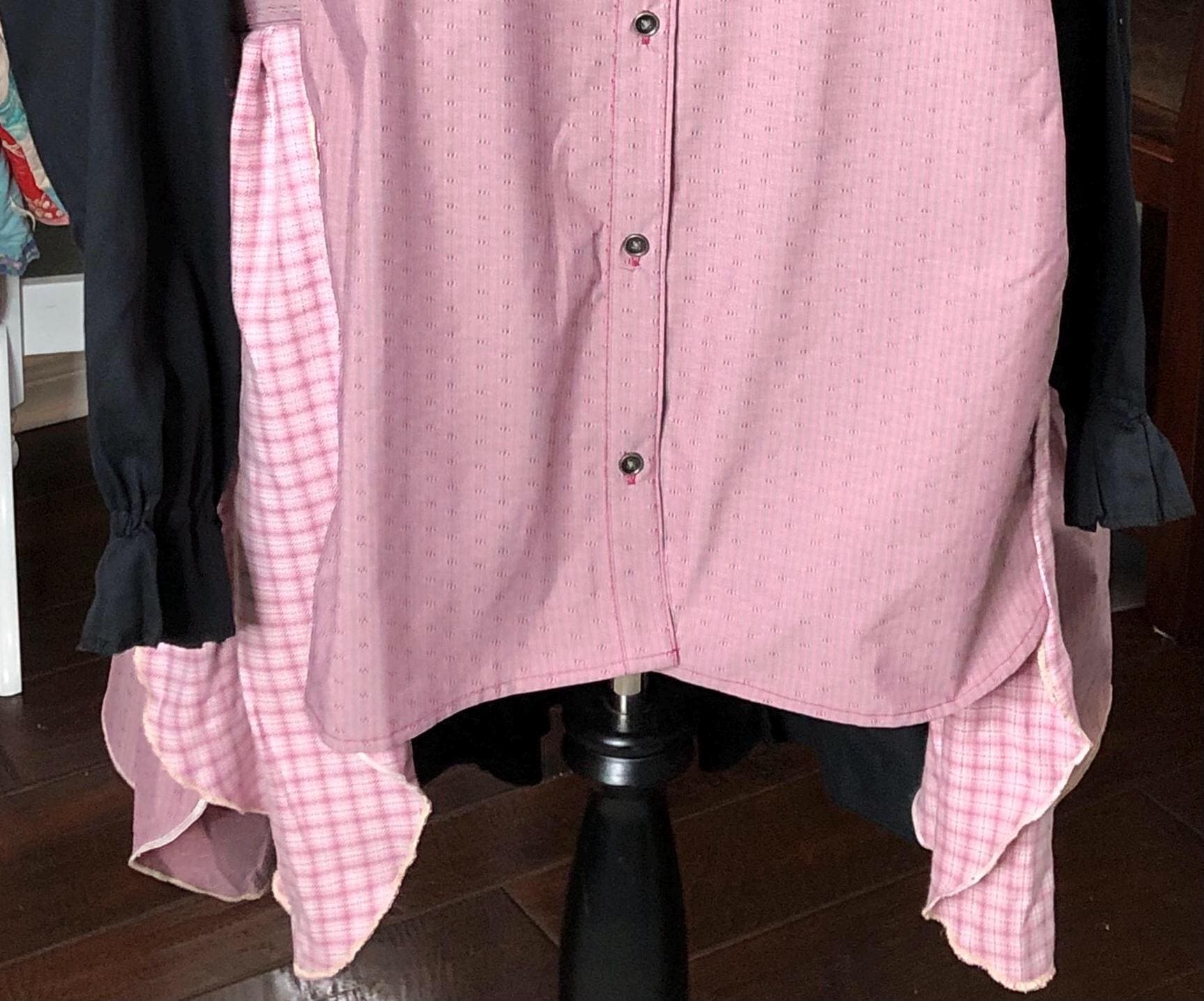 This one of a kind upcycled button front tunic top is extra special. The bodice in an outdoor fabric in a pink mauve color with black cotton sleeves. the sleeves have an elastic edge ruffle that can be adjusted to push up. There are also two breast pockets. The gathered sides are fashioned from mauve and pink check sleeves. This style is figure flattering and comfortable. The addition of the black back ruffle makes this a dress length tunic.