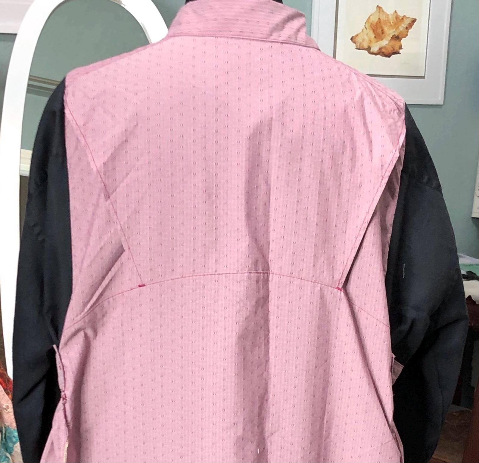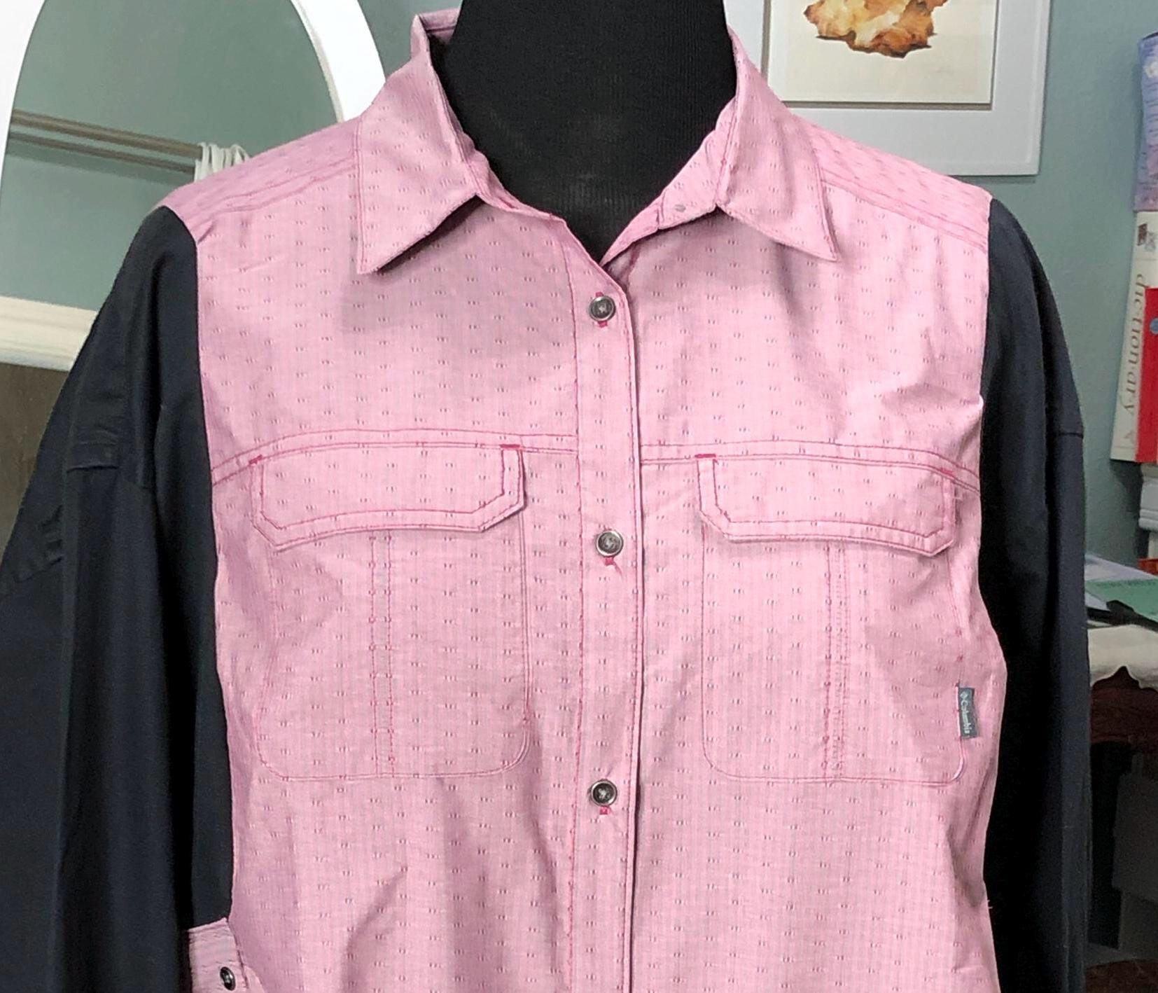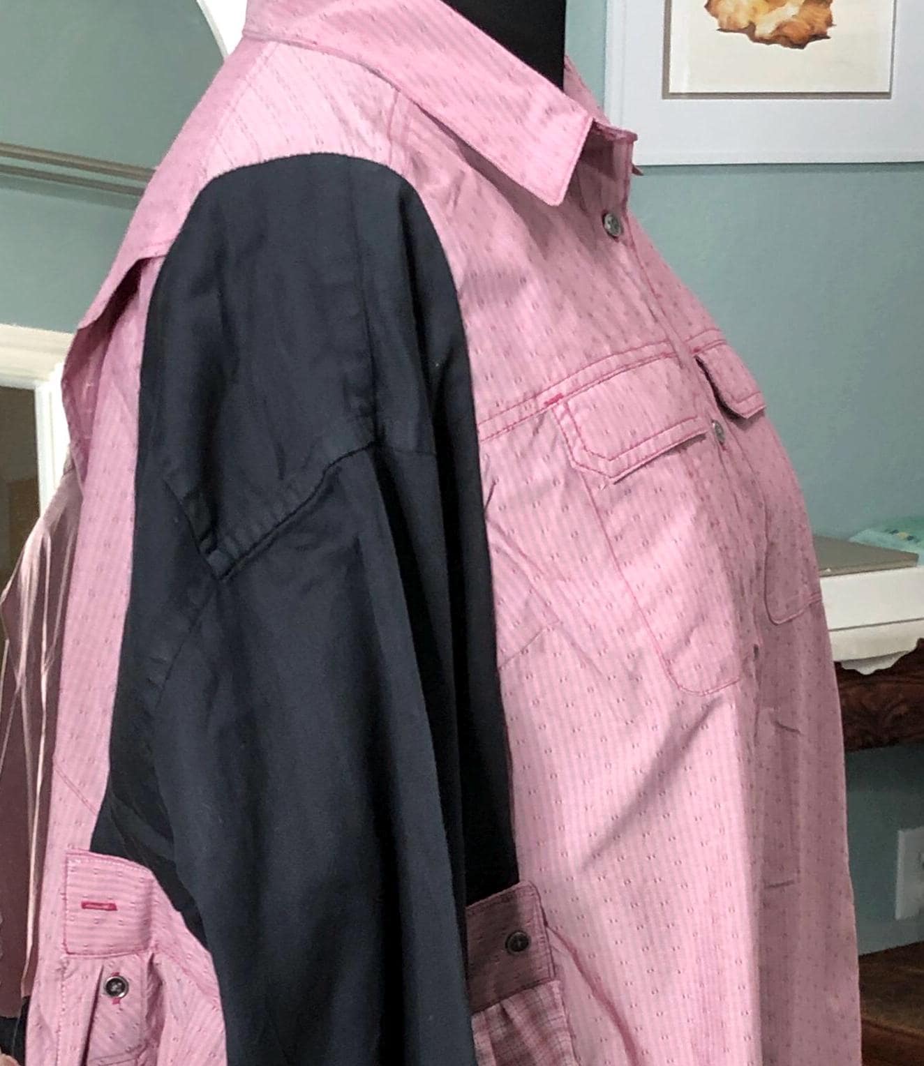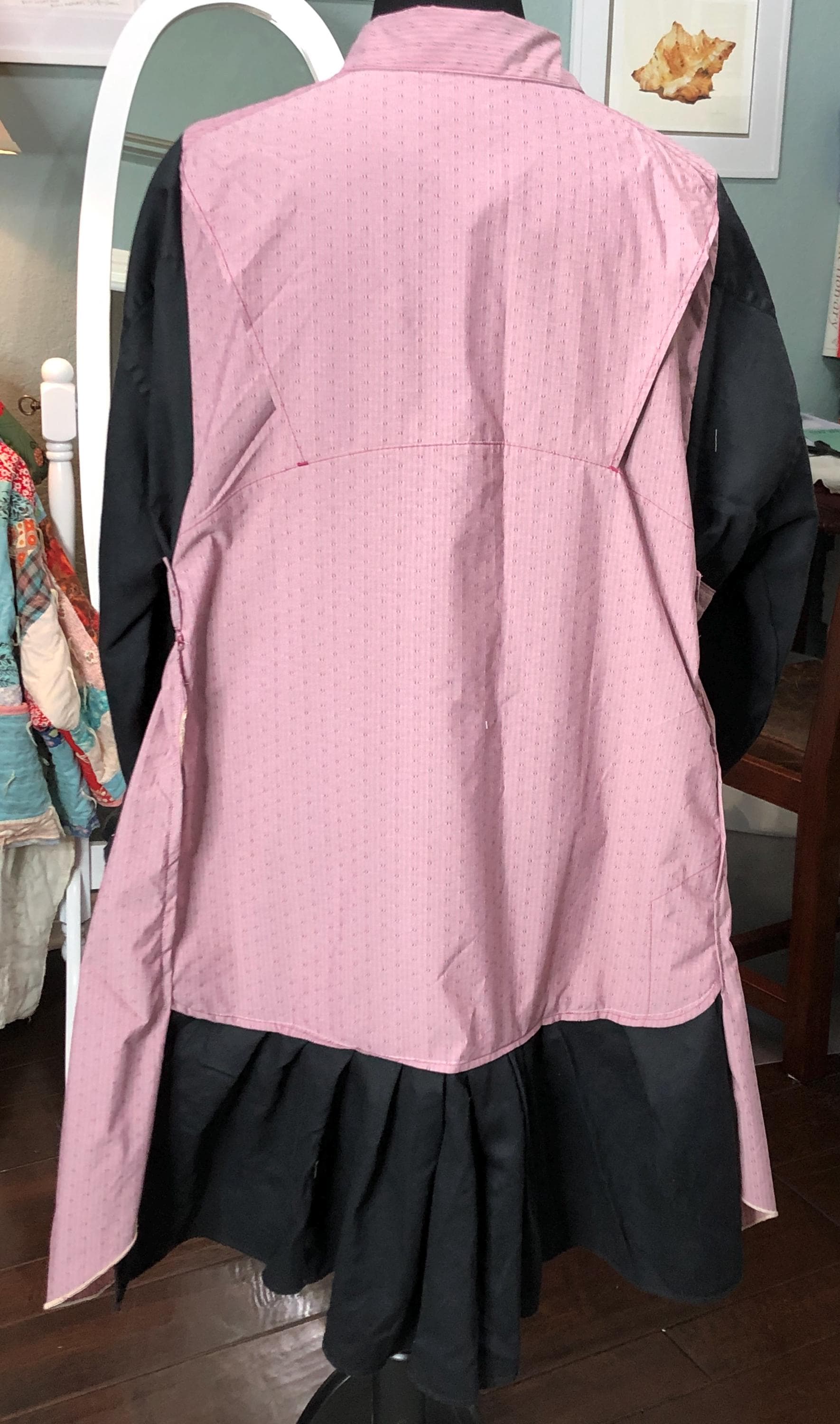This one of a kind upcycled button front tunic top is extra special. The bodice in an outdoor fabric in a pink mauve color with black cotton sleeves. the sleeves have an elastic edge ruffle that can be adjusted to push up. There are also two breast pockets. The gathered sides are fashioned from mauve and pink check sleeves. This style is figure flattering and comfortable. The addition of the black back ruffle makes this a dress length tunic.