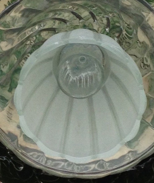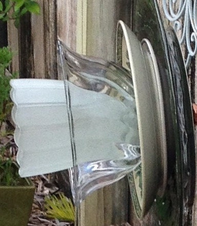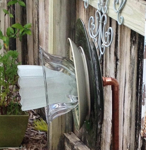 There are six layers to this flower. The base is a round deep forest green ceramic plate beautiful in its own right with Oak leaves imprinted on the edges. This base is topped with small white ceramic plate with gold edging and gen this is topped with a vintage ceramic reproduction plate that has early Americana scenes printed on the creamy tan background. Atop this plate is a fluted clear glass bowl. Inside this bowl is a frosted glass light globe and inside this globe is small clear heavy shot glass that takes the shape of the flowers stamen. Each individual piece adds to the beauty of the entire creation.