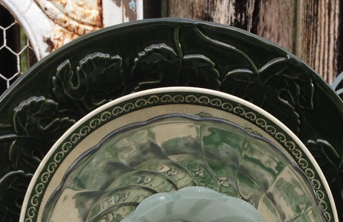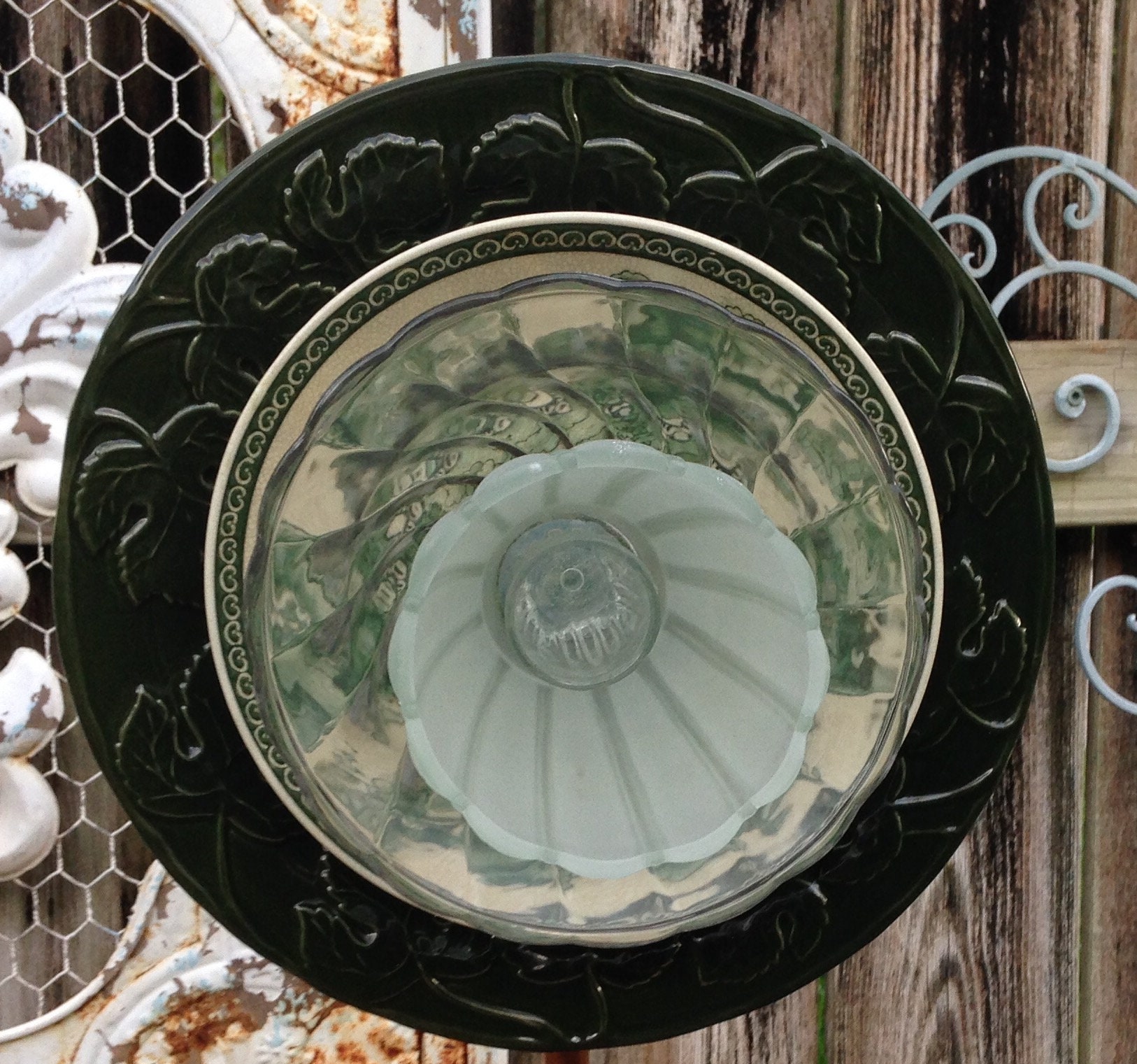 Yard Art Glass Flowers repurposed plates vintage reproduction plate forest green porcelain plate flower garden art shabby chic yard art