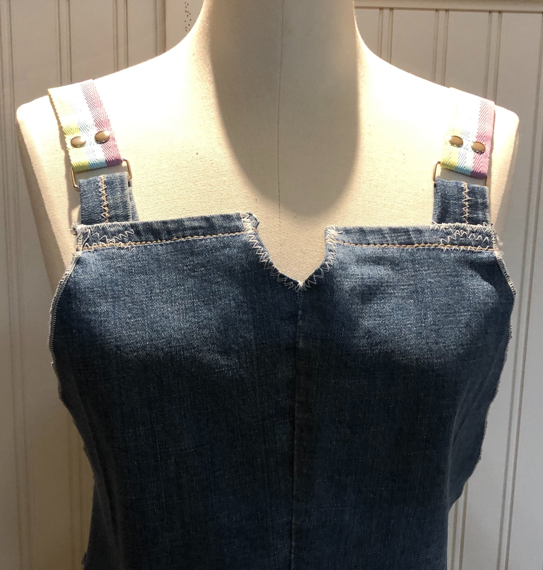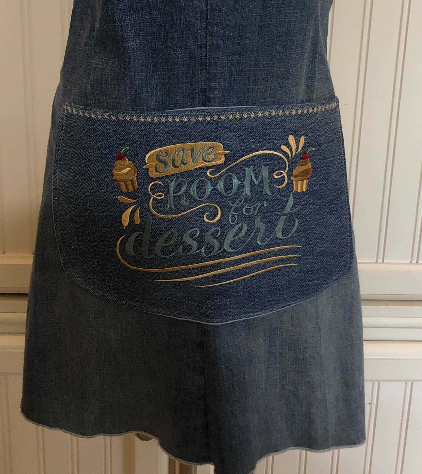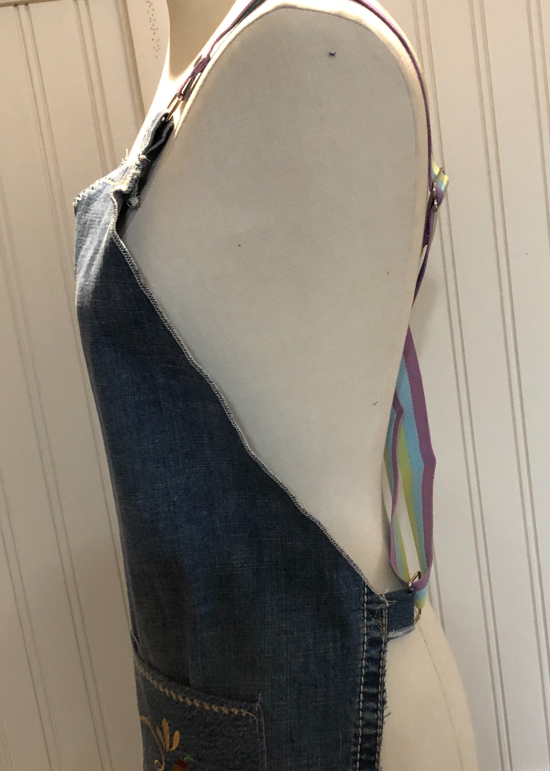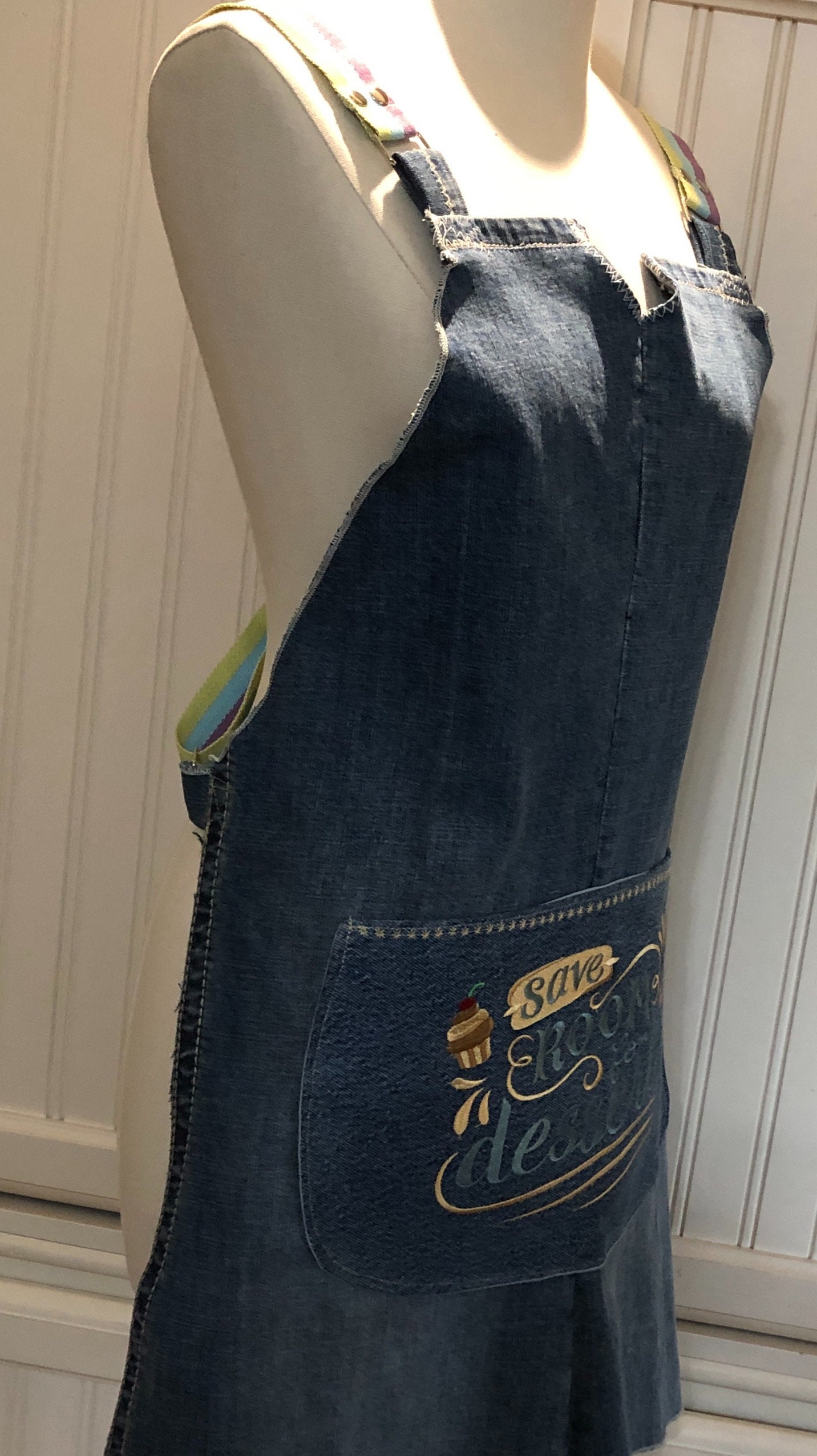 This beautiful denim apron is made from repurposed women's blue jeans. There is a large embroidered pocket with save room for dessert. There are no ties but instead there are cross back adjustable straps and the apron shape make it possible for this to fit comfortably from S to L. Slip it over your head to wear it with your tights and a sports bra as a comfortable dress or pop it over your clothes for a full coverage apron.