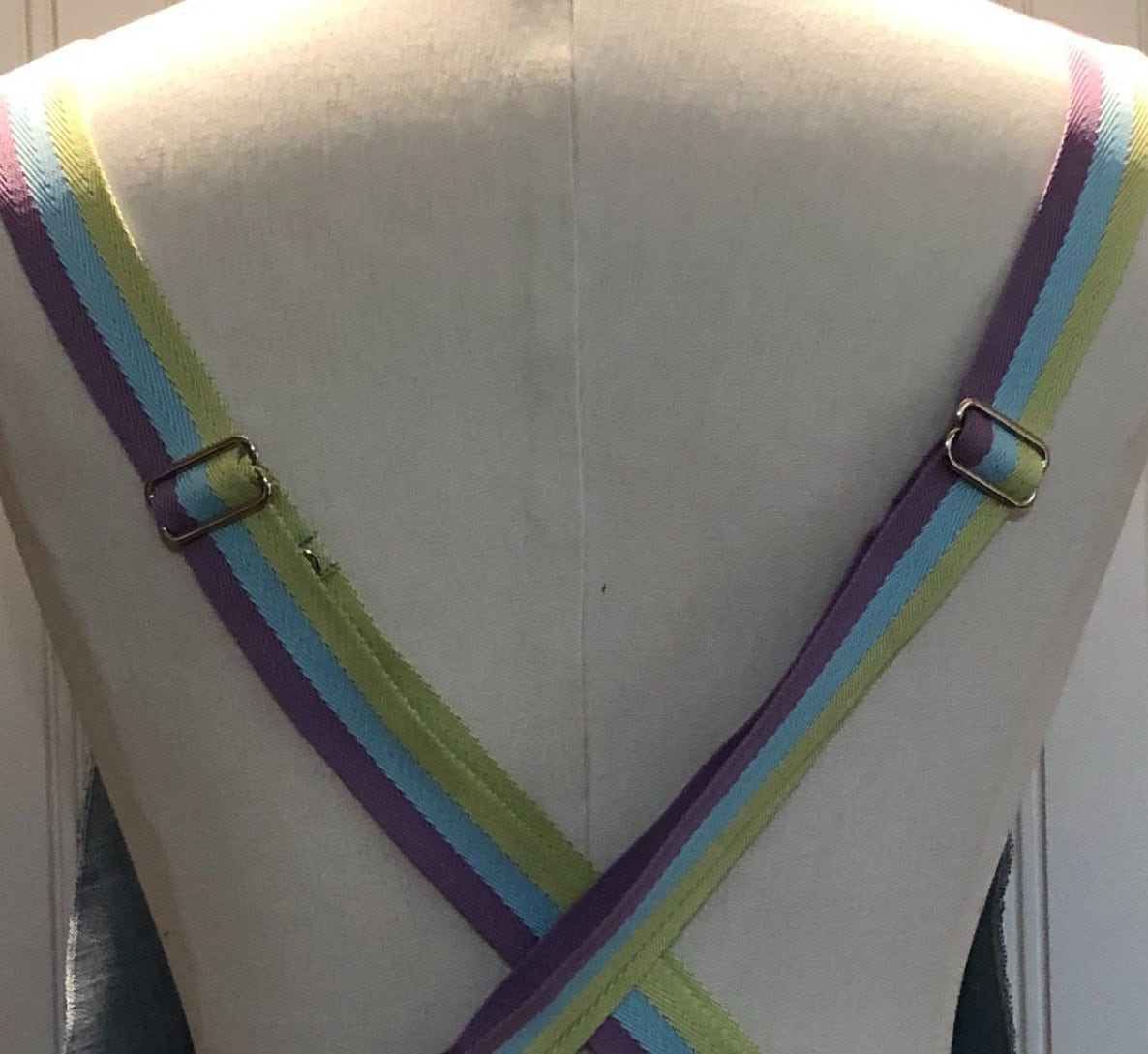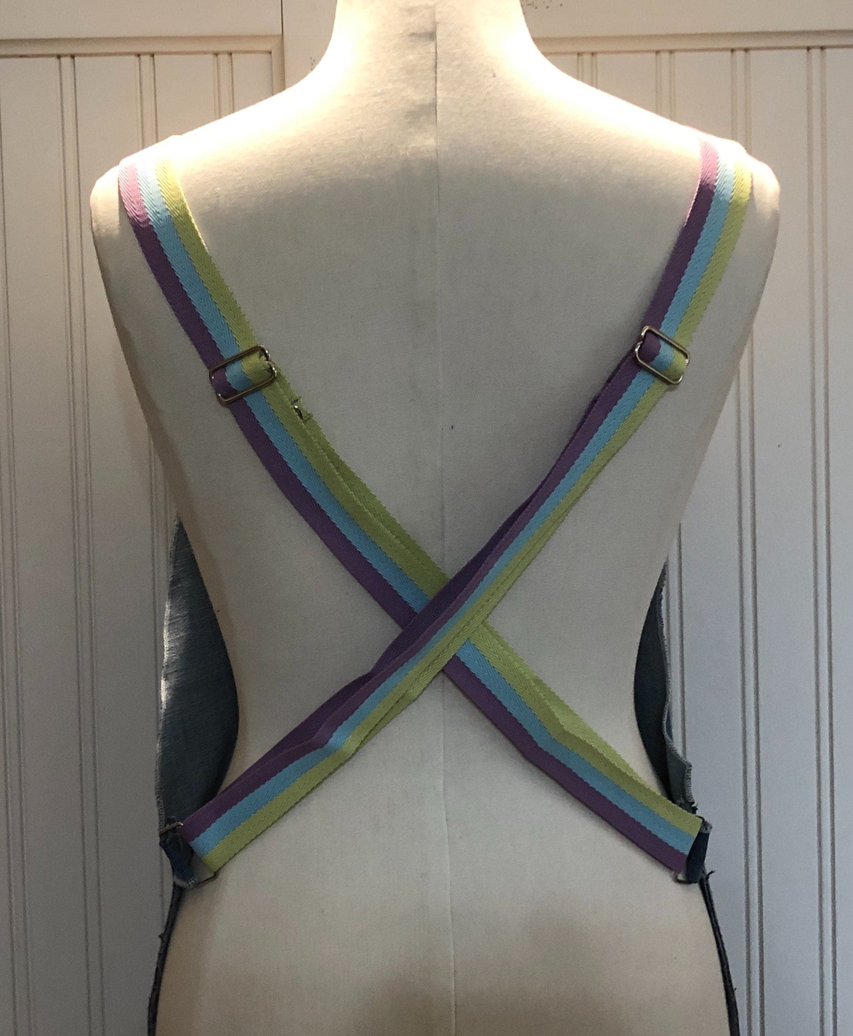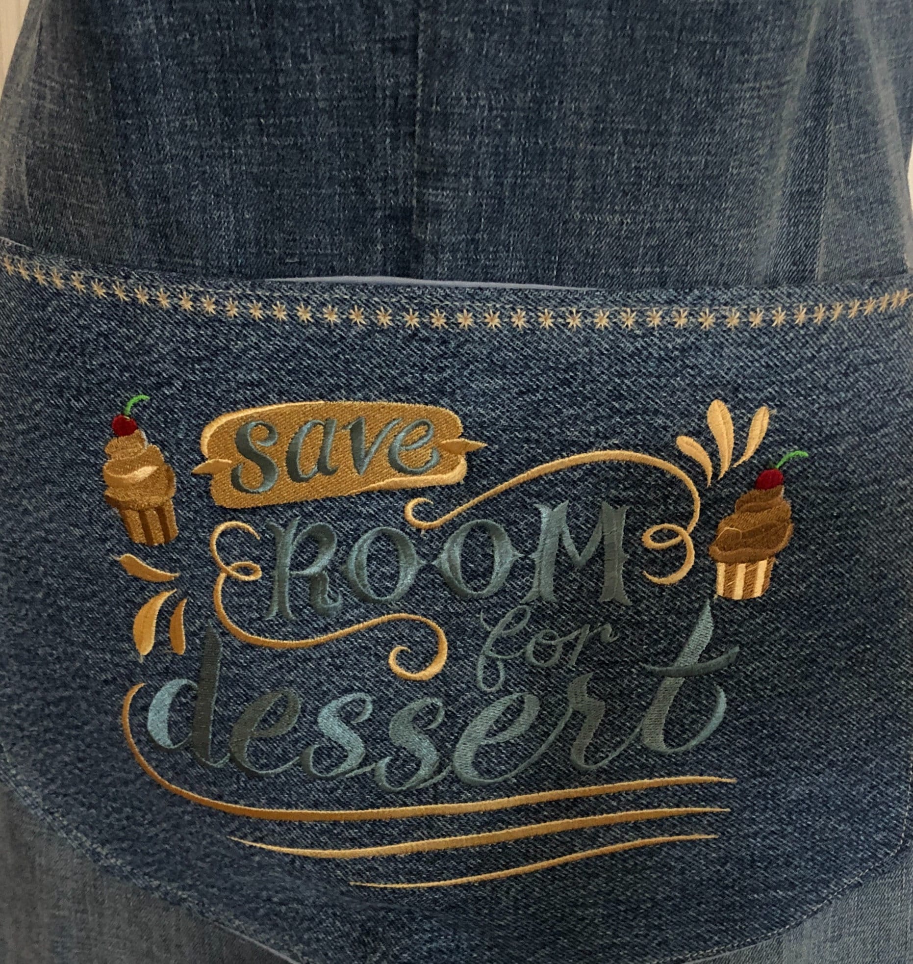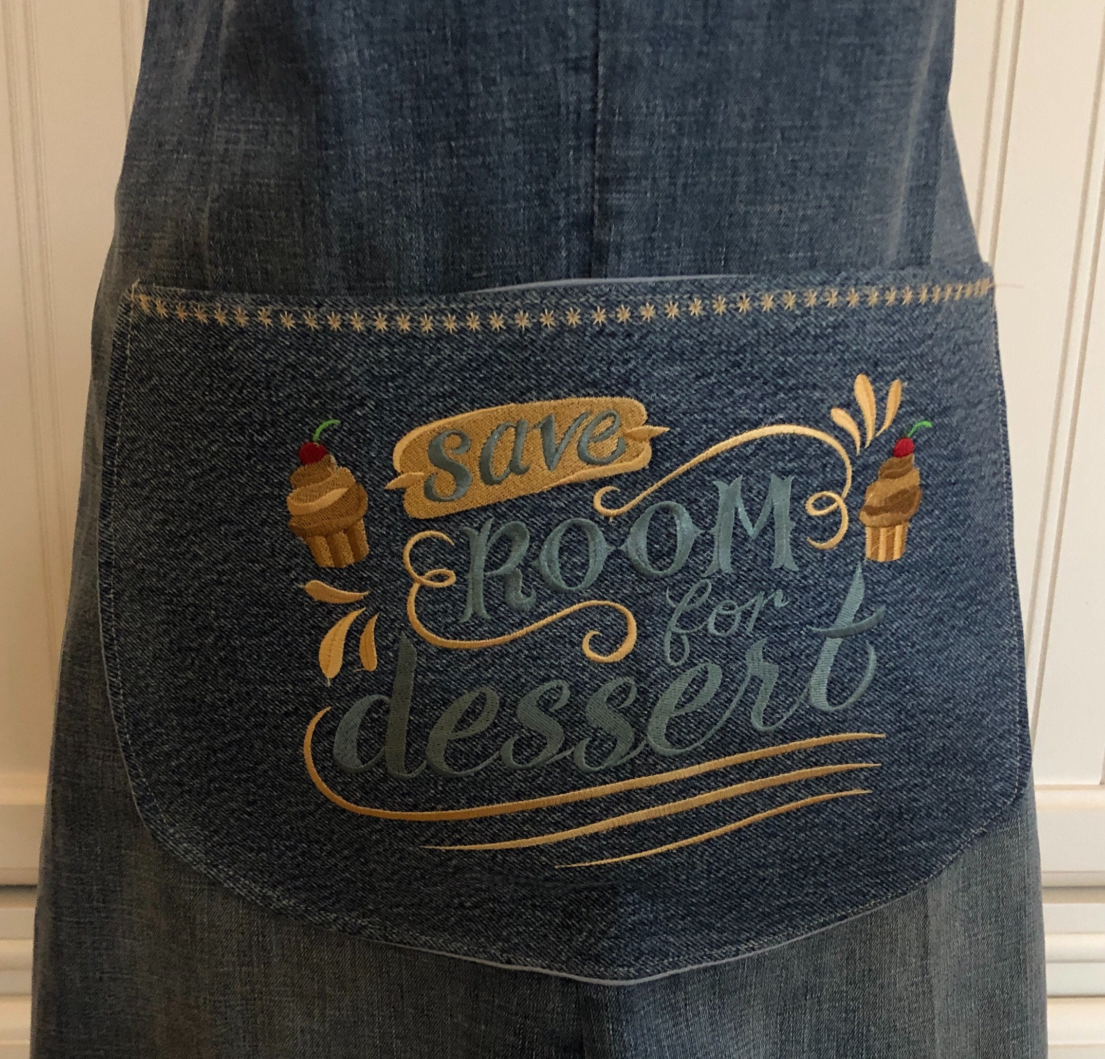 This beautiful denim apron is made from repurposed women's blue jeans. There is a large embroidered pocket with save room for dessert. There are no ties but instead there are cross back adjustable straps and the apron shape make it possible for this to fit comfortably from S to L. Slip it over your head to wear it with your tights and a sports bra as a comfortable dress or pop it over your clothes for a full coverage apron.