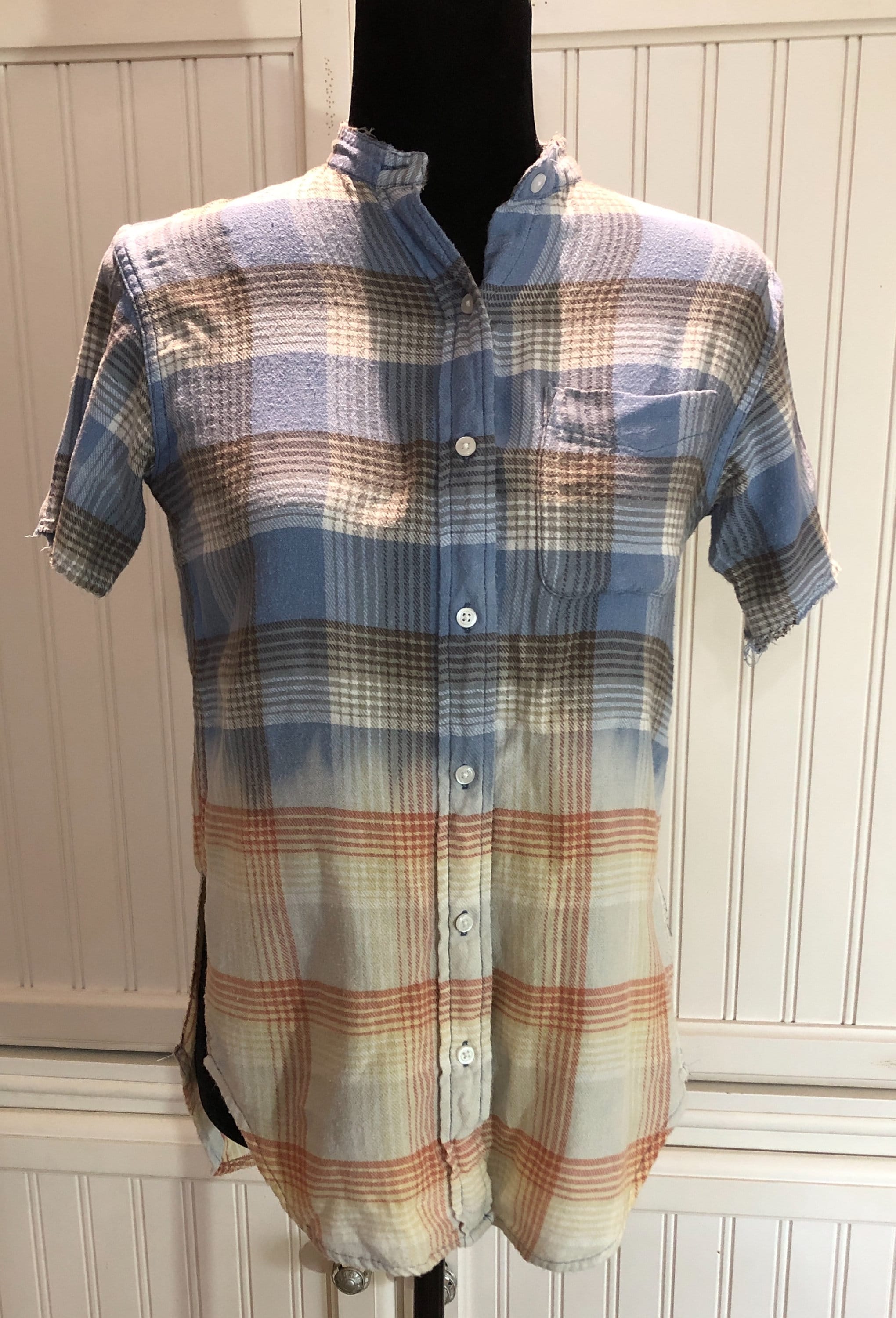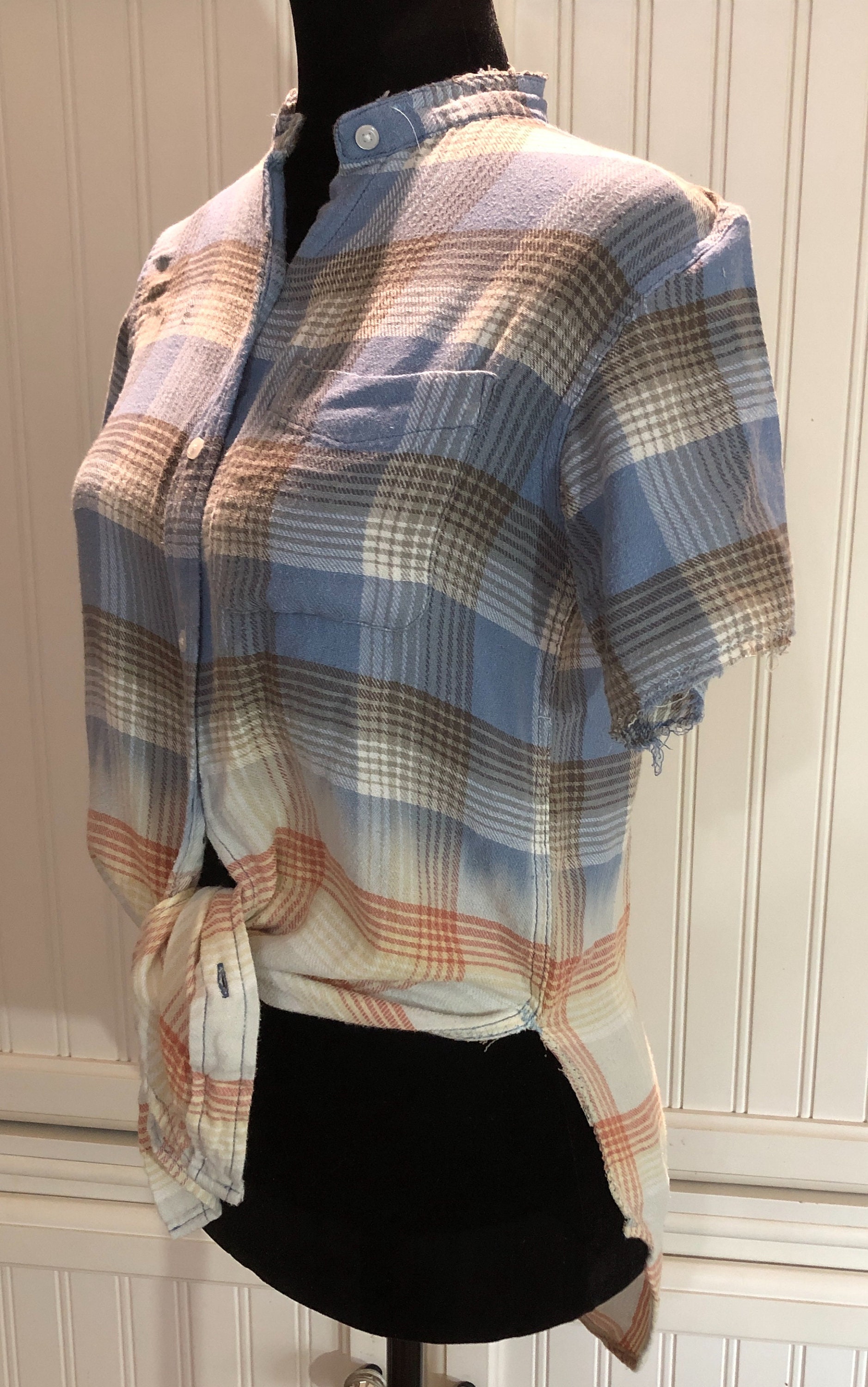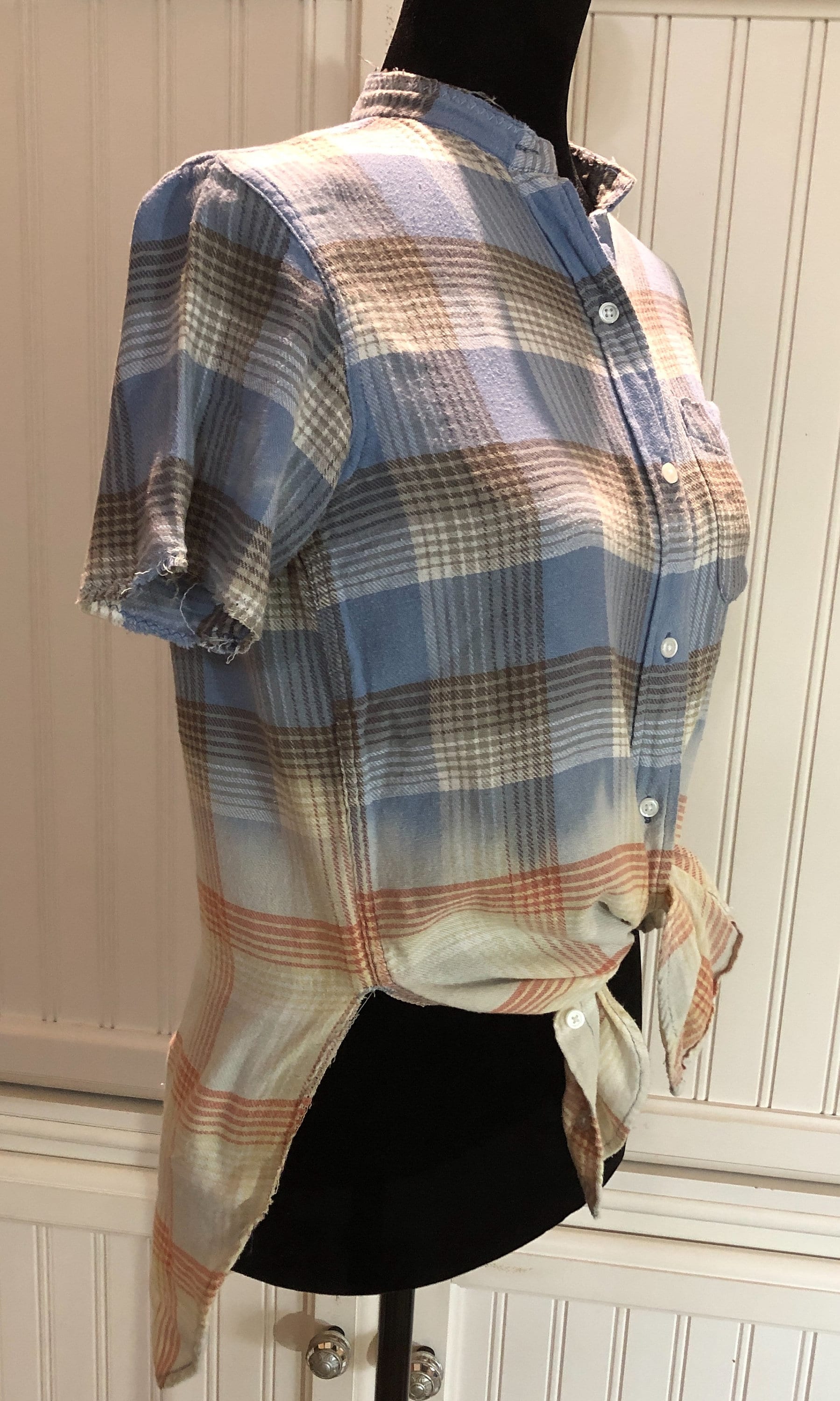 This easy fitting women's Light blue plaid light flannel shirt is perfect for wearing with jeans or over tights. The shirt has been gently bleach faded for an orange and cream ombré effect. The back has a printed fabric picture of the beach and sunglasses with the words “I was made fir sunny days.” The sleeves have been remade into a Half short sleeve with frayed shabby chic edges. The sides have been split so that you can wear comfortable three ways, down, half tucked in or ties as pictured. The collar is remade into the mandarin band style and has also been frayed to match the frayed sleeves.